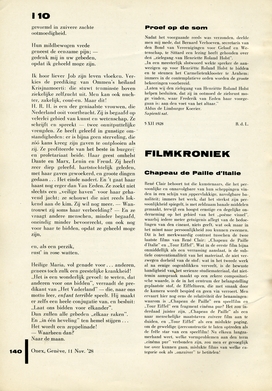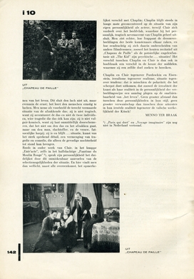 René Clair behoort tot die kunstenaars, die het persoonlijke en onnavolgbare van hun scheppingen vinden in een schijn van oppervlakkige, navolgbare banaliteit; ïmmers het werk, dat het sterkst zijn persoonlijkheid spiegelt, is met zeldzaam banale middelen gemaakt, terwijl een hoogst ernstige en degelijke onderneming op het gebied van het ‘poème visuel’, waarbij iedere meter getuigenis aflegt van de bedoelingen van den cineast, niets geeft, wat ook maar in het minst naar persoonlijkheid zou kunnen zweemen. Dit is het merkwaardig contrast tusschen de twee laatste films van René Clair: ‘Chapeau de Paille d'Italie’ en ‘Tour Eiffel’. Wat in de eerste film bijna onmiddellijk als een verrassing aanslaat, is de subtiele conventionaliteit van het materiaal, de niet verzwegen dorheid van de stof; wat in het tweede werk al na eenige oogenblikken verveelt, is de bewuste handigheid van het serieuze studiemateriaal, dat niettemin aanspraak maakt op een zekere compositorische waarde, is de in het centrum der belangstelling geplaatste stof, de Eiffeltoren, die met smaak door de kamera wordt bespied en geen vin verroert. Men ervaart hier nog eens de relativiteit der benamingen: waarom is ‘Chapeau de Paille’ een speelfilm en ‘Tour Eiffel’ een fragment cinéma pur? Het zou inderdaad juister zijn, ‘Chapeau de Paille’ als een naar menschelijke maatstaven zuivere film aan te duiden, en ‘Tour Eiffel’ als een mislukte poging, om de geweldige ijzerconstructie te laten optreden als de frêle star van een speelfilm! Nu elkeen langzamerhand weet, welke vormproblemen aan den term ‘cinéma pur’ verbonden zijn, zou men er gevoeglijk toe over kunnen gaan, mislukte films van welke categorie ook als ‘onzuiver’ te betitelen!