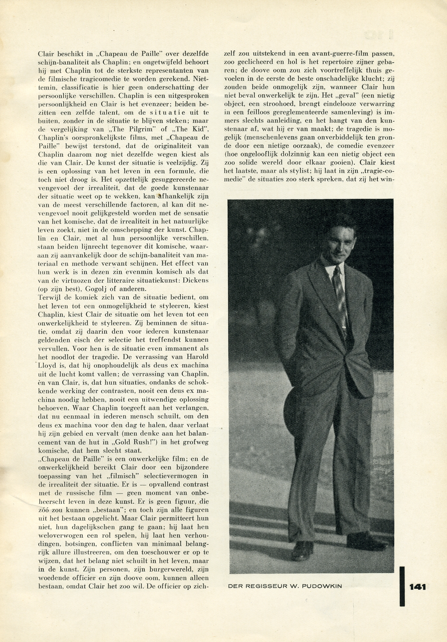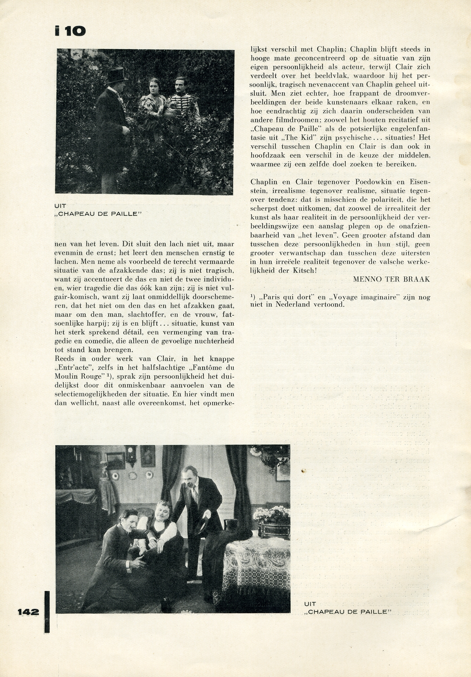 Clair beschikt in ‘Chapeau de Paille’ over dezelfde schijn-banaliteit als Chaplin; en ongetwijfeld behoort hij met Chaplin tot de sterkste representanten van de filmische tragicomedie te worden gerekend. Niettemin, classificatie is hier geen onderschatting der persoonlijke verschillen. Chaplin is een uitgesproken persoonlijkheid en Clair is het evenzeer; beiden bezitten een zelfde talent, om de situatie uit te buiten, zonder in de situatie te blijven steken; maar de vergelijking van ‘The Pilgrim’ of ‘The Kid’, Chaplin's oorspronkelijkste films, met ‘Chapeau de Paille’ bewijst terstond, dat de originaliteit van Chaplin daarom nog niet dezelfde wegen kiest als die van Clair. De kunst der situatie is veelzijdig. Zij is een oplossing van het leven in een formule, die toch niet droog is. Het opzettelijk gesuggereerde nevengevoel der irrealiteit, dat de goede kunstenaar der situatie weet op te wekken, kan afhankelijk zijn van de meest verschillende factoren, al kan dit nevengevoel nooit gelijkgesteld worden met de sensatie van het komische, dat de irrealiteit in het natuurlijke leven zoekt, niet in de omschepping der kunst. Chaplin en Clair, met al hun persoonlijke verschillen, staan beiden lijnrecht tegenover dit komische, waaraan zij aanvankelijk door de schijn-banaliteit van materiaal en methode verwant schijnen. Het effect van hun werk is in dezen zin evenmin komisch als dat van de virtuozen der litteraire situatiekunst: Dickens (op zijn best), Gogolj of anderen.