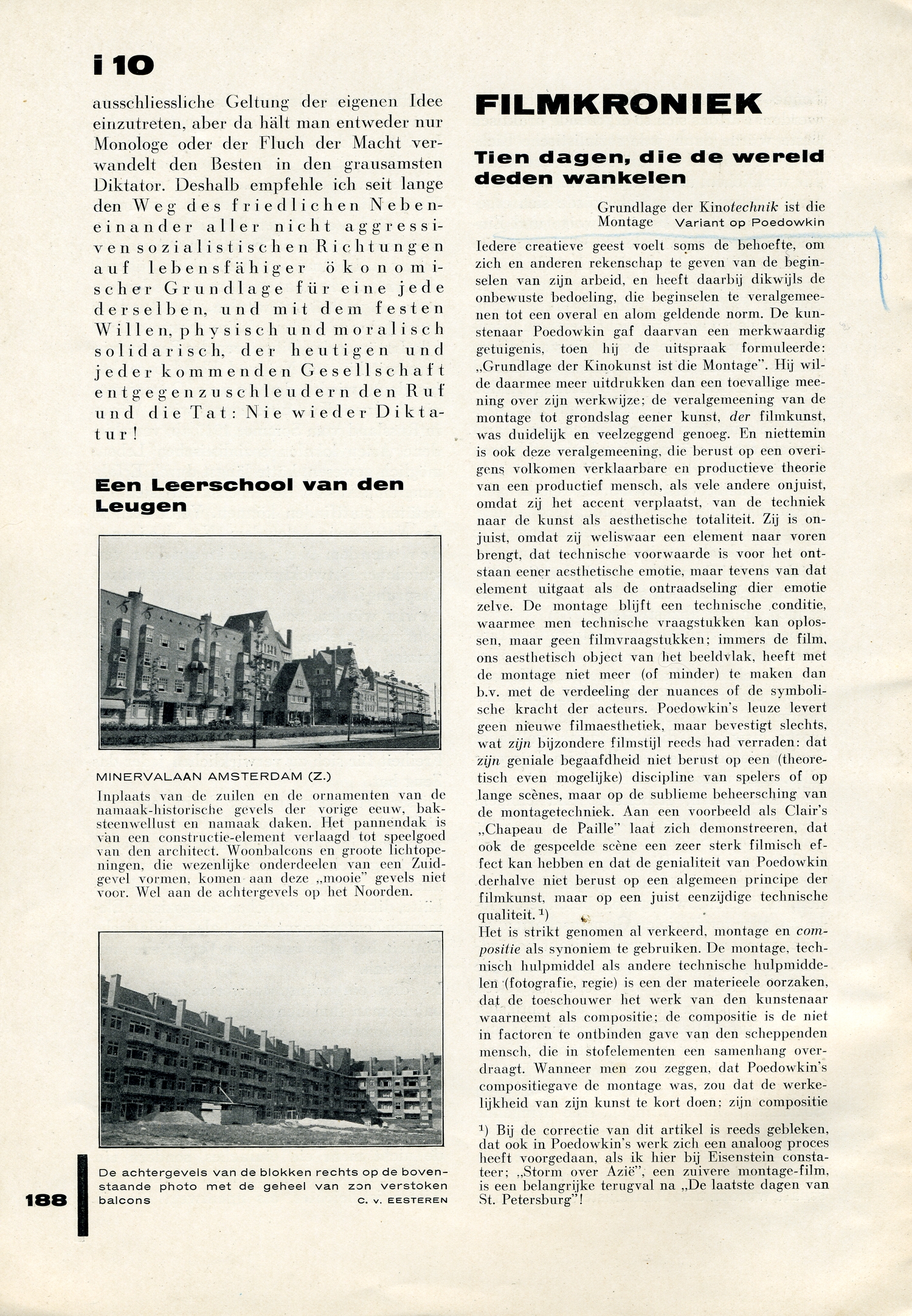 Er was aanleiding, om, zooals Poedowkin deed, op de beteekenis der montage te wijzen. Na ‘Tien Dagen’ is er echter evenzeer aanleiding, om voor overschatting der montage te waarschuwen! Die overschatting is niet gevaarlijk, wanneer zij, als in ‘De Moeder’, in ‘De Laatste Dagen van St. Petersburg’, in ‘Potemkin’, gelukkig inconsequent wordt gecompenseerd; wanneer montage slechts een leuze is voor compositie, die de aesthetische totaliteit raakt, maakt de kunstenaar in zijn schepping goed, wat hij definieerend misdeed. De consequente toepassing alleen is een bedreiging voor de filmkunst, niet minder ernstig wellicht dan de decoratie-dogmatiek, die van de ‘Nibelungen’ naar ‘Metropolis’ leidde!