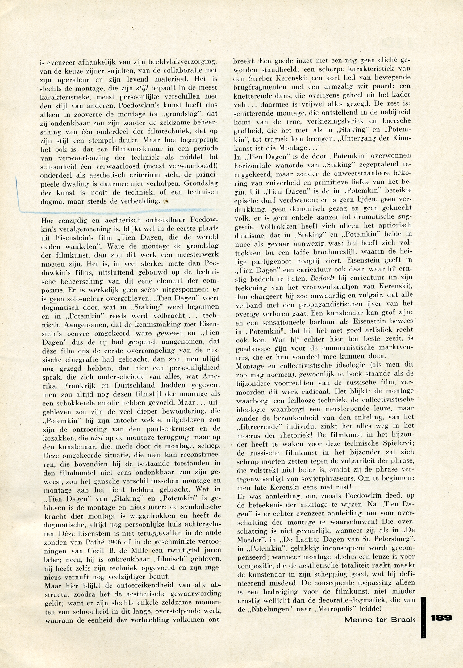 Montage en collectivistische ideologie (als men dit zoo mag noemen), gewoonlijk te boek staande als de bijzondere voorrechten van de russische film, vermoorden dit werk radicaal. Het blijkt: de montage waarborgt een feillooze techniek, de collectivistische ideologie waarborgt een meesleepende leuze, maar zonder de bezonkenheid van den enkeling, van het ‘filtreerende’ individu, zinkt het alles weg in het moeras der rhetoriek! De filmkunst in het bijzonder heeft te waken voor deze technische Spielerei; de russische filmkunst in het bijzonder zal zich schrap moeten zetten tegen de vulgariteit der phrase, die volstrekt niet beter is, omdat zij de phrase vertegenwoordigt van sovjetphraseurs. Om te beginnen: men late Kerenski eens met rust!