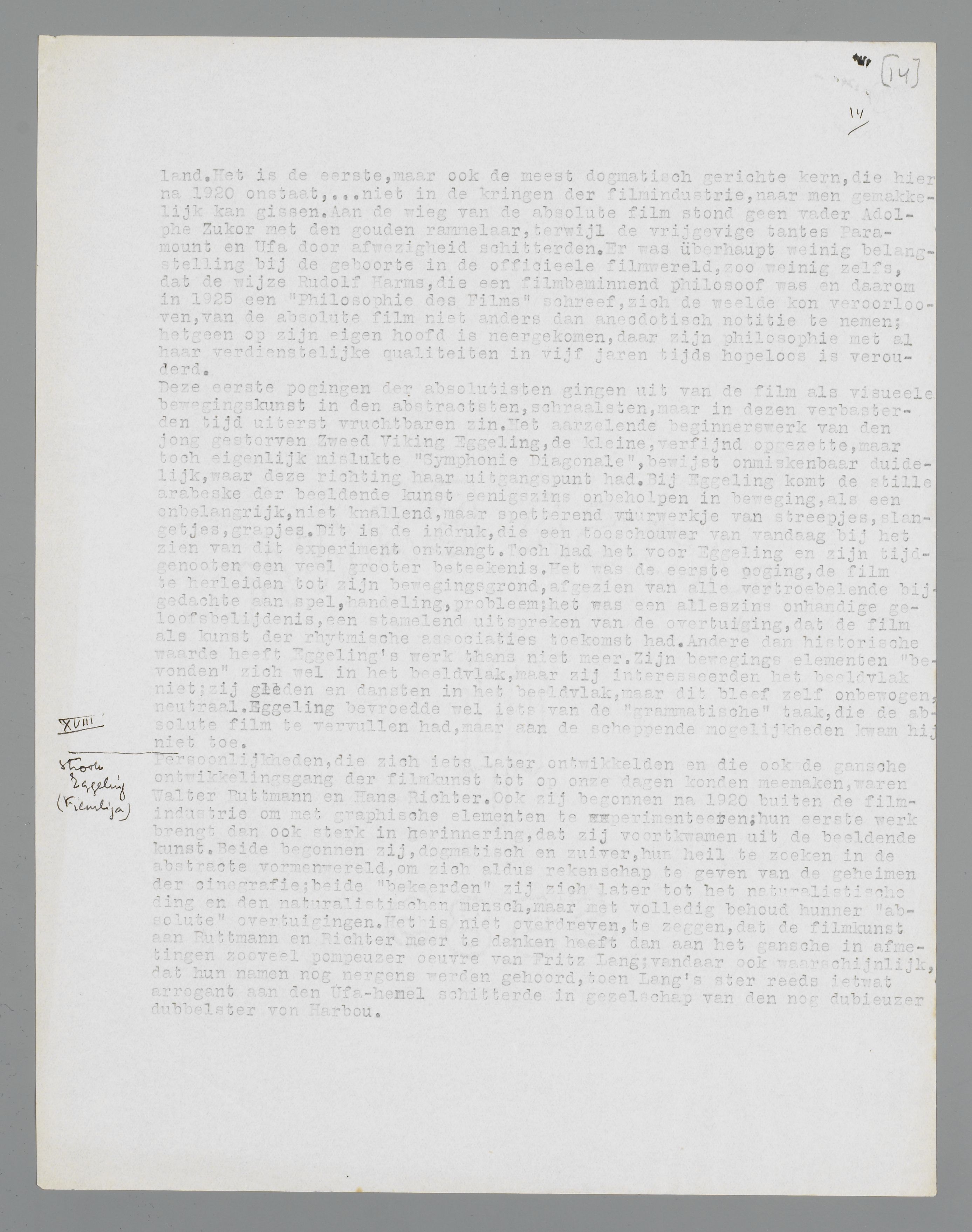 De eerste principieele haard der absolute film is te vinden in Duitschland. Het is de eerste, maar ook de meest dogmatisch gerichte kern, die hier na 1920 ontstaat... niet in de kringen der filmindustrie, naar men gemakkelijk kan gissen. Aan de wieg van de absolute film stond geen vader Adolphe Zukor met den gouden rammelaar, terwijl de vrijgevige tantes Paramount en Ufa door afwezigheid schitterden. Er was überhaupt weinig belangstelling bij de geboorte in de officieele filmwereld, zoo weinig zelfs, dat de wijze Rudolf Harms, die een filmbeminnend philosoof was en daarom in 1925 een Philosophie des Films schreef, zich de weelde kon veroorloven, van de absolute film niet anders dan anecdotisch notitie te nemen; hetgeen op zijn eigen hoofd is neergekomen, daar zijn philosophie met al haar verdienstelijke qualiteiten in vijf jaren tijds hopeloos is verouderd.