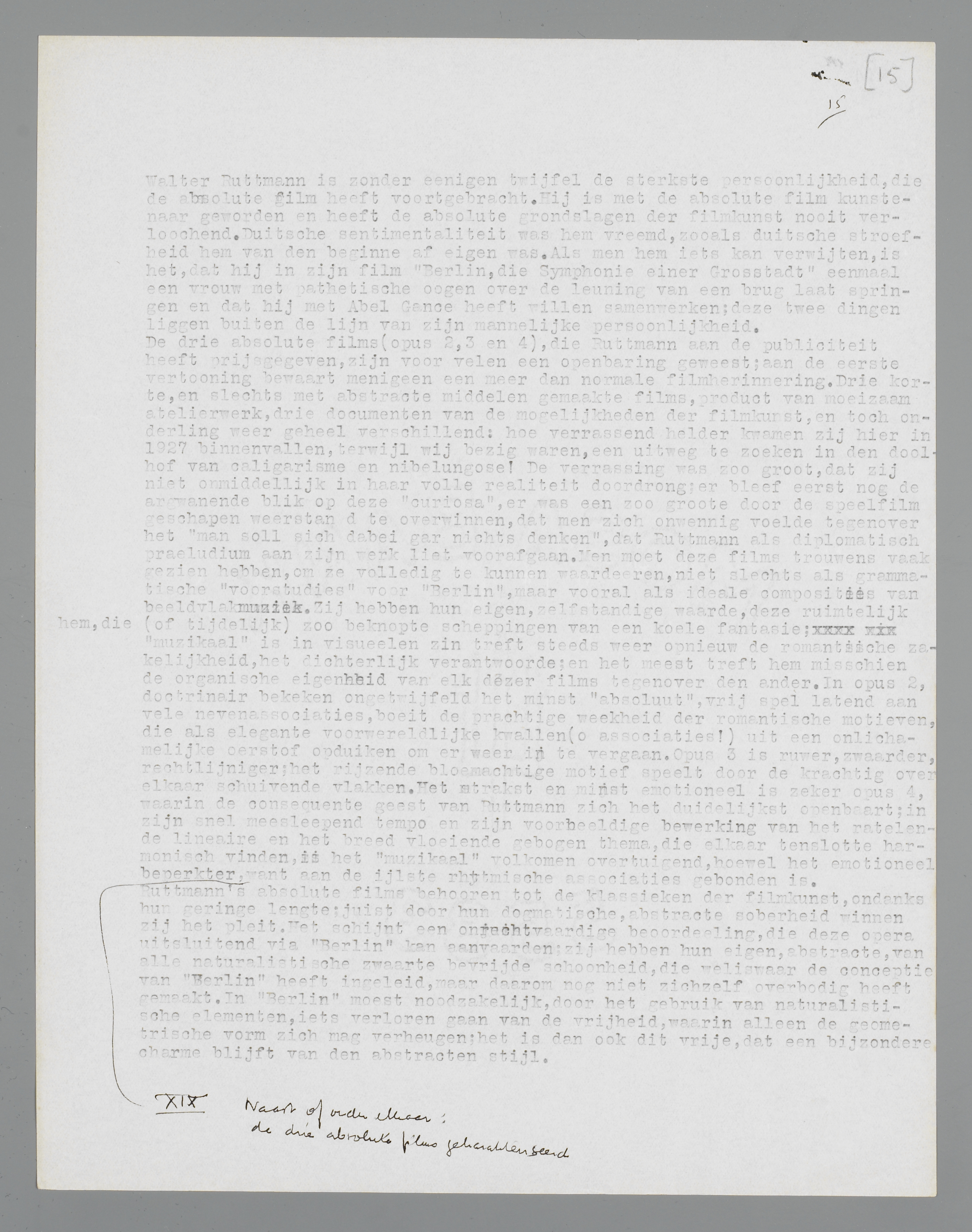 Walter Ruttmann is zonder eenigen twijfel de sterkste persoonlijkheid, die de absolute film heeft voortgebracht. Hij is met de absolute film kunstenaar geworden en heeft de absolute grondslagen der filmkunst nooit verloochend. Duitsche sentimentaliteit was hem vreemd, zooals duitsche stroefheid hem van den beginne af eigen was. Als men hem iets kan verwijten, is het, dat hij in zijn film Berlin, die Symphonie einer Grosstadt, eenmaal een vrouw met pathetische oogen over de leuning van een brug laat springen, en dat hij met Abel Gance heeft willen samenwerken; deze twee dingen liggen buiten de lijn van zijn mannelijke persoonlijkheid.