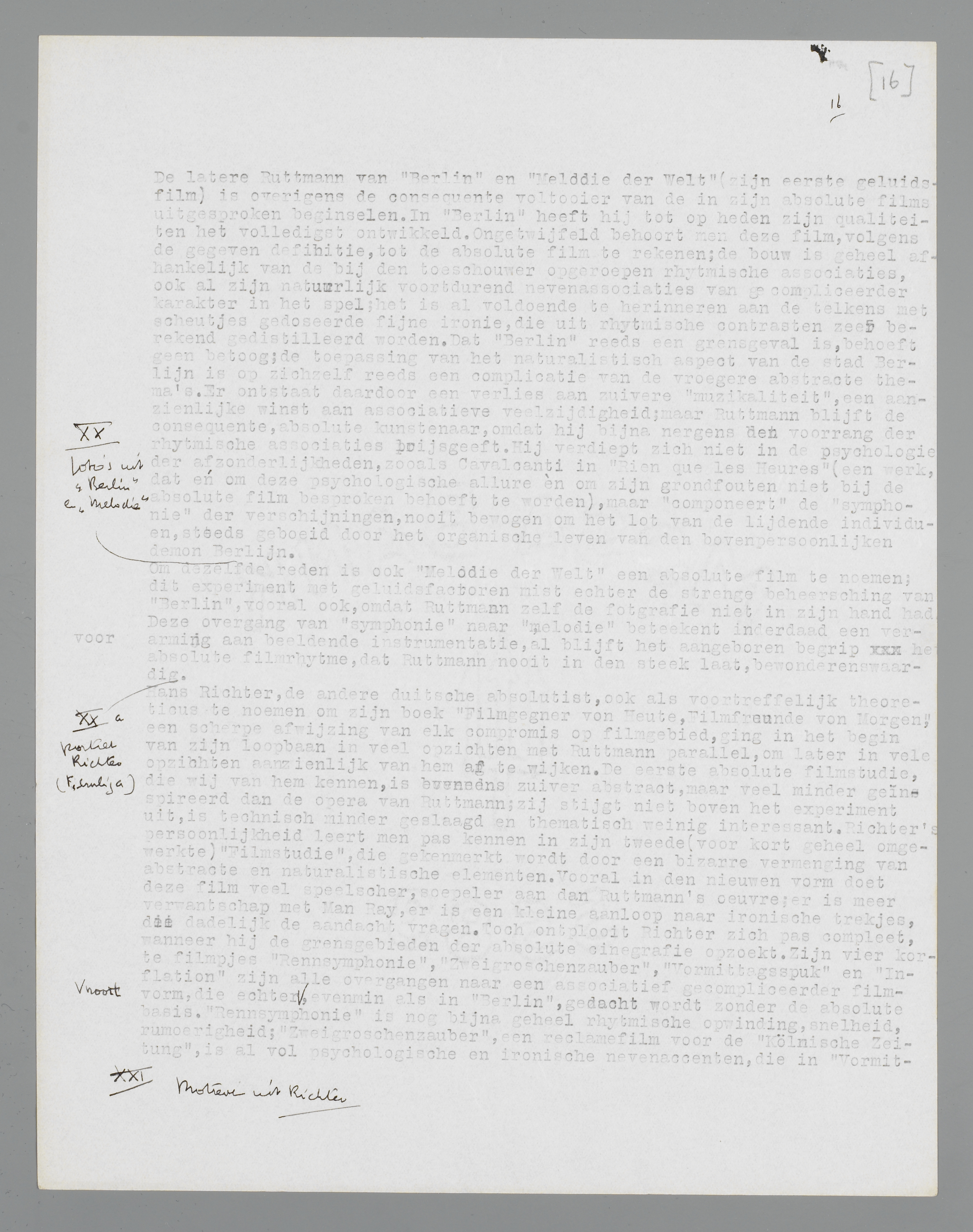 De latere Ruttmann van Berlin en Melodie der Welt (zijn eerste geluidsfilm) is overigens de consequente voltooier van de in zijn absolute films uitgesproken beginselen. In Berlin heeft hij tot op heden zijn qualiteiten het volledigst ontwikkeld. Ongetwijfeld behoort men deze