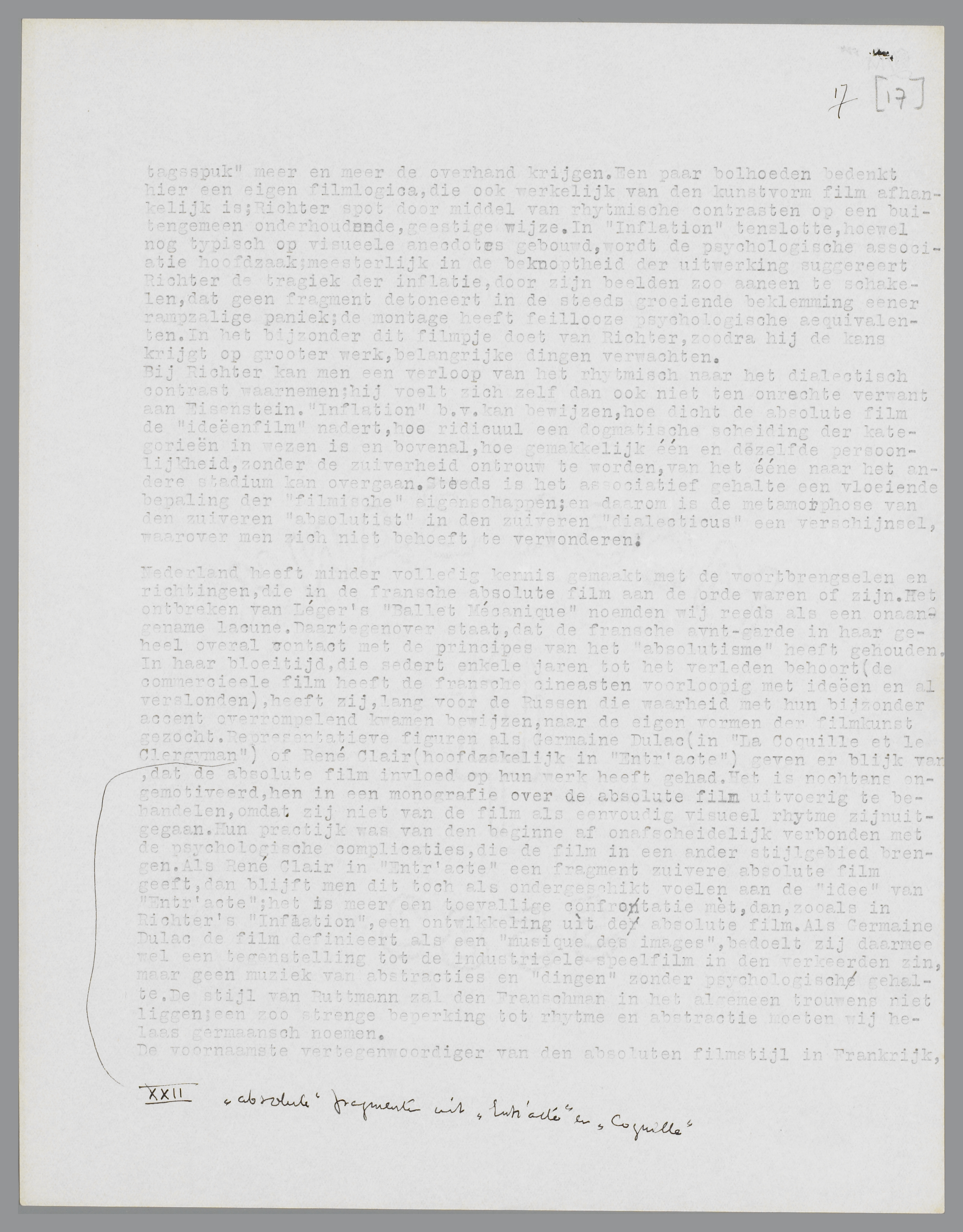 Bij Richter kan men een verloop van het rhytmisch naar het dialectisch contrast waarnemen; hij voelt zich zelf dan ook niet ten onrechte verwant aan Eisenstein. Inflation b.v. kan bewijzen, hoe dicht de absolute film de ideëenfilm nadert, hoe ridicuul een dogmatische scheiding der kategorieën in wezen is en bovenal, hoe gemakkelijk één en dezelfde persoonlijkheid, zonder de zuiverheid ontrouw te worden, van het ééne naar het andere stadium kan overgaan. Steeds is het associatief gehalte een vloeiende bepaling der filmische eigenschappen; en daarom is de metamorphose van den zuiveren absolutist in den zuiveren dialecticus een verschijnsel, waarover men zich niet behoeft te verwonderen.