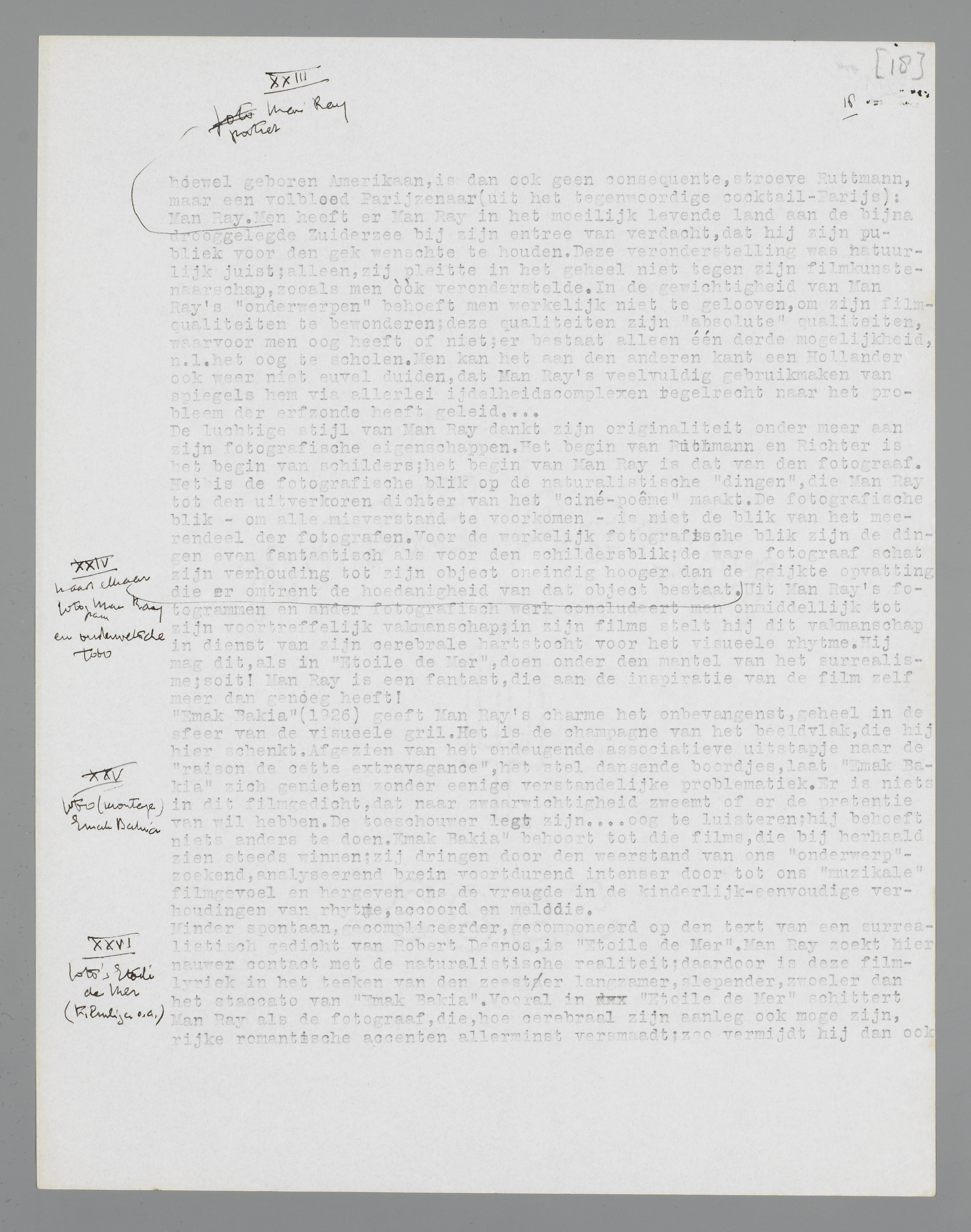 de ware fotograaf schat zijn verhouding tot zijn object oneindig hooger dan de geijkte opvatting die er omtrent de hoedanigheid van dat object bestaat. Uit Man Ray's fotogrammen en ander fotografisch werk concludeert men onmiddellijk tot zijn voortreffelijk vakmanschap; in zijn films stelt hij dit vakmanschap in dienst van zijn cerebralen hartstocht voor het visueele rhytme. Hij mag dit, als in Etoile de Mer, doen onder den mantel van het surrealisme; soit! Man Ray is een fantast, die aan de inspiratie van de film zelf meer dan genoeg heeft!