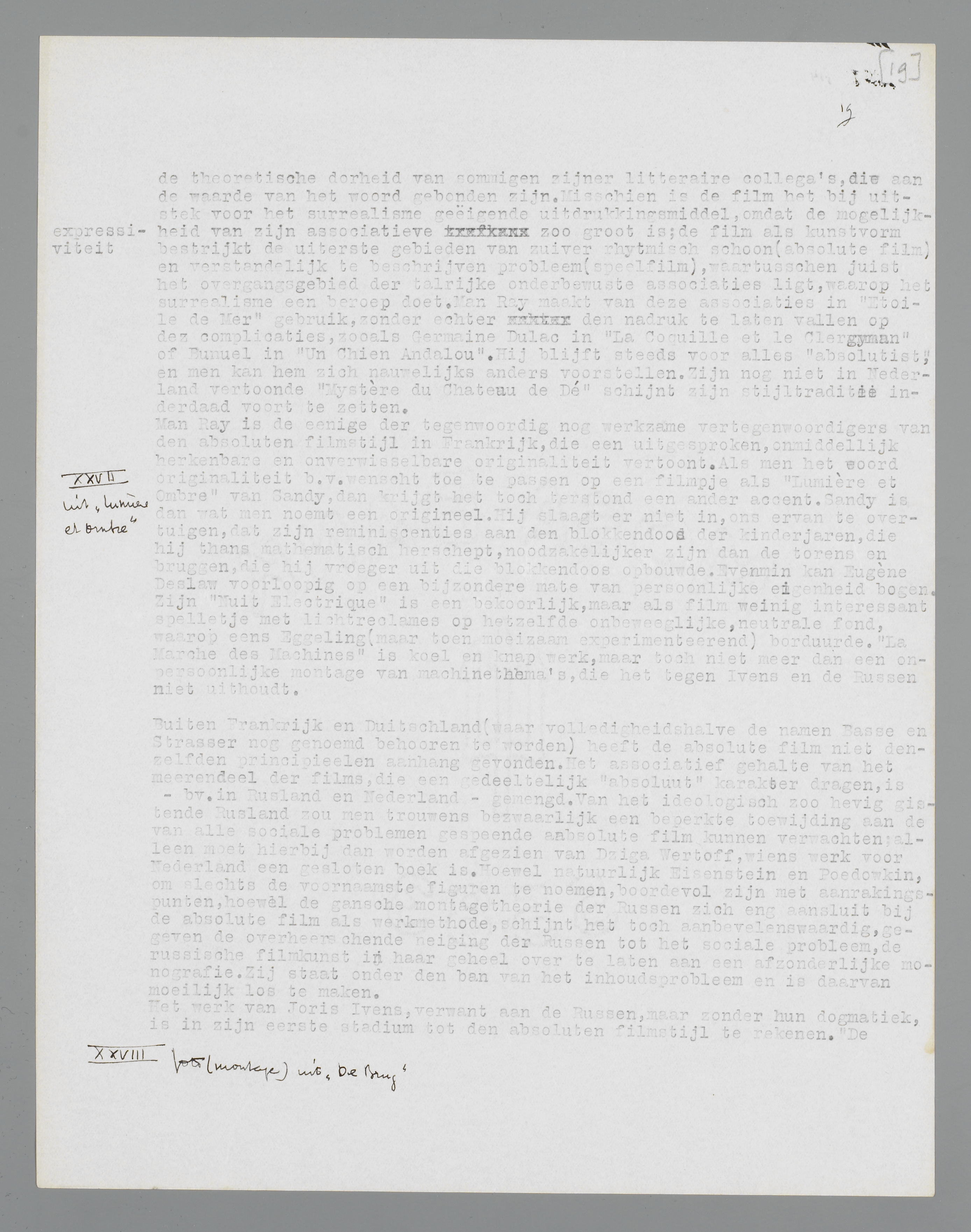 Man Ray is de eenige der tegenwoordige nog werkzame vertegenwoordigers van den absoluten filmstijl in Frankrijk, die een uitgesproken, onmiddellijk herkenbare en onverwisselbare originaliteit vertoont. Als men het woord originaliteit b.v. wenscht toe te passen op een filmpje als Lumière et Ombre van Sandy, dan krijgt het toch terstond een ander accent. Sandy is dan wat men noemt een origineel. Hij slaagt er niet in, ons ervan te overtuigen, dat zijn reminiscenties aan de blokkendoos der kinderjaren, die hij thans mathematisch herschept, noodzakelijker zijn dan de torens en bruggen, die hij vroeger uit die blokkendoos opbouwde. Evenmin kan Eugène Deslaw voorloopig op een bijzondere eigenheid bogen. Zijn Nuit Electrique is een bekoorlijk, maar