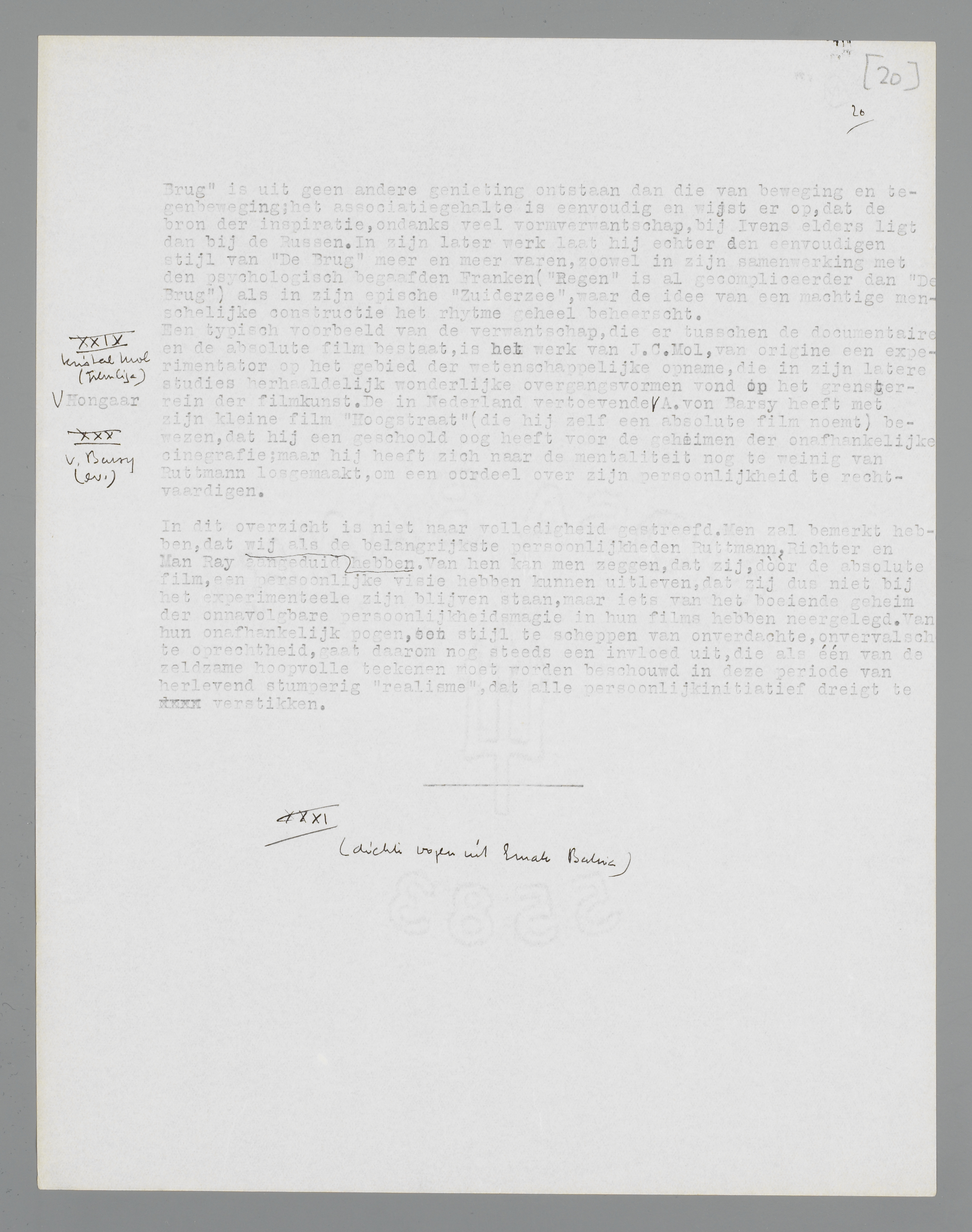 toevende Hongaar A. von Barsy heeft met zijn kleine film Hoogstraat (die hij zelf een absolute film noemt) bewezen, dat hij een geschoold oog heeft voor de geheimen der onafhankelijke cinegrafie; maar hij heeft zich naar de mentaliteit nog te weinig van Ruttmann losgemaakt, om een oordeel over zijn persoonlijkheid te rechtvaardigen.