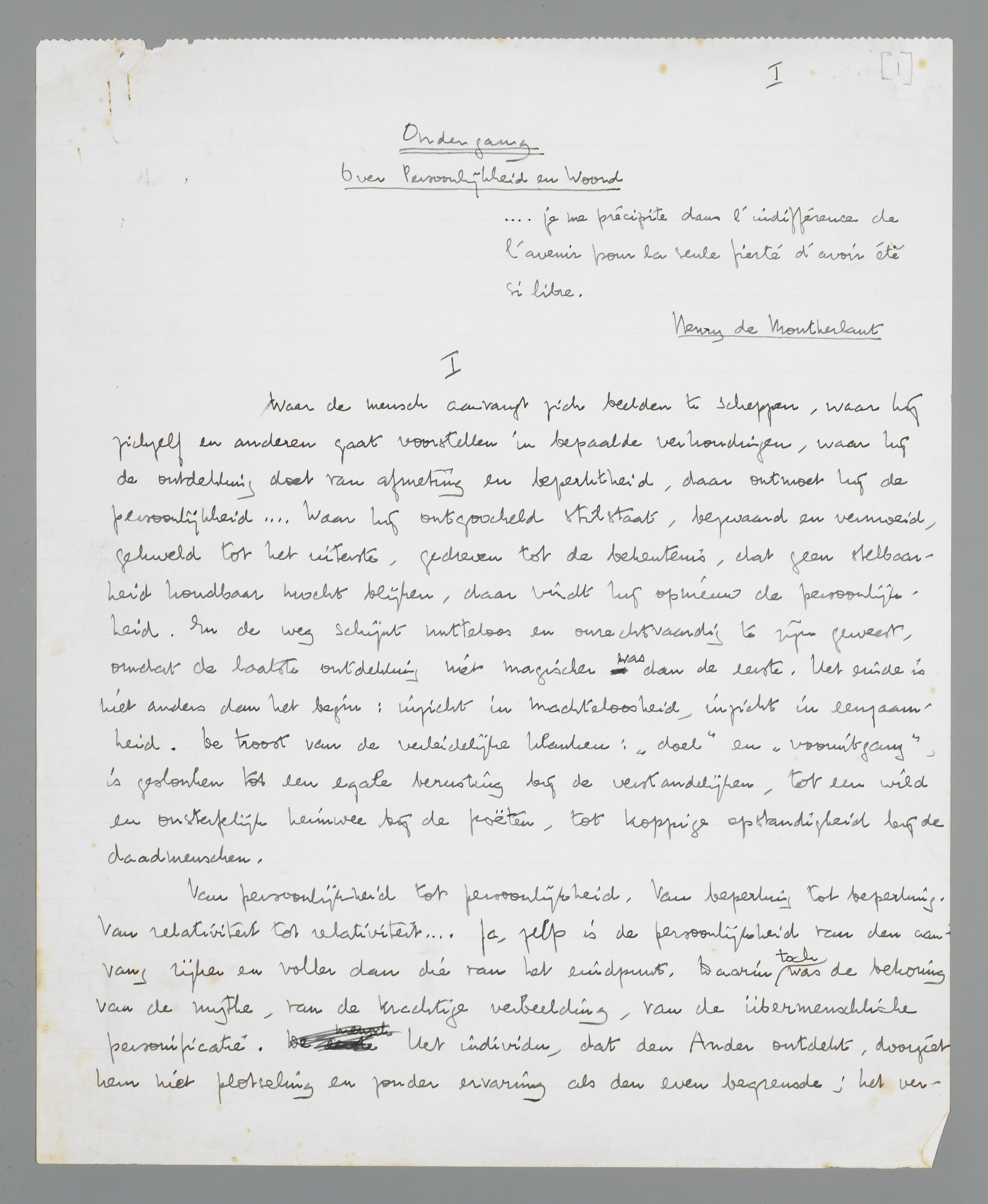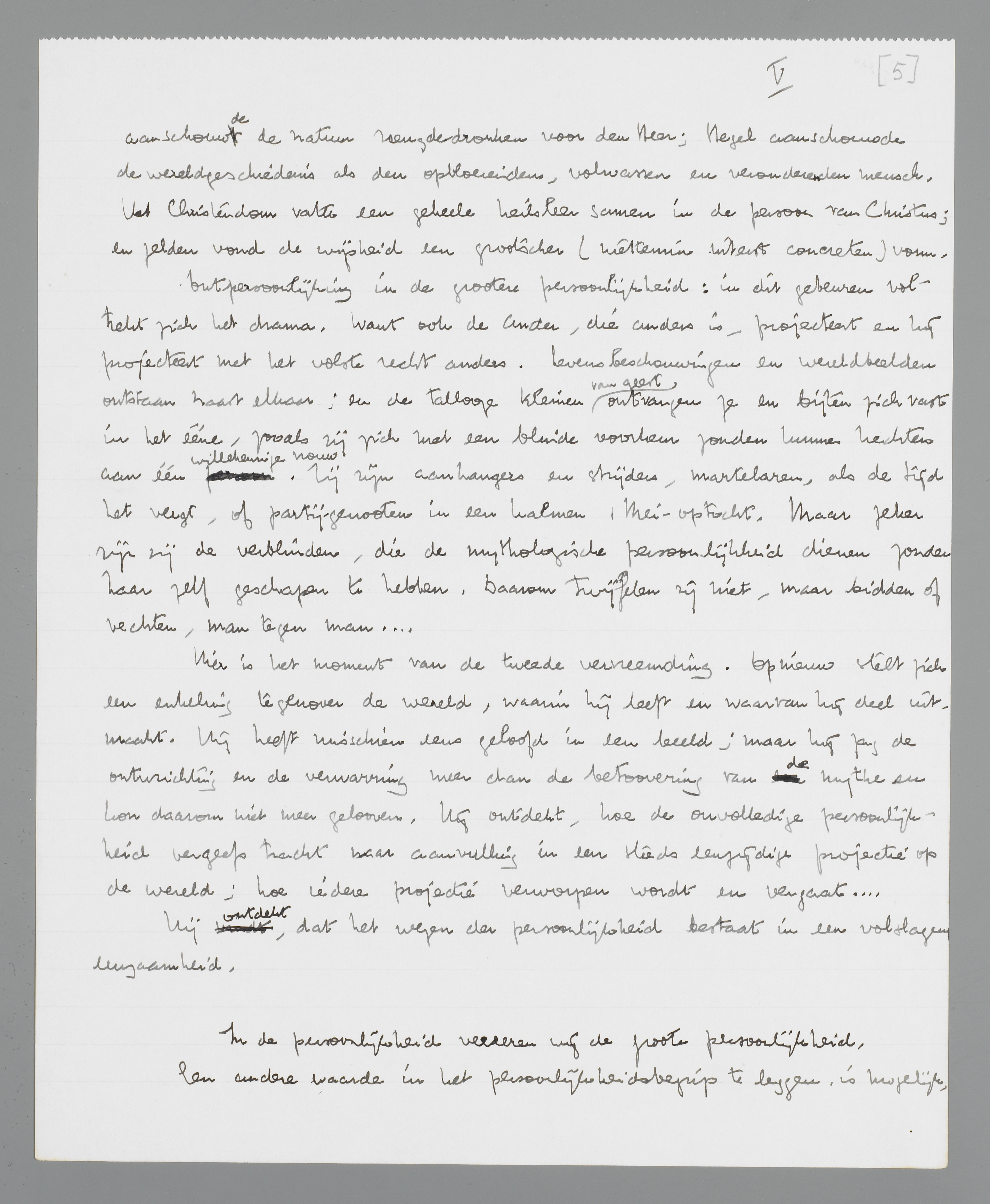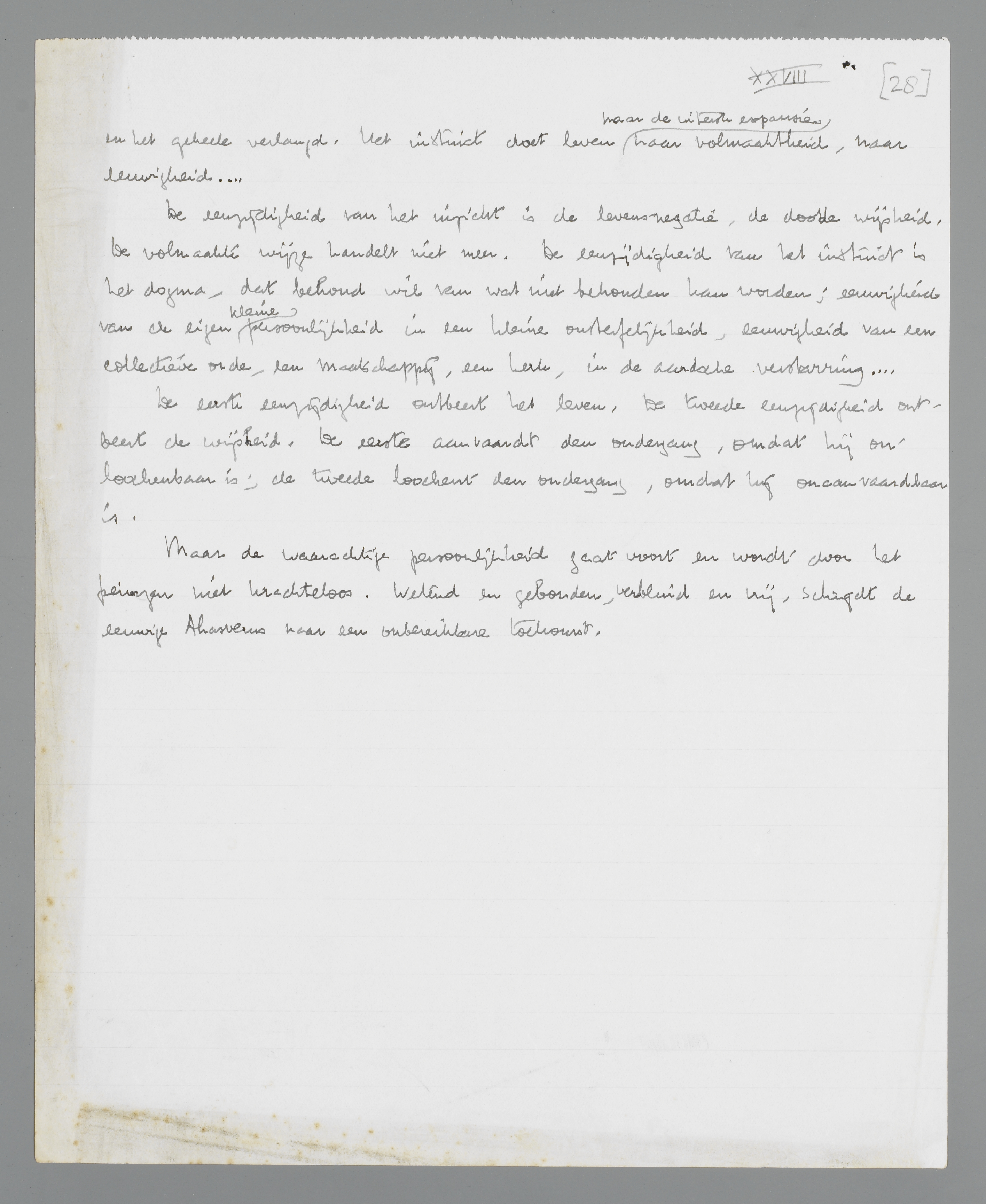 Waar de mensch aanvangt zich beelden te scheppen, waar hij zichzelf en anderen gaat voorstellen in bepaalde verhoudingen, waar hij de ontdekking doet van afmeting en beperktheid, daar ontmoet hij de persoonlijkheid... Waar hij ontgoocheld stilstaat, bezwaard en vermoeid, gekweld tot het uiterste, gedreven tot de bekentenis, dat geen stelbaarheid houdbaar mocht blijken, daar vindt hij opnieuw de persoonlijkheid. En de weg schijnt nutteloos en onrechtvaardig te zijn geweest, omdat de laatste ontdekking niet magischer, zelfs troosteloozer was dan de eerste. Het einde is niet anders dan het begin: inzicht in machteloosheid, inzicht in eenzaamheid, terwijl de hoop op een eindelijke overwinning verdween. De troost van de verleidelijke klanken: ‘doel’ en ‘vooruitgang’ is geslonken tot een egale berusting bij de verstande-
