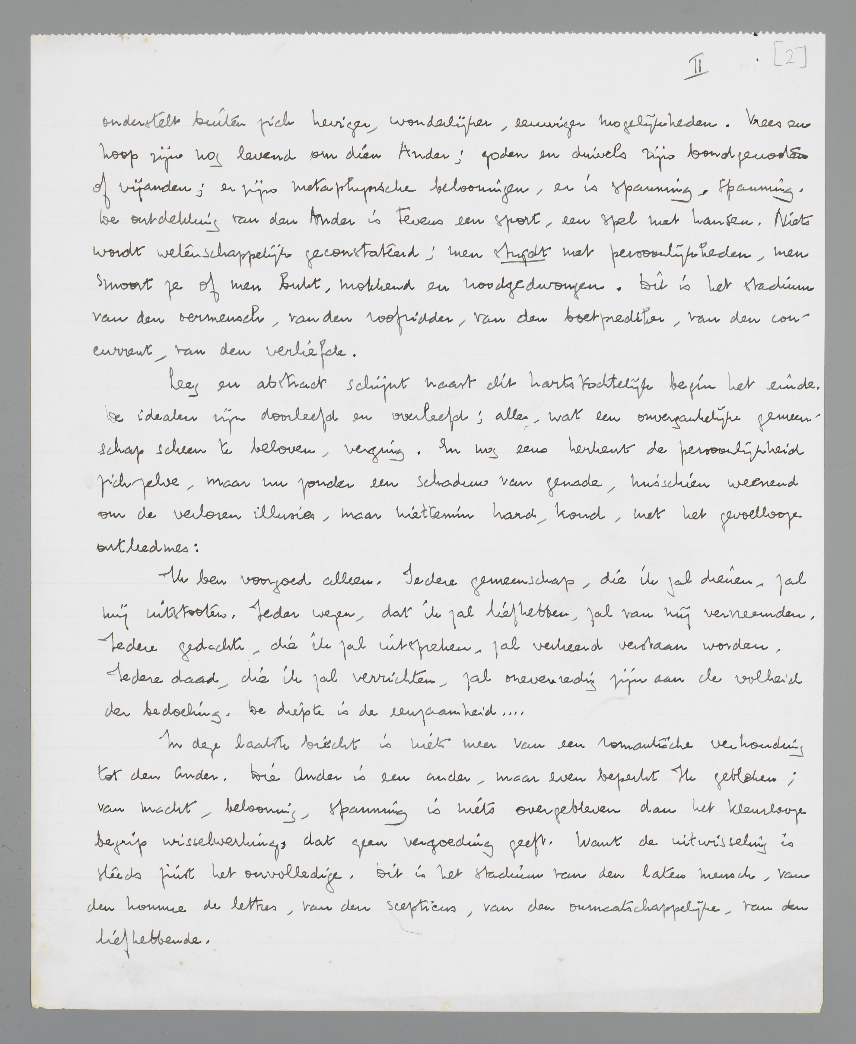 In deze laatste biecht is niets meer over van een romantische verhouding tot den Ander. Die Ander is een ander, maar even beperkt wezen gebleken; van macht, belooning, spanning, is niets gebleven dan het kleurlooze begrip wisselwerking, dat geen enkele vergoeding geeft; want de uitwisseling is juist het onvolledige, het teleurstellende. Dit is het stadium van den laten mensch, van den door daden vermoeide, van den scepticus, van den onmaatschappelijke, van hem, die heeft liefgehad.