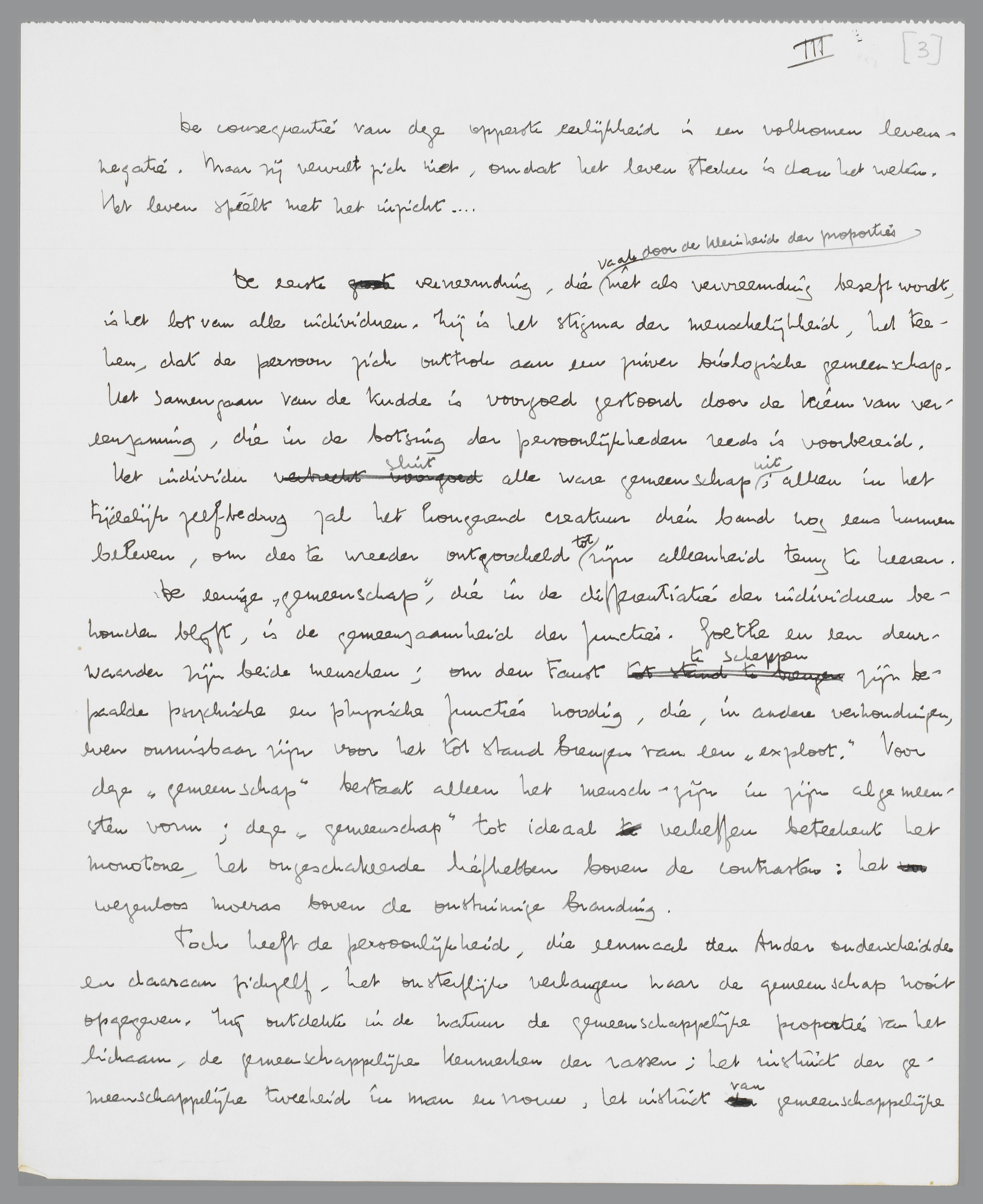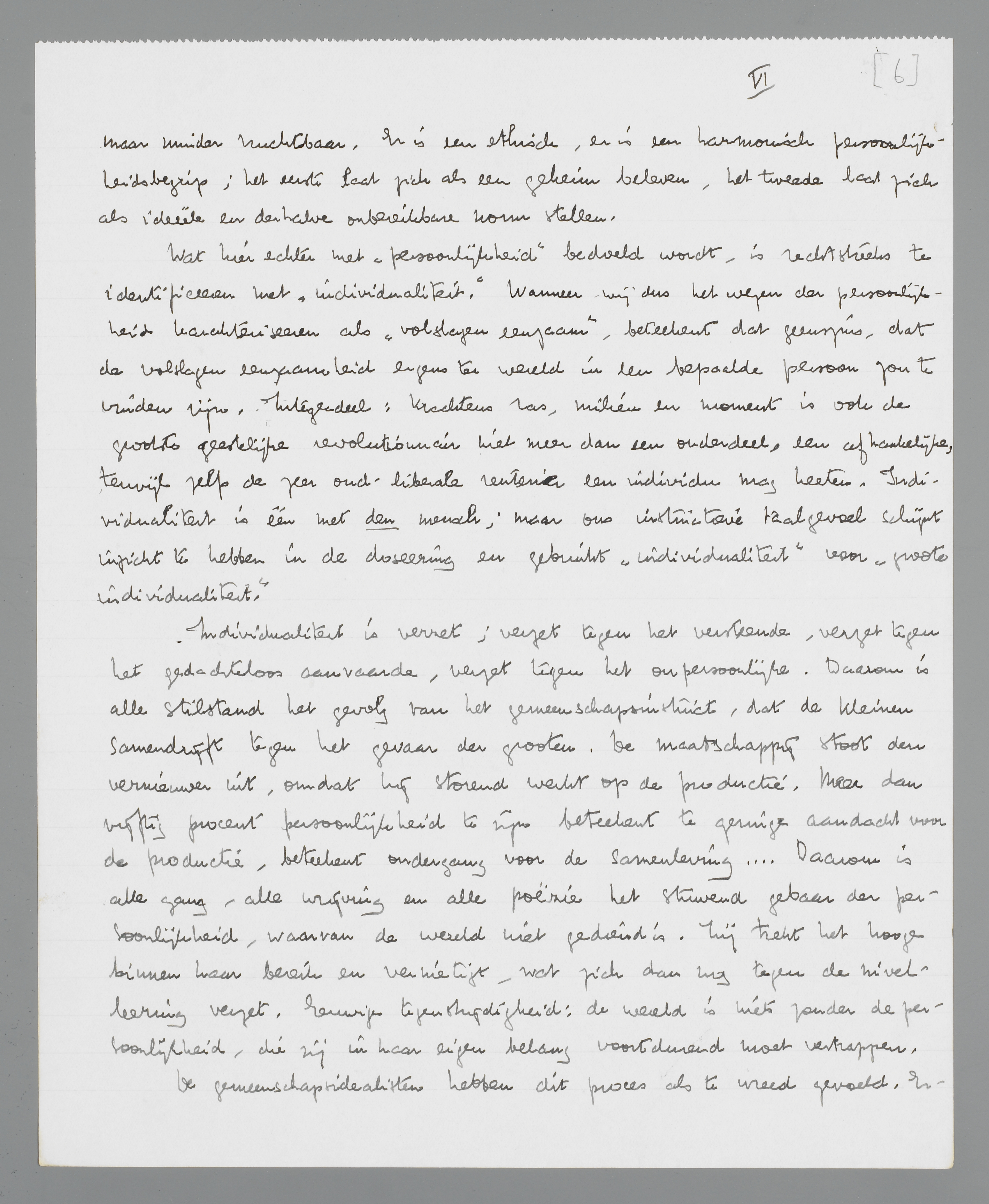 In het begrip ‘persoonlijkheid’ op zichzelf is, behalve de continuiteit van het Ik, niet meer gegeven dan een onderscheid van den Ander, die ook een persoonlijkheid is. De meest karakterlooze conventiemensch onderscheidt zich nog door dit ‘persoonlijk’ element van den anderen karakterloozen conventiemensch. Er is geen absolute persoonlijkheid, er is geen absolute massa; daarom heeft de onderscheiding van de persoonlijkheid geen andere waarde dan aanleiding te zijn tot onderscheiding der groote persoonlijkheid.