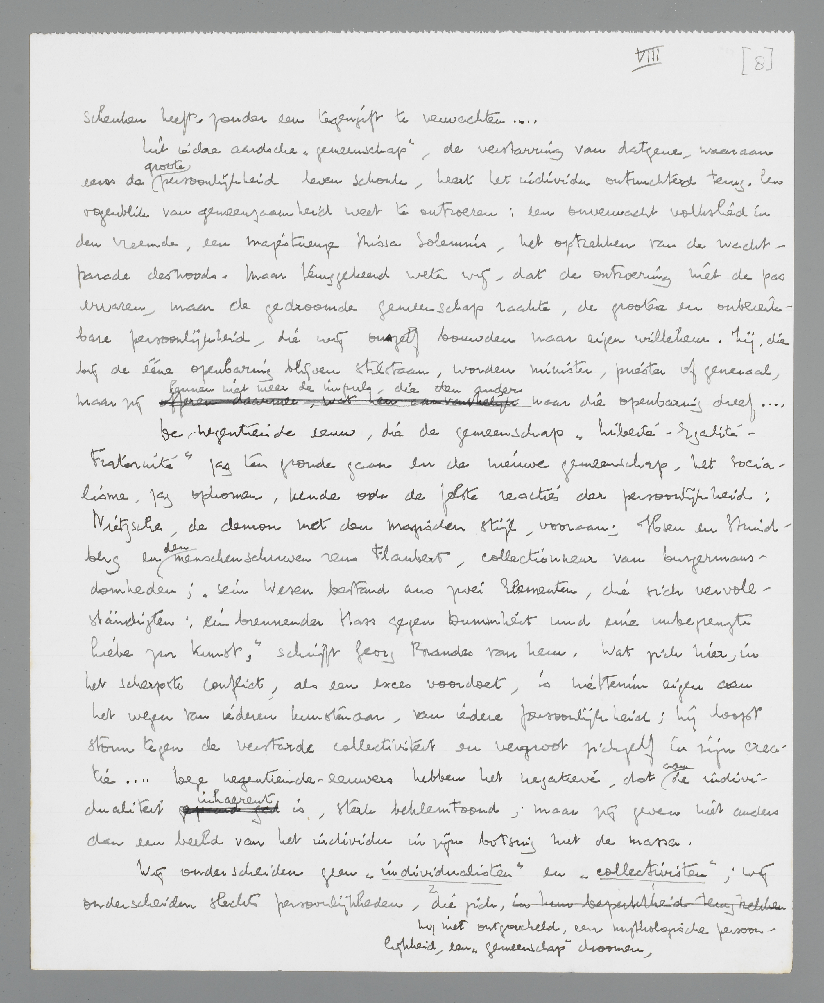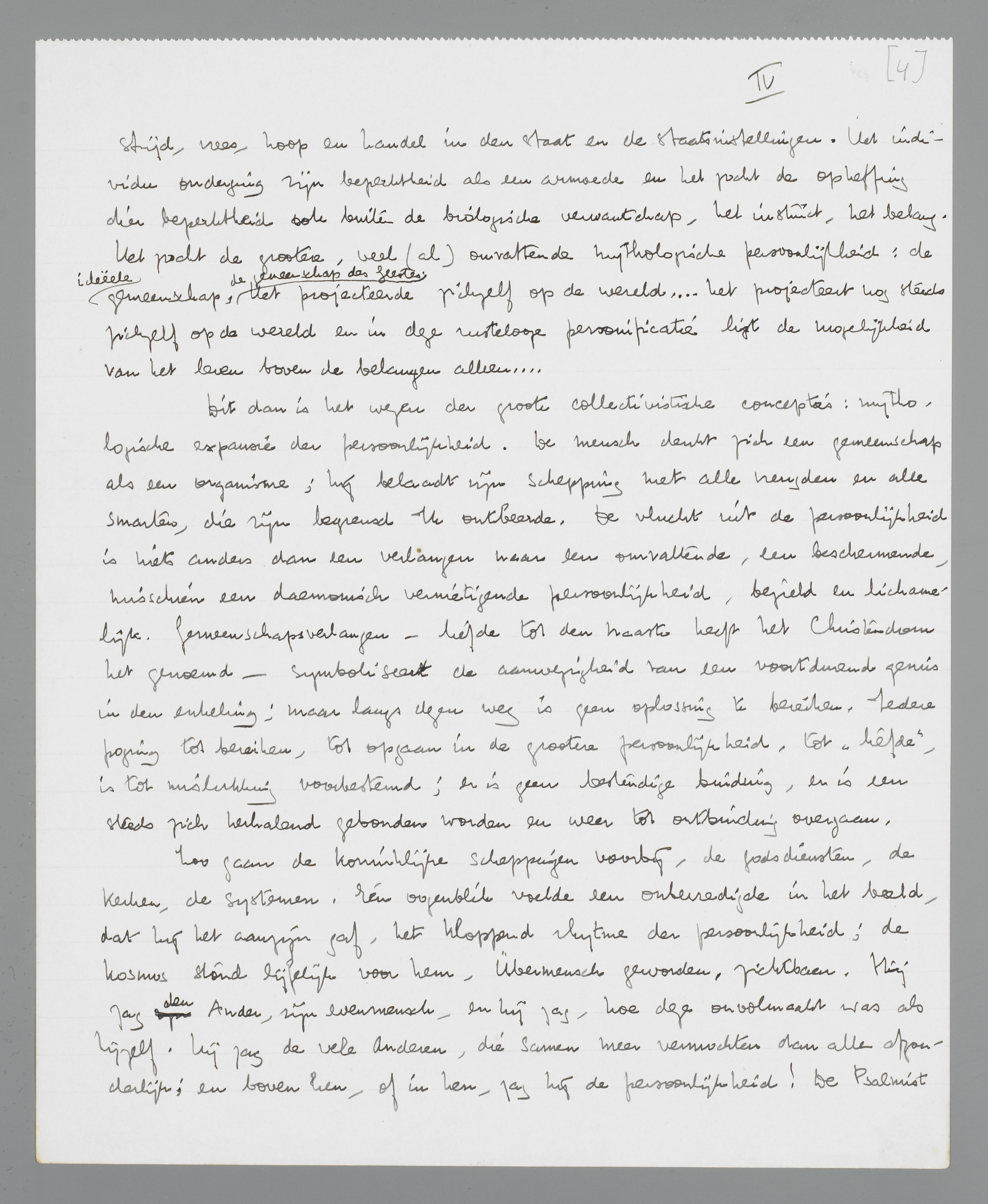 Wij onderscheiden geen ‘collectivisten’ en ‘individualisten’; wij onderscheiden slechts persoonlijkheden, die zich, nog niet ontgoocheld, een mythologische persoonlijkheid, een ‘gemeenschap’, verbeelden, en persoonlijkheden, die zich bewust in hun beperking terugtrekken.