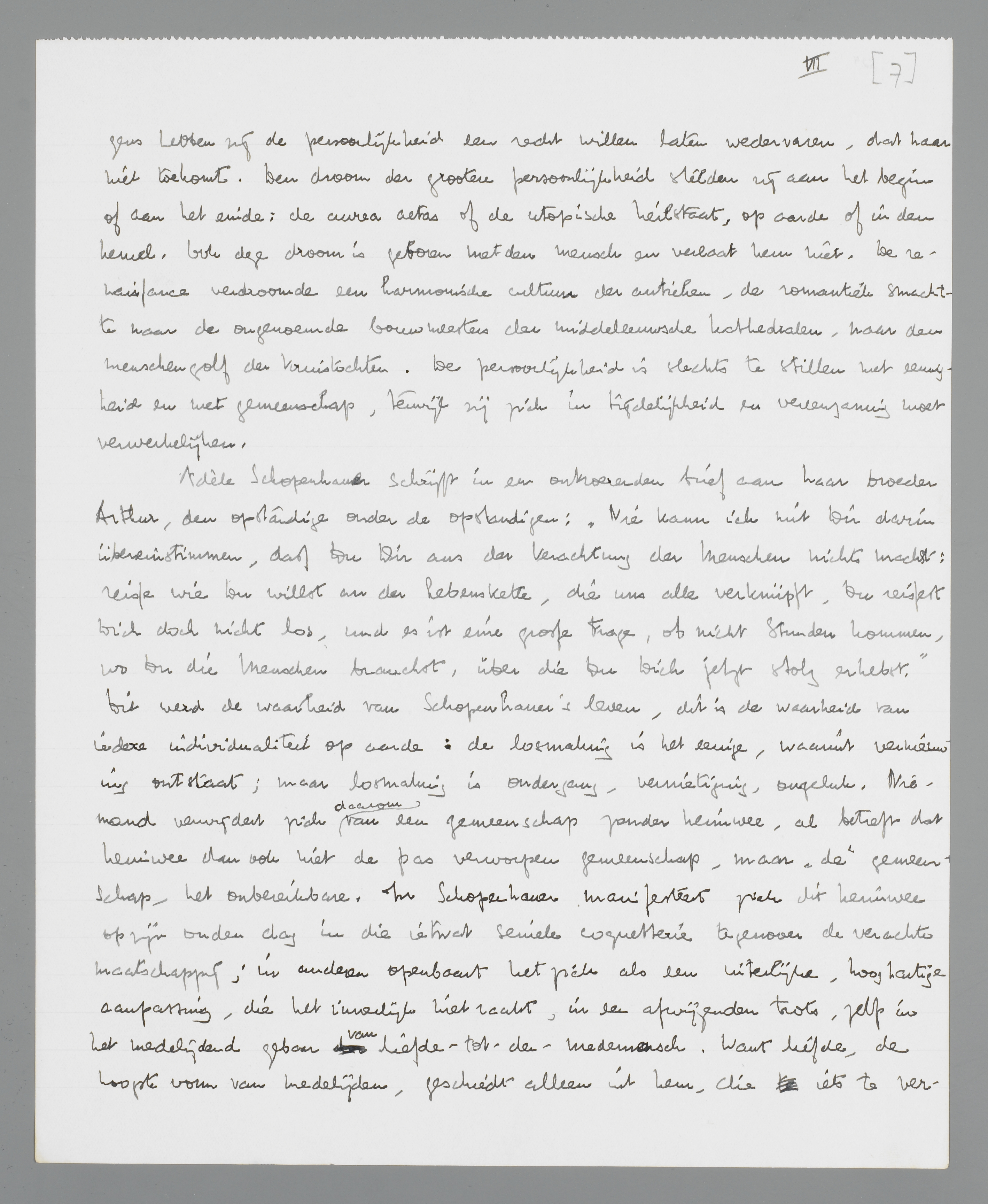Adèle Schopenhauer schrijft in een ontroerenden brief aan haar broeder Arthur, den opstandige onder de opstandigen: ‘Nie kann ich mit Dir darin übereinstimmen, dass Du Dir aus der Verachtung der Menschen nichts machst; reisse wie Du willst an der Lebenskette, die uns alle verknüpft, Du reissest Dich doch nicht los, und es ist eine grosse Frage, ob nicht Stunden kommen, wo Du die Menschen brauchst, über die Du Dich jetzt stolz erhebst’. Deze eenvoudige zin werd de waarheid van Schopenhauer's leven... hij is ook de waarheid van alle individualiteit op aarde; de losmaking is het eenige, waaruit vernieuwing ontstaat, maar losmaking is ondergang, vernietiging, ongeluk. Niemand verwijdert zich daarom van een gemeenschap zonder heimwee, al betreft dat heimwee dan ook niet de pas verlaten en verworpen, maar ‘de’ gemeenschap, het onbereikbare. In Schopenhauer manifesteert zich dit verlangen op zijn ouden dag in die ietwat seniele coquetterie tegenover de verachte maatschappij; in anderen openbaart het zich