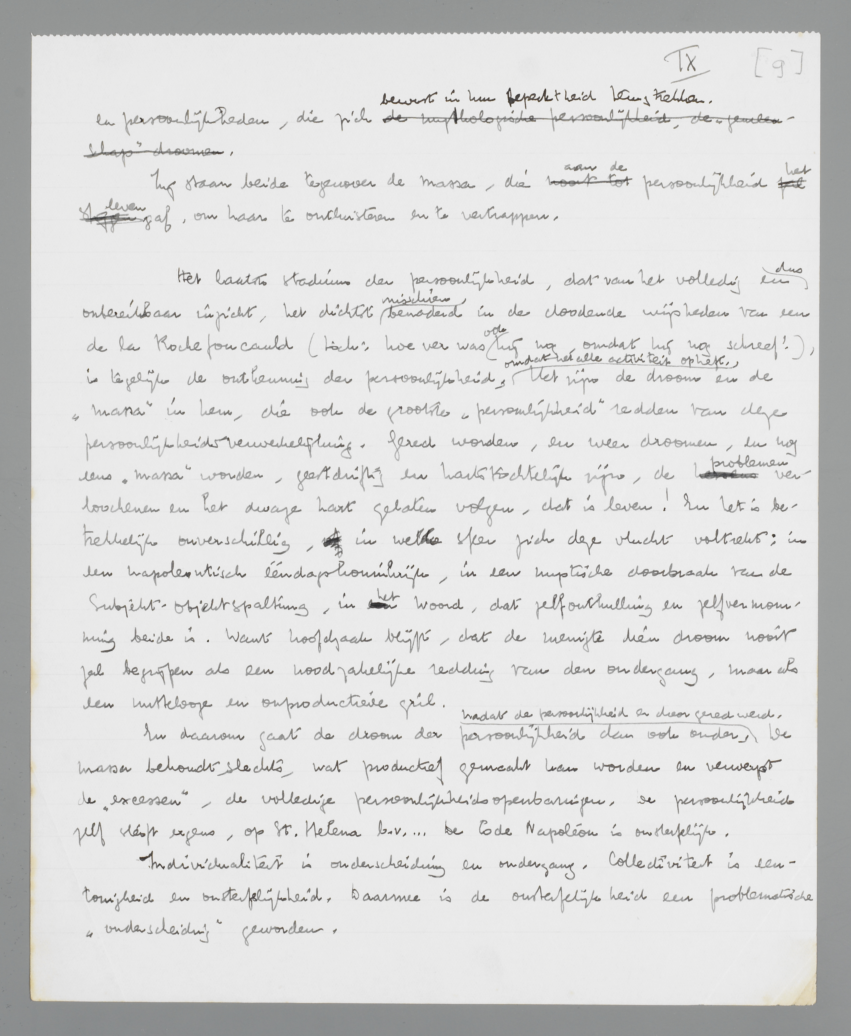 Het laatste stadium der persoonlijkheid, dat van het volledig (en dus onbereikbaar) inzicht, het dichtst misschien benaderd in de doodende wijsheden van een de la Rochefoucauld (toch: hoe ver was ook hij nog, omdat hij nog schreef!) is tegelijk de ontkenning van alle persoonlijkheid, omdat het de activiteit opheft. Het zijn de droom en de ‘massa’ in hem, die ook den scherpst ziende redden van déze ondraaglijke persoonlijkheid. Gered worden, en weer droomen, en nog eens ‘massa’ worden, geestdriftig en hartstochtelijk zijn, de problemen verloochenen en het dwaze hart gelaten volgen, dat is leven! En de vlucht voltrekt zich in iedere sfeer: in een napoleontische wereldorde-van-één-dag, in een mystische doorbraak van de Subjekt-Objekt-Spaltung, in het Woord, dat zelfonthulling en zelfvermomming is beide. De droom bewaart den droomer voor het inzicht; maar de menigte zal dien droom nooit begrijpen als een noodzakelijke redding van den ondergang. Zij vergaapt zich aan den schijn of ziet later alleen de nuttelooze, onproductieve gril.