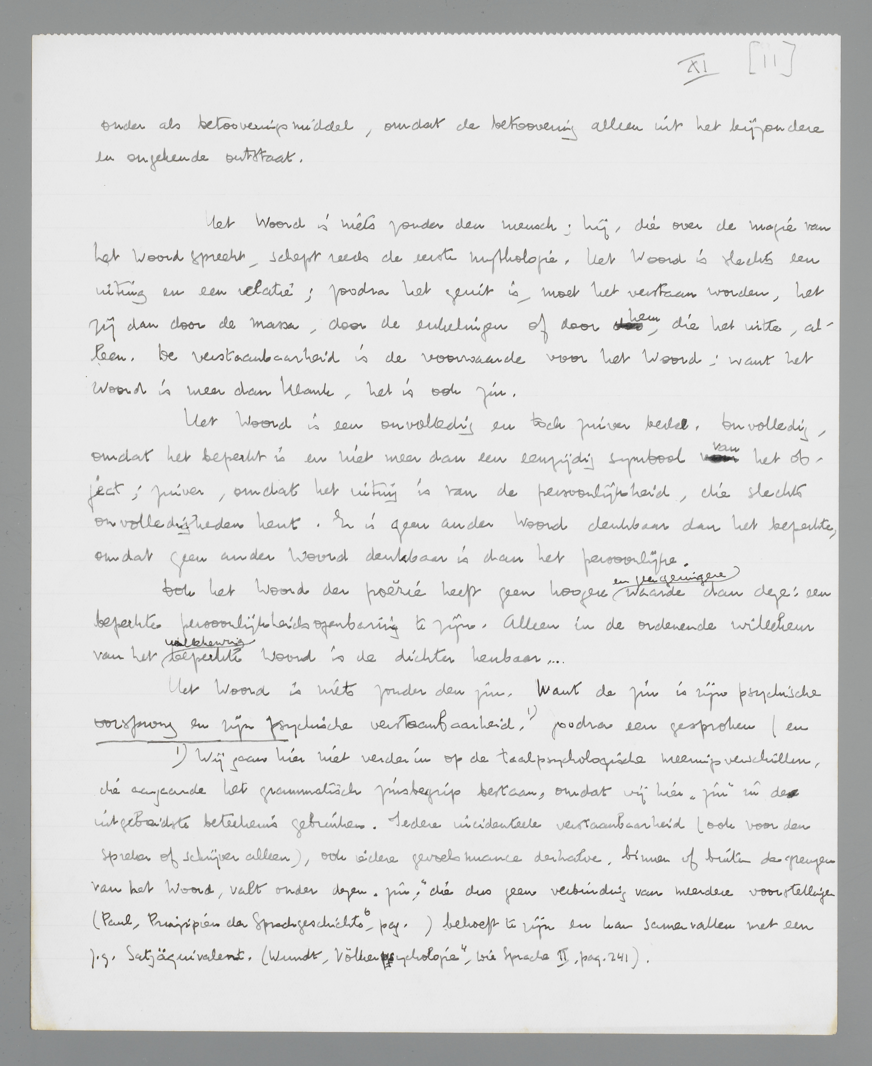 Het woord is niets zonder den mensch; hij, die over het leven of de magie van het woord spreekt, schept reeds de eerste mythologie. Het woord is slechts een uiting en een relatie; zoodra het geuit is, moet het verstaan worden, hetzij door de massa, hetzij door de enkelingen, hetzij door hem, die het uitte, alleen. De verstaanbaarheid is de voorwaarde voor het woord; want het woord is meer dan klank, het is ook zin.