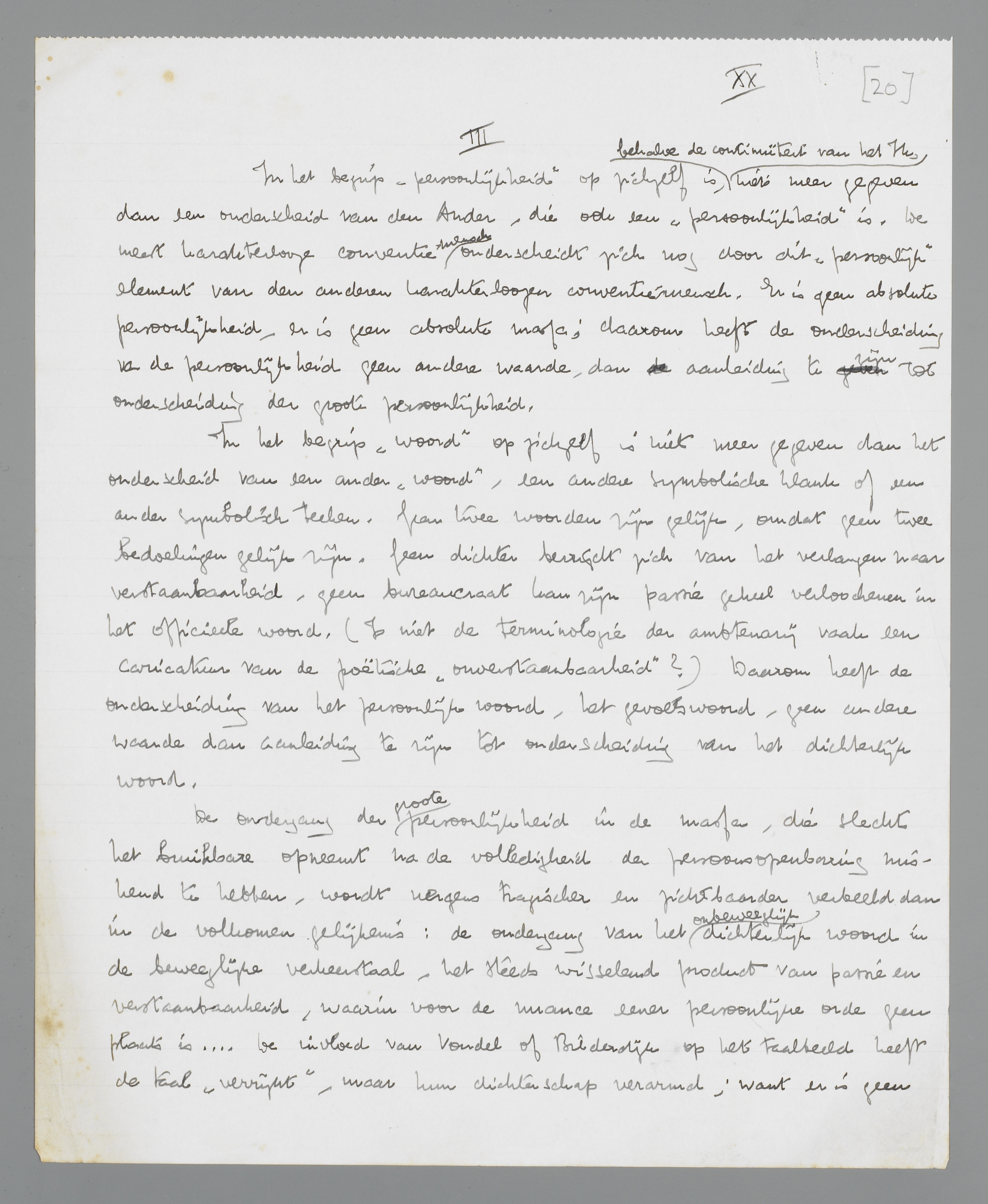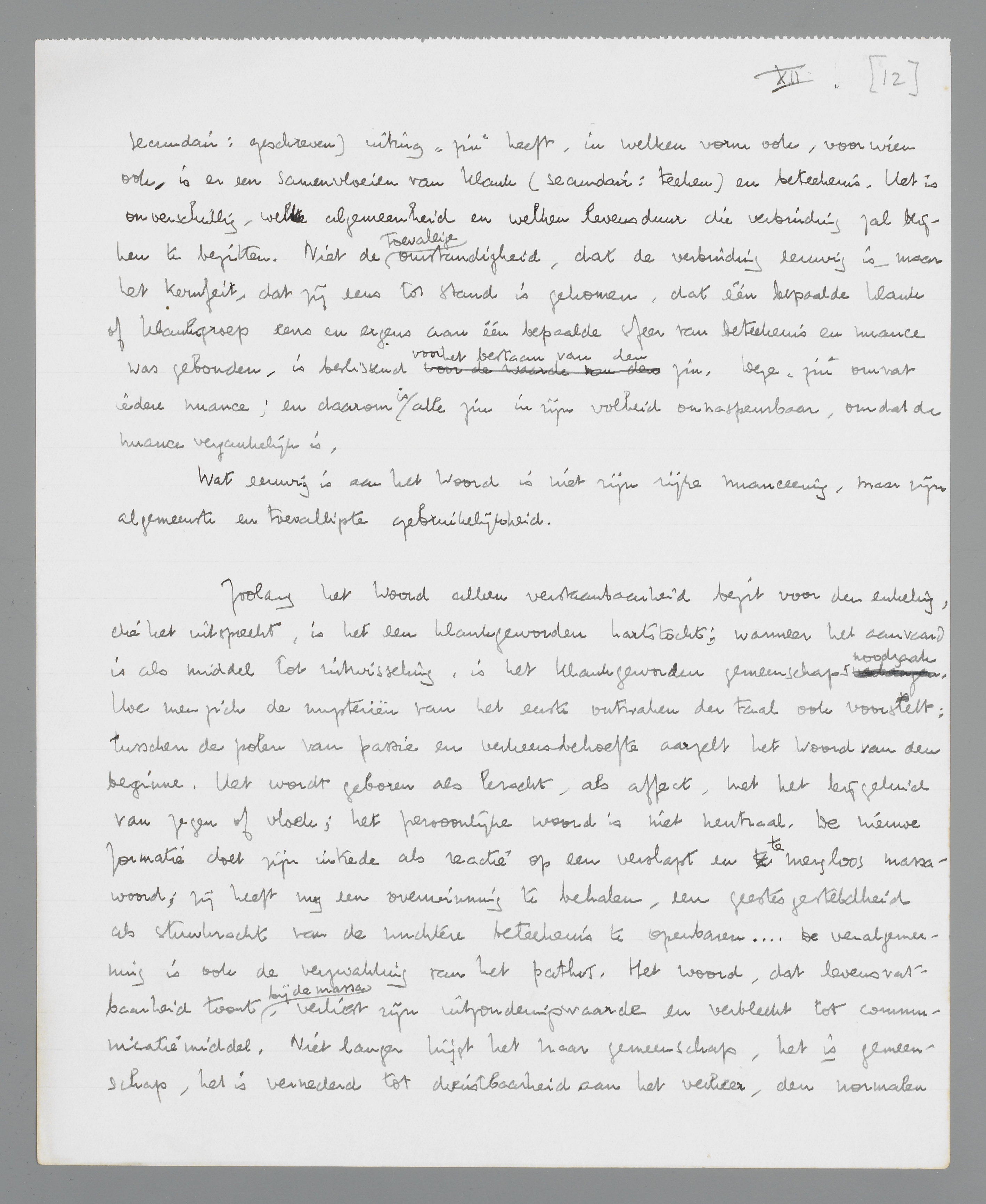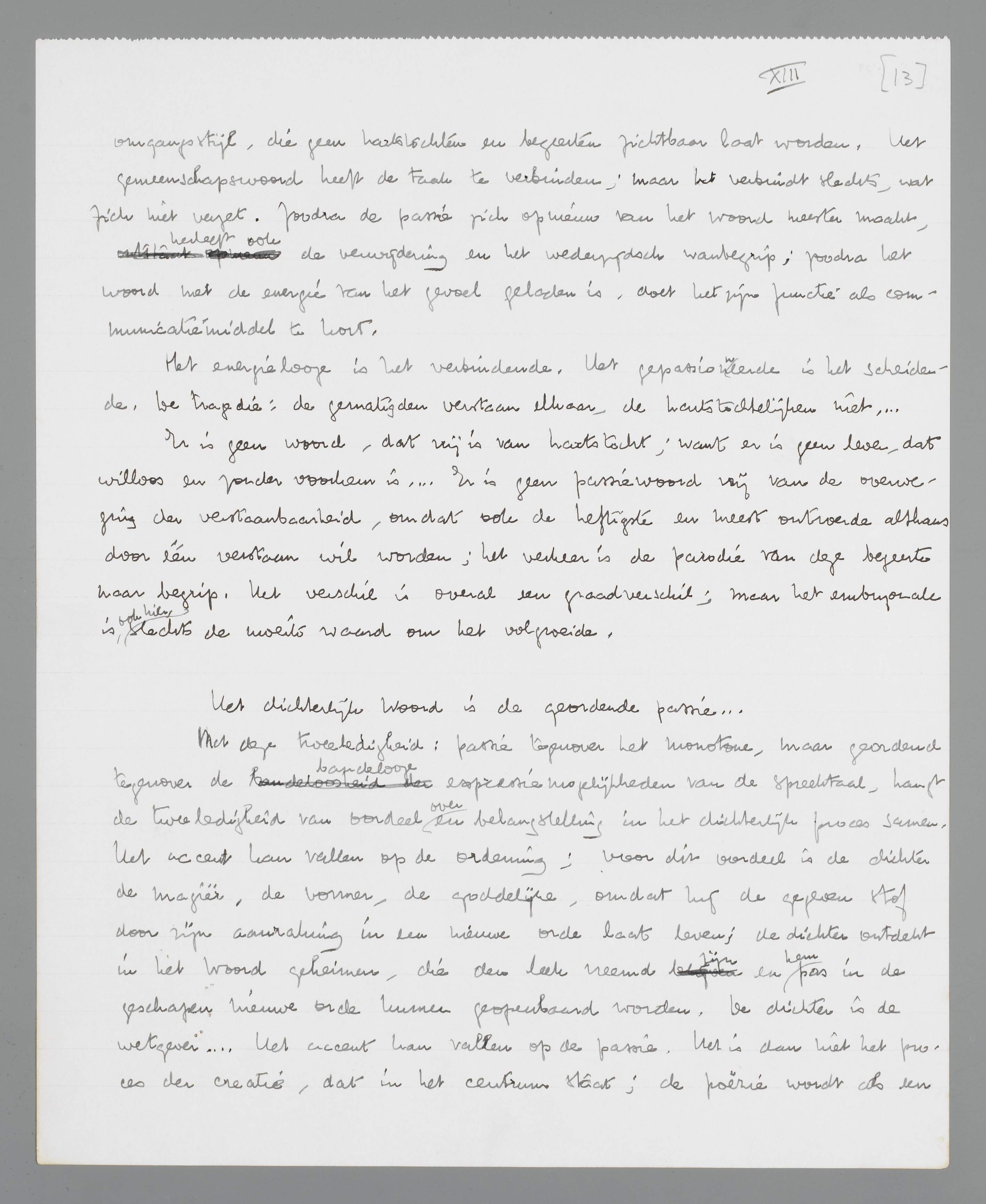 In het nuchtere woord is niets meer gegeven dan de onderscheiding van een ander woord, een andere symbolische klank of een ander symbolisch teeken. Geen twee woorden zijn gelijk, omdat geen twee bedoelingen gelijk zijn. Geen dichter bevrijdt zich van het verlangen naar verstaanbaarheid, geen bureaucraat kan zijn passie geheel verloochenen in het officieele woord. (Is niet de terminologie der ambtenarij vaak een caricatuur van de poëtische ‘onverstaanbaarheid’?). Daarom heeft de onderscheiding van het persoonlijk woord geen andere waarde dan aanleiding te zijn tot onderscheiding van het woord der persoonlijke orde, het dichterlijke.