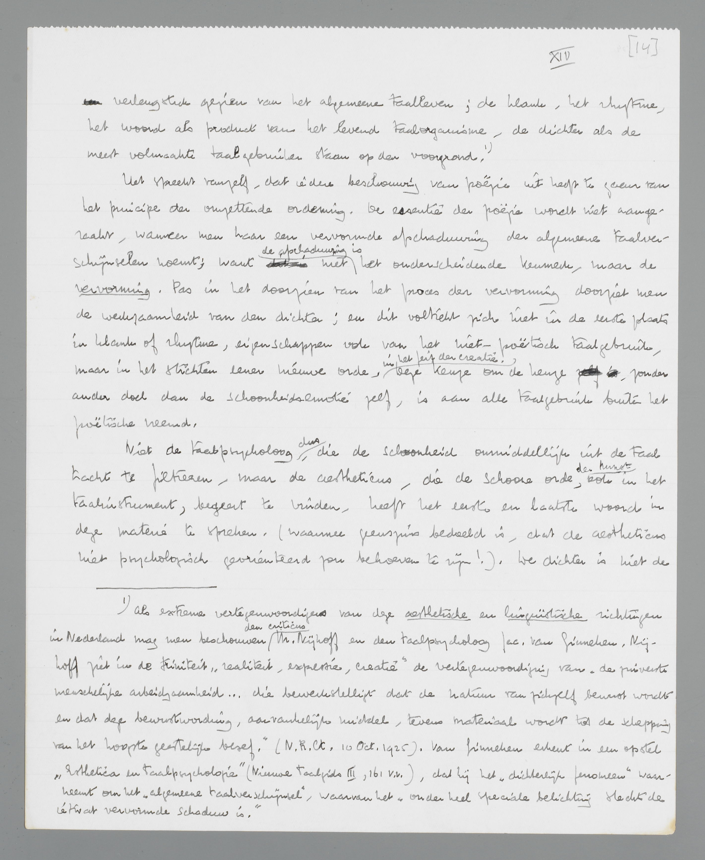 Niet de taalpsycholoog dus, die de schoonheid onmiddellijk uit de taal tracht te filtreeren, maar de aestheticus, die de schoone orde der kunst, ook