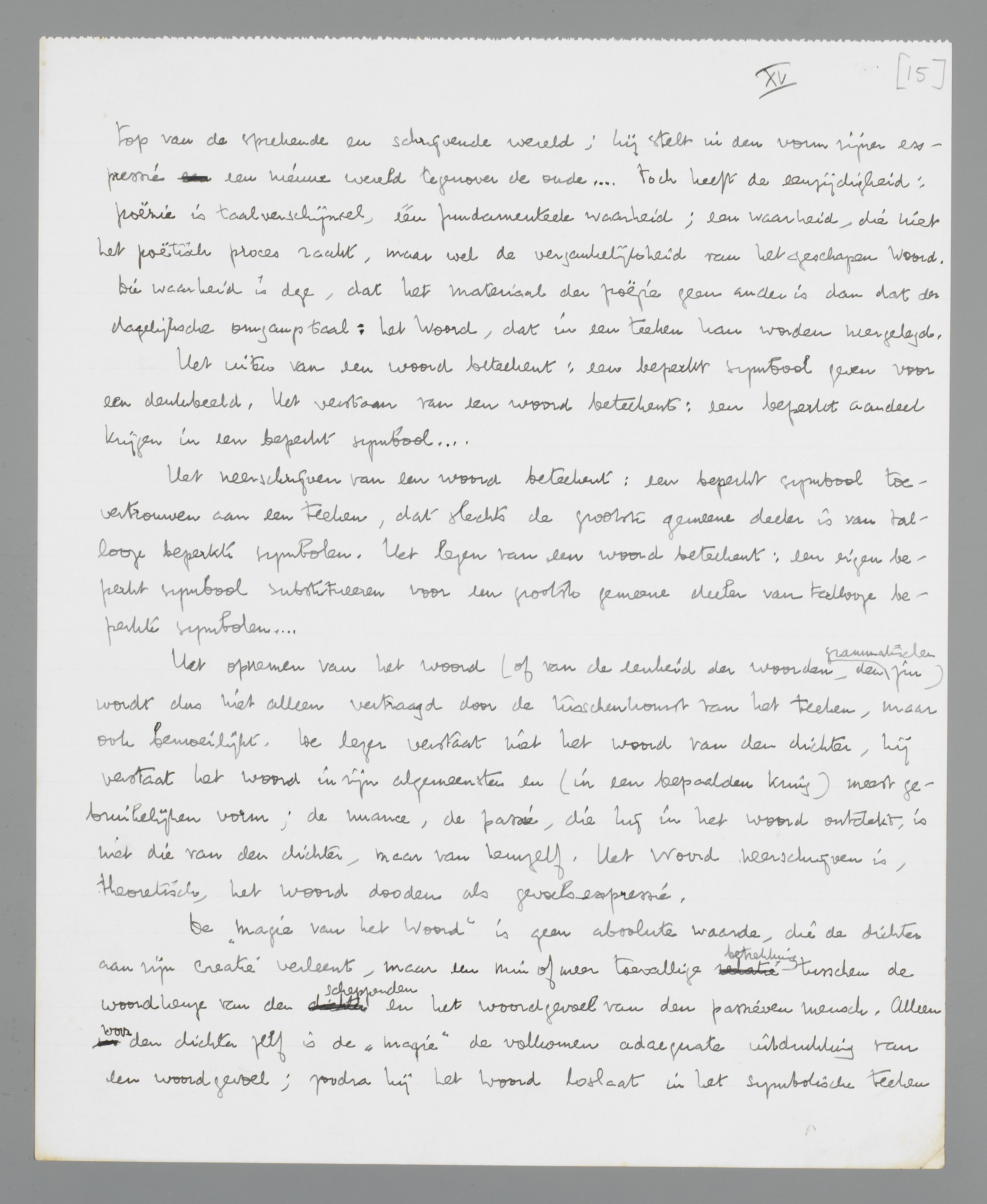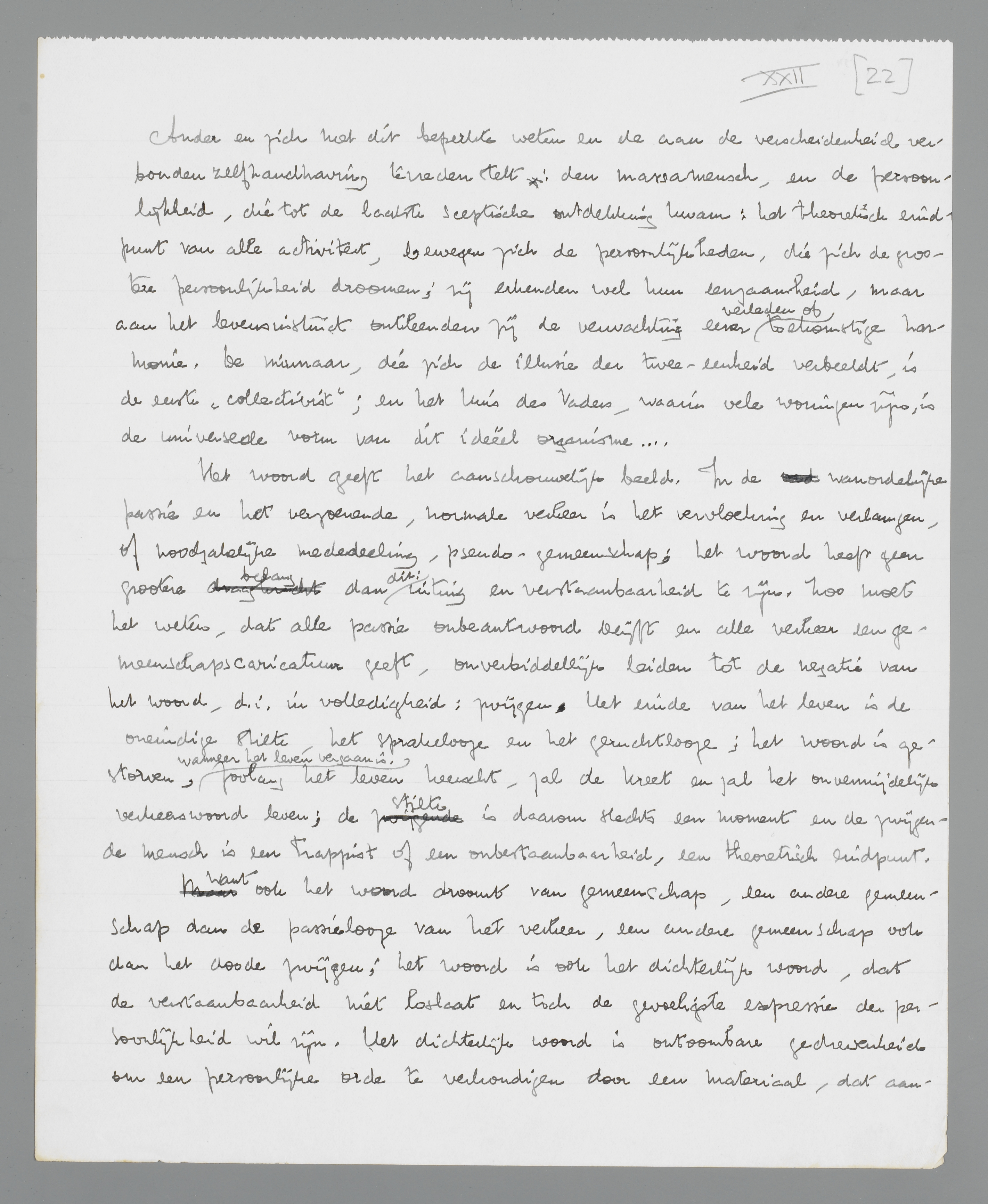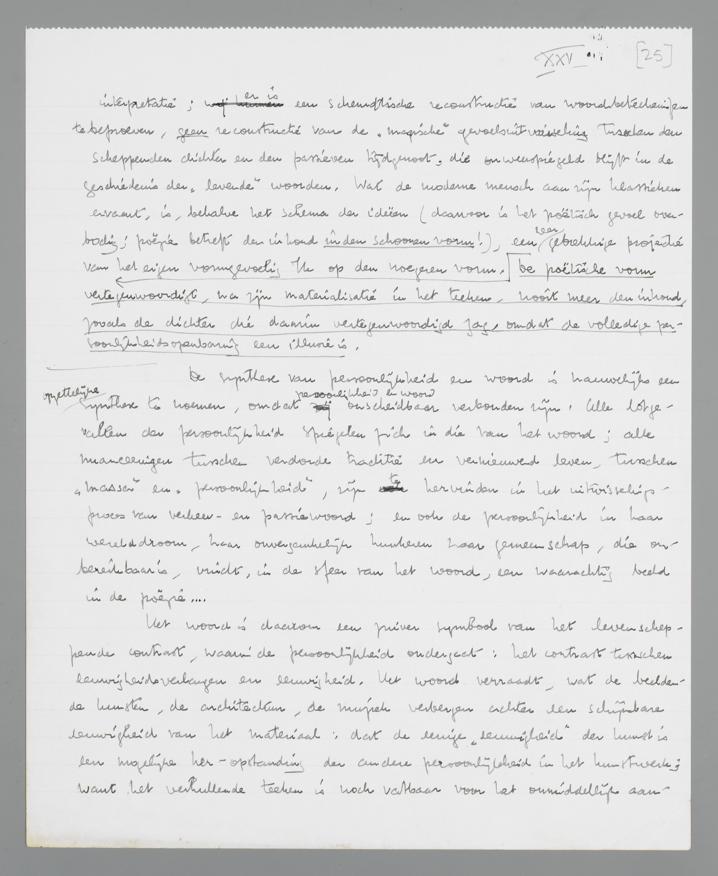 Het woord is een onvolledig en toch zuiver beeld. Onvolledig, omdat het een beperking is en niet meer dan een eenzijdig symbool van het object; zuiver, omdat het uiting is van de persoonlijkheid, die slechts onvolledigheden kent. Er is geen ander woord denkbaar dan het beperkte, omdat geen ander woord denkbaar is dan het persoonlijke. Ook het woord der poëzie heeft geen hoogere en geen geringere waarde dan deze: een beperkte persoonlijkheidsopenbaring te zijn. Alleen in de willekeurige ordening van het willekeurig beperkte woord is de dichter kenbaar...