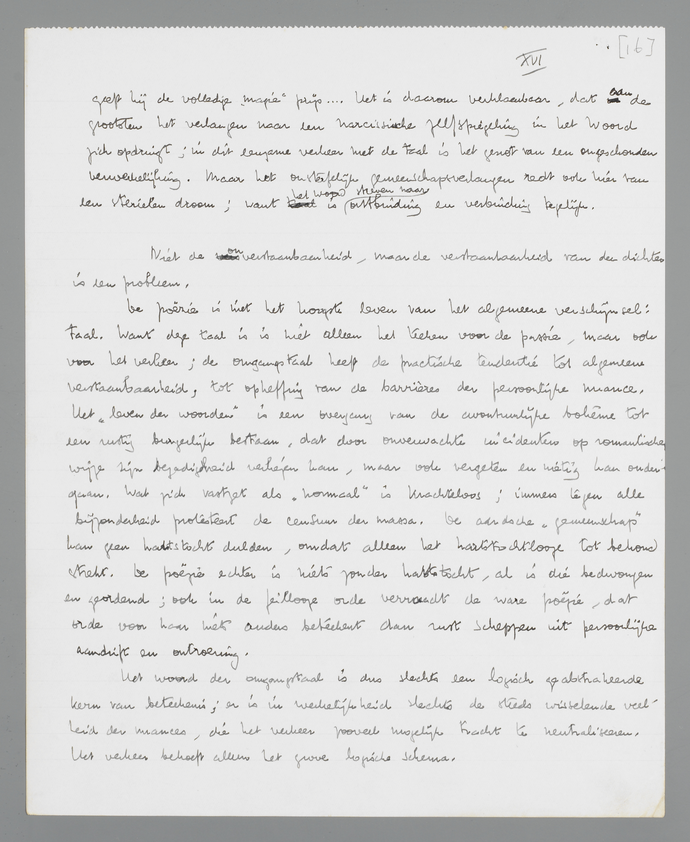 Want ook het woord kan droomen van gemeenschap, een andere gemeenschap dan de passielooze van het verkeer, een andere gemeenschap ook dan het doode zwijgen; het woord is ook het dichterlijk woord, dat de verstaanbaarheid niet loslaat en toch de gevoeligste expressie der persoonlijkheid wil zijn. Het dichterlijk woord is ontoombare gedrevenheid om een persoonlijke orde te verkondigen door een materiaal, dat aanspraak maakt op verstaanbaarheid, op een betrekkelijke algemeenheid.