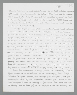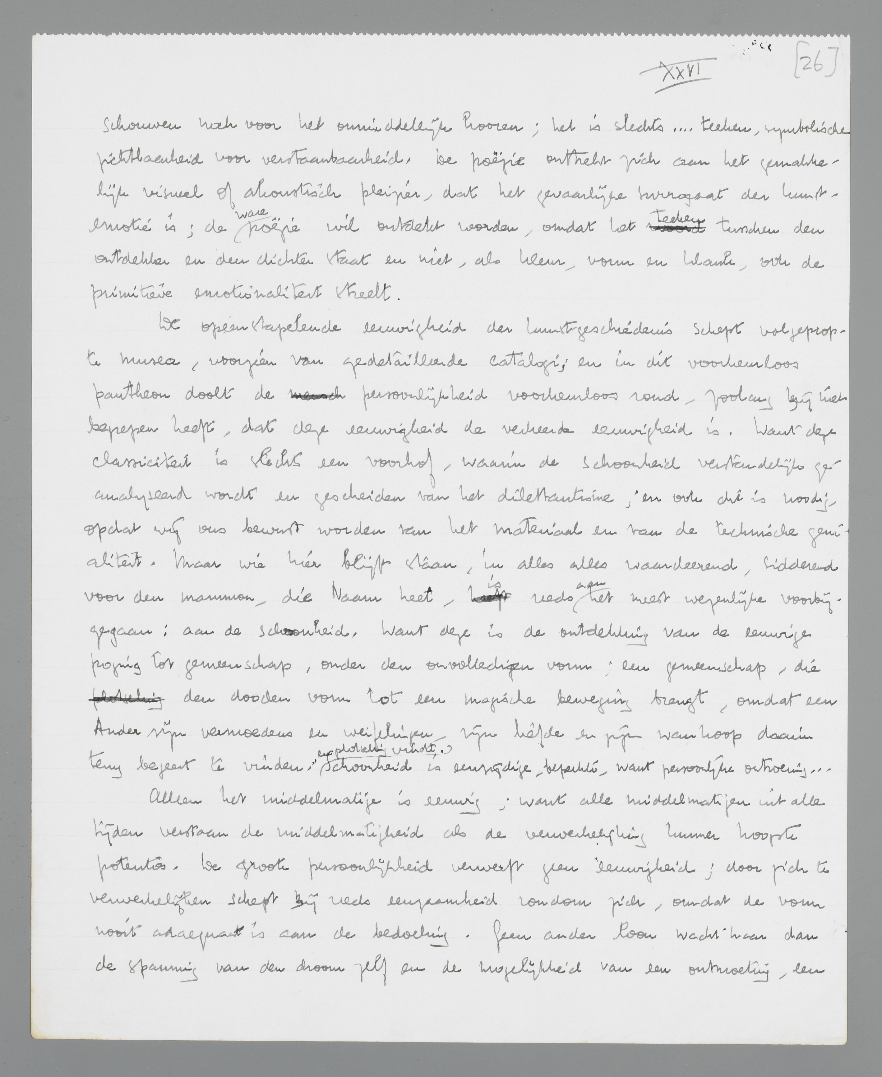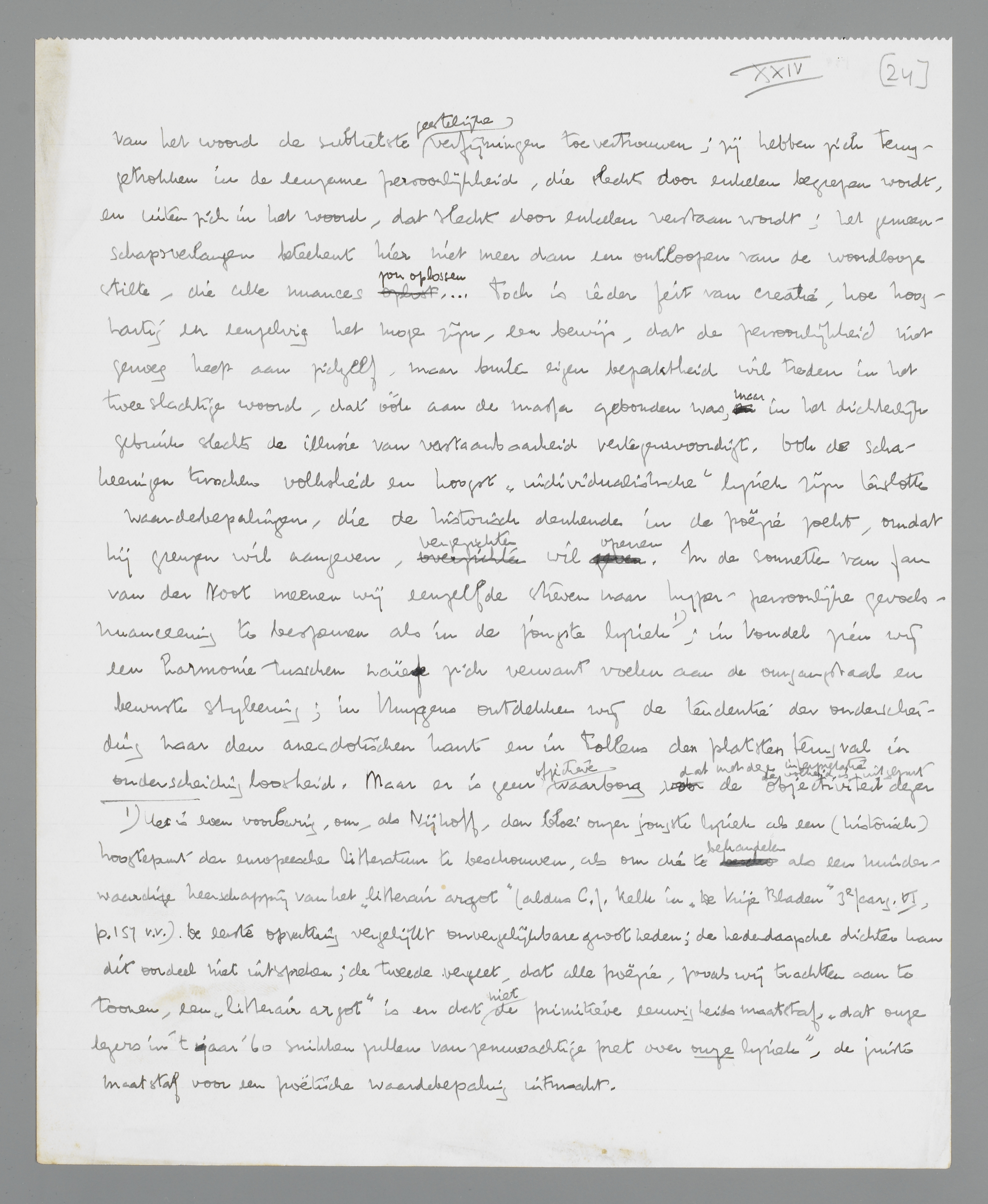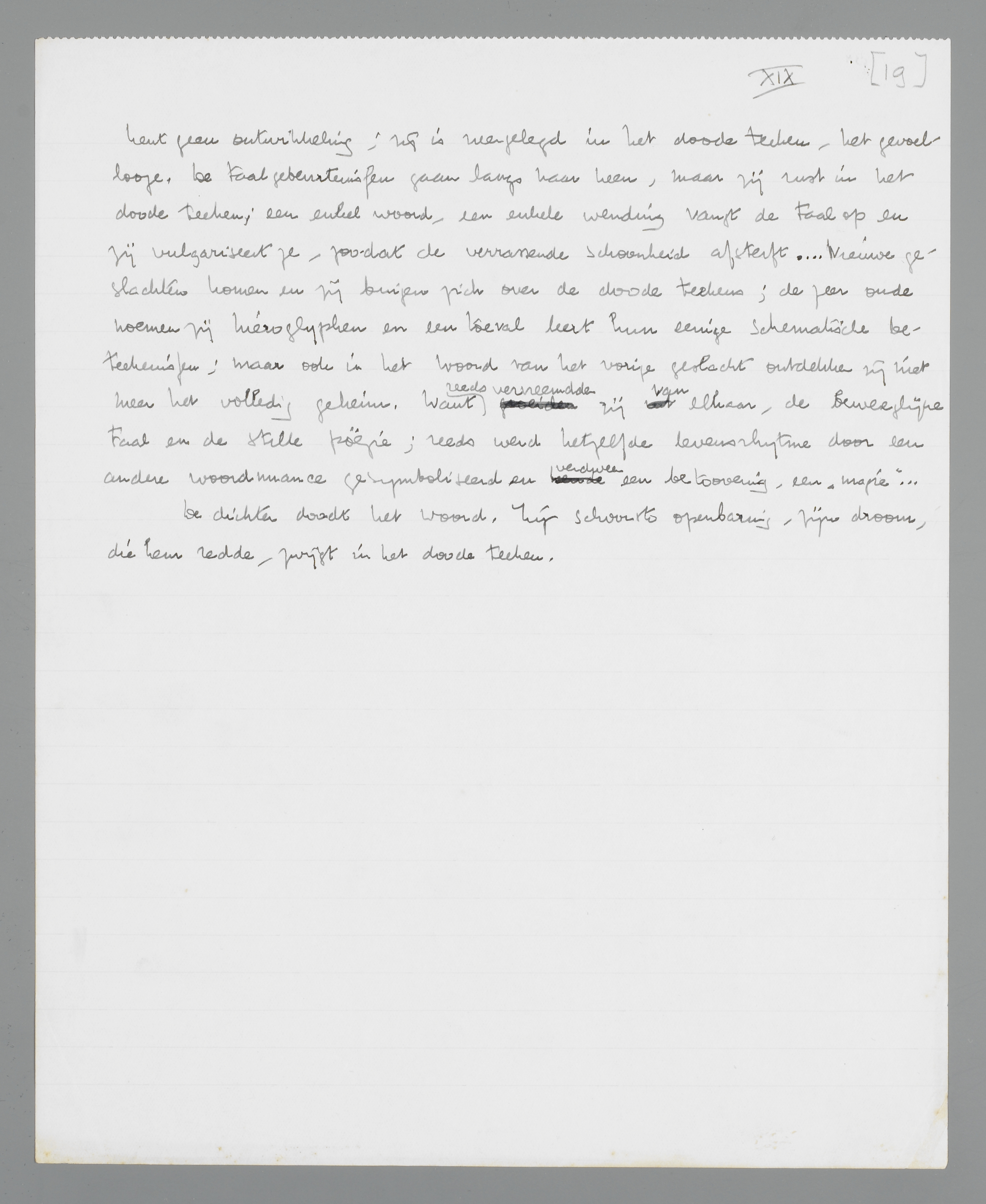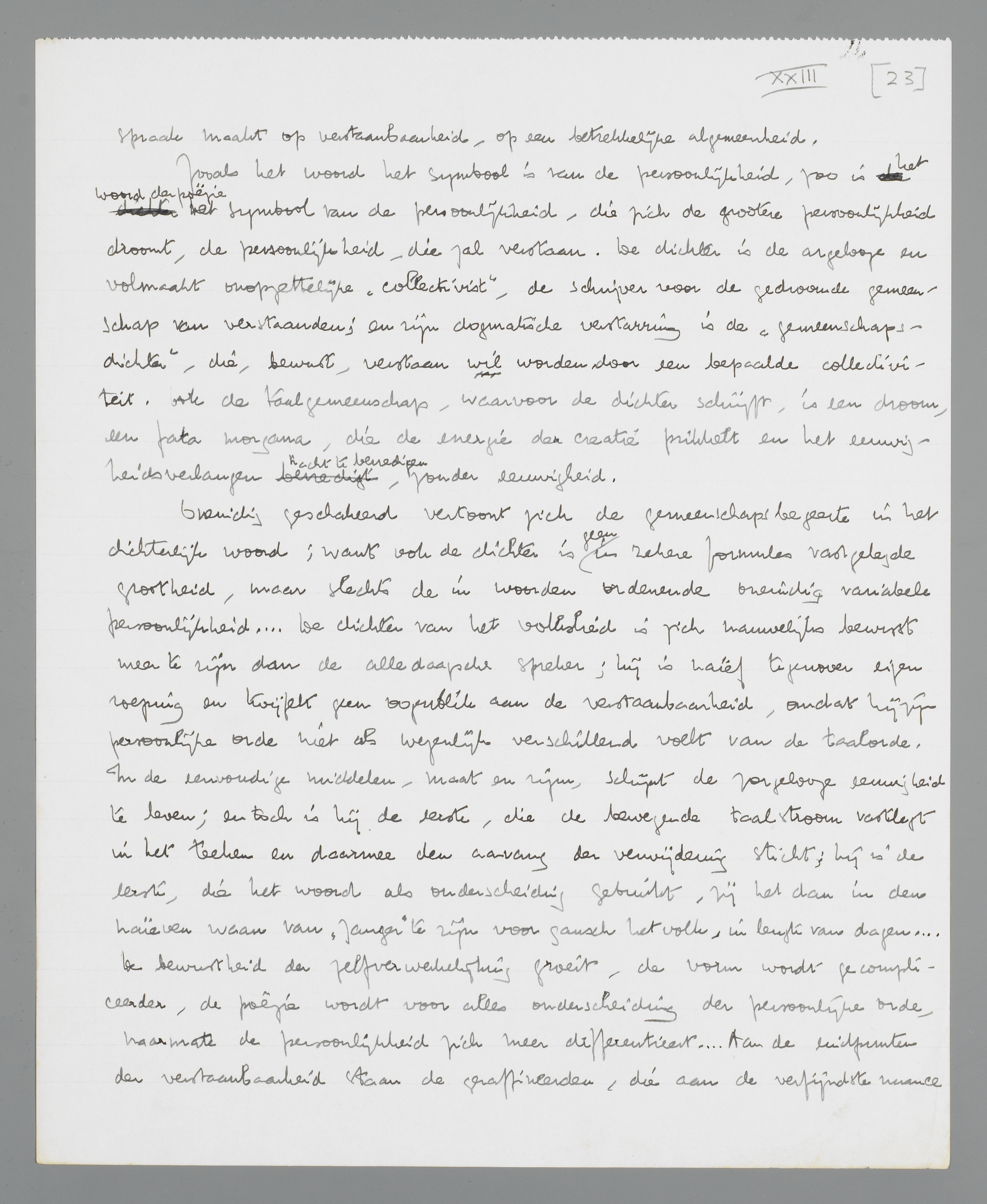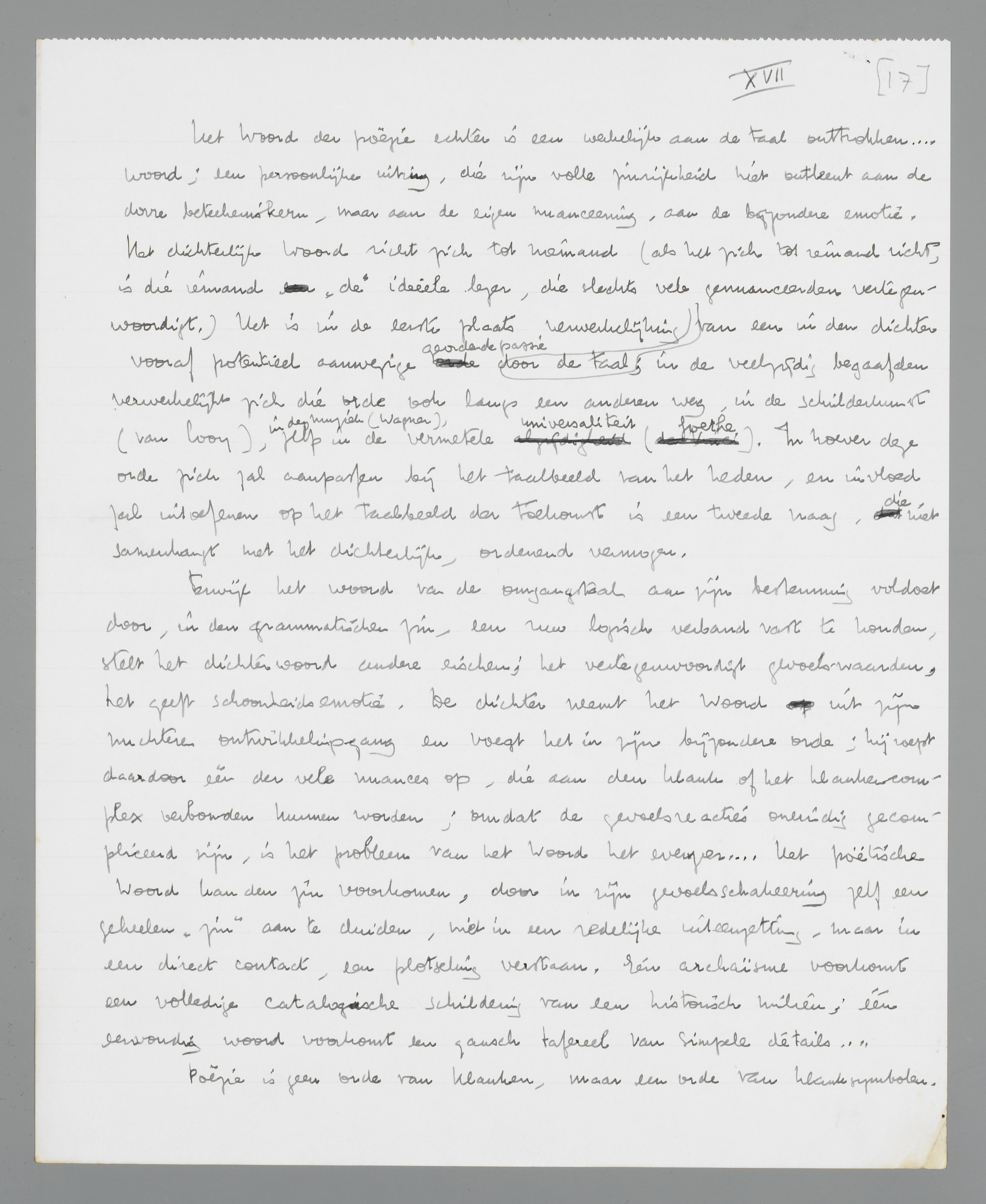 nis hadden, verliezen hun bijzonderheid; het woord, dat eens, door in een stadium van ‘veroudering’ te verkeeren, door het noemen alleen een ironie wakker riep, verdwijnt en kan slechts philologisch als een vage omtrek teruggevonden worden; de woordverbinding, die eens ‘stijl’ heette, wordt onherkenbaar, want algemeen en onpersoonlijk... De poëzie, de neerslag van het genuanceerde, kent geen ontwikkeling; zij is neergelegd in het doode teeken, het gevoellooze. De taalgebeurtenissen gaan langs haar heen, maar zij rust in het doode teeken; een enkel woord, een enkele wending neemt de taal op en zij vulgariseert ze, zoodat de verrassende schoonheid afsterft... Nieuwe geslachten komen en zij buigen zich over de doode teekens; de zeer oude noemen zij hieroglyphen en een toeval leert hun eenige schematische beteekenissen; maar ook in het woord van het vorige geslacht ontdekt het volgende niet meer het volledig geheim. Want reeds vervreemdden zij van elkaar, de beweeglijke taal, de stille poëzie; reeds werd hetzelfde levensrhytme door een andere woordnuance gesymboliseerd en verdween een betoovering, een ‘magie’...