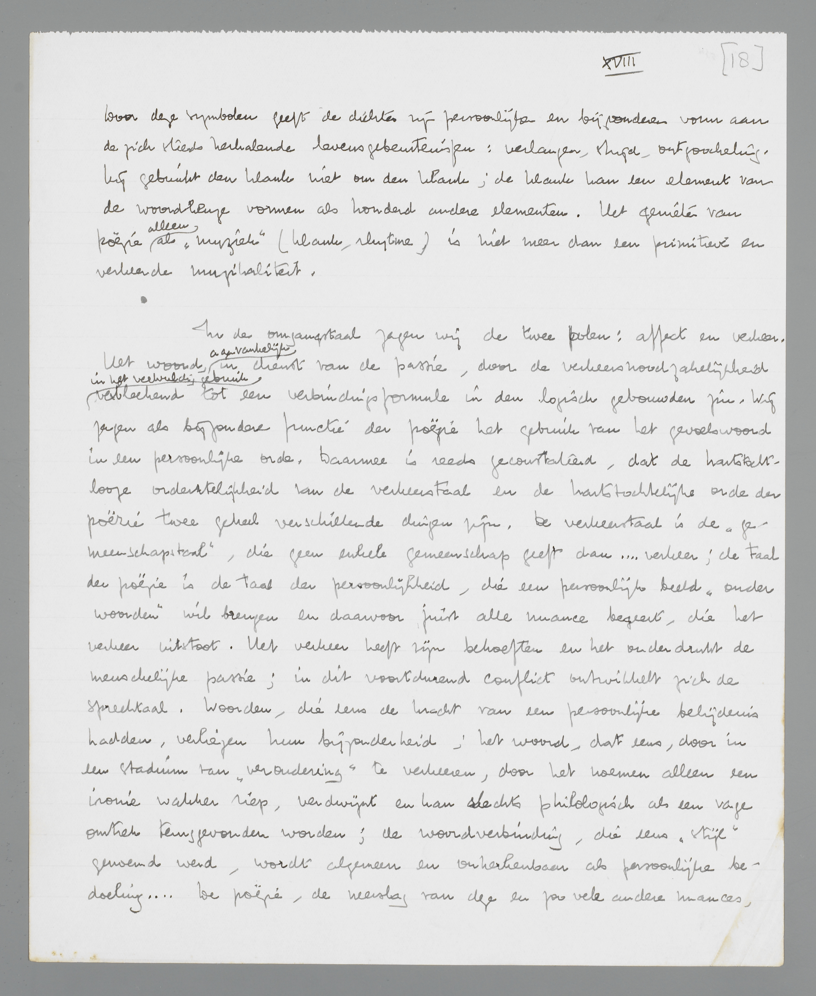 De poëzie is niet het hoogste leven van het algemeene verschijnsel: taal. Want deze taal is, behalve teeken voor de passie, teeken voor het verkeer; de omgangstaal heeft de practische tendentie tot verstaanbaarheid, tot opheffing van de barrières der persoonlijke nuance. Het ‘leven der woorden’ is een overgang van de avontuurlijke bohème tot een rustig en burgerlijk bestaan, dat door onverwachte incidenten op romantische wijze zijn bezadigdheid verliezen kan, maar ook vergeten en nietig kan ondergaan. Wat zich vastzet als ‘normaal’ is niet meer bij machte kracht uit te drukken; immers tegen alle bijzonderheid protesteert de censuur der massa. De aardsche ‘gemeenschap’ kan geen hartstocht dulden, omdat alleen het hartstochtlooze tot behoud van het ‘gemeenschappelijke’ strekt... De poezie echter is niets zonder hartstocht, al is die bedwongen en geordend; ook in de feillooze orde