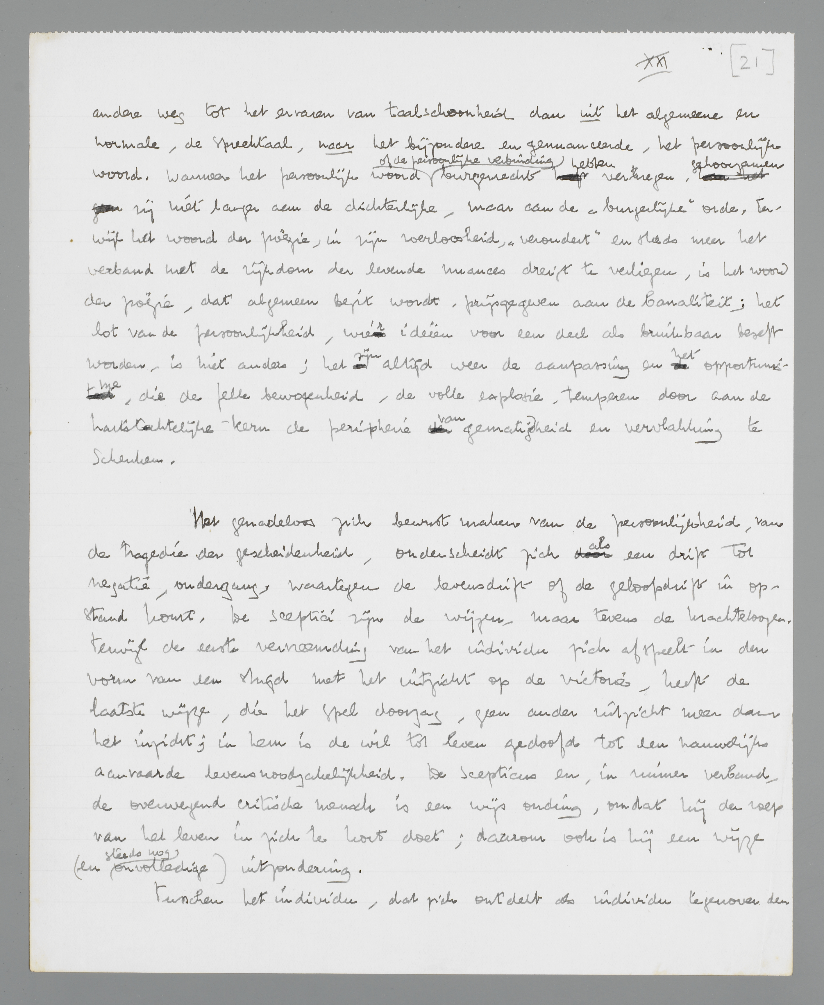 De ondergang der groote persoonlijkheid in de massa, die slechts het bruikbare opneemt na de volledigheid der persoonsopenbaring miskend te hebben, wordt nergens tragischer en zichtbaarder verbeeld dan in de volkomen gelijkenis: den ondergang van het onbeweeglijk dichterlijk woord in de beweeglijke verkeerstaal, het steeds wisselend product van passie en verstaanbaarheid, waarin voor de nuance eener persoonlijke orde geen plaats is... De invloed van Vondel of Bilderdijk op het taalbeeld heeft de taal ‘verrijkt’, maar het instrument van hun dichterschap verarmd; want er is geen andere weg tot het ervaren van taalschoonheid dan uit het algemeene en normale, de spreektaal, naar het bijzondere en genuanceerde, het persoonlijk woord. Wanneer het persoonlijk woord, de persoonlijke nuance, de persoonlijke verbinding burgerrecht hebben verkregen, gehoorzamen zij niet langer aan de dichterlijke, maar aan de ‘burgerlijke’ orde. Terwijl het woord der poëzie, in zijn roerloosheid, ‘veroudert’ en steeds meer het verband met den rijkdom der levende nuances dreigt te verliezen, is het woord der poëzie, dat algemeen taalbezit wordt, prijsgegeven aan de banaliteit; het lot van de persoonlijkheid, wier ideeën voor een deel bruikbaar worden bevonden, is niet anders. Het zijn