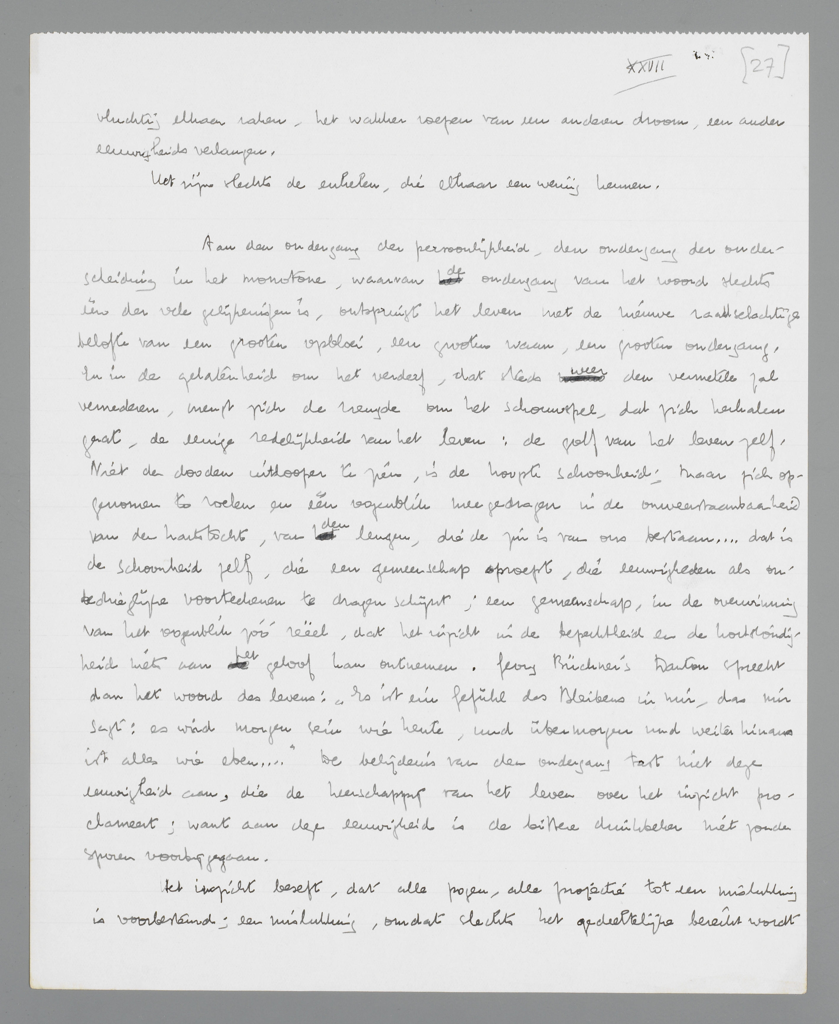 Aan den ondergang der persoonlijkheid, den ondergang der onderscheiding in het monotone, waarvan de ondergang van het woord slechts één der vele gelijkenissen is, ontspringt het leven met de nieuwe raadselachtige belofte van een grooten opbloei, een grooten waan, een grooten ondergang. En in de gelatenheid om het verderf, dat steeds weer den vermetele zal vernederen, mengt zich de vreugde om het schouwspel, dat zich herhalen gaat, de eenige redelijkheid van het leven: de golf van het leven zelf. Niet den dooden uitlooper te zien is de hoogste vervulling; maar zich opgenomen te voelen en één oogenblik meegesleurd in den onweerstaanbaren hartstocht, van den droom, die de zin is van ons bestaan... dat is de schoonheid, die een gemeenschap oproept, die eeuwigheden als onbe-