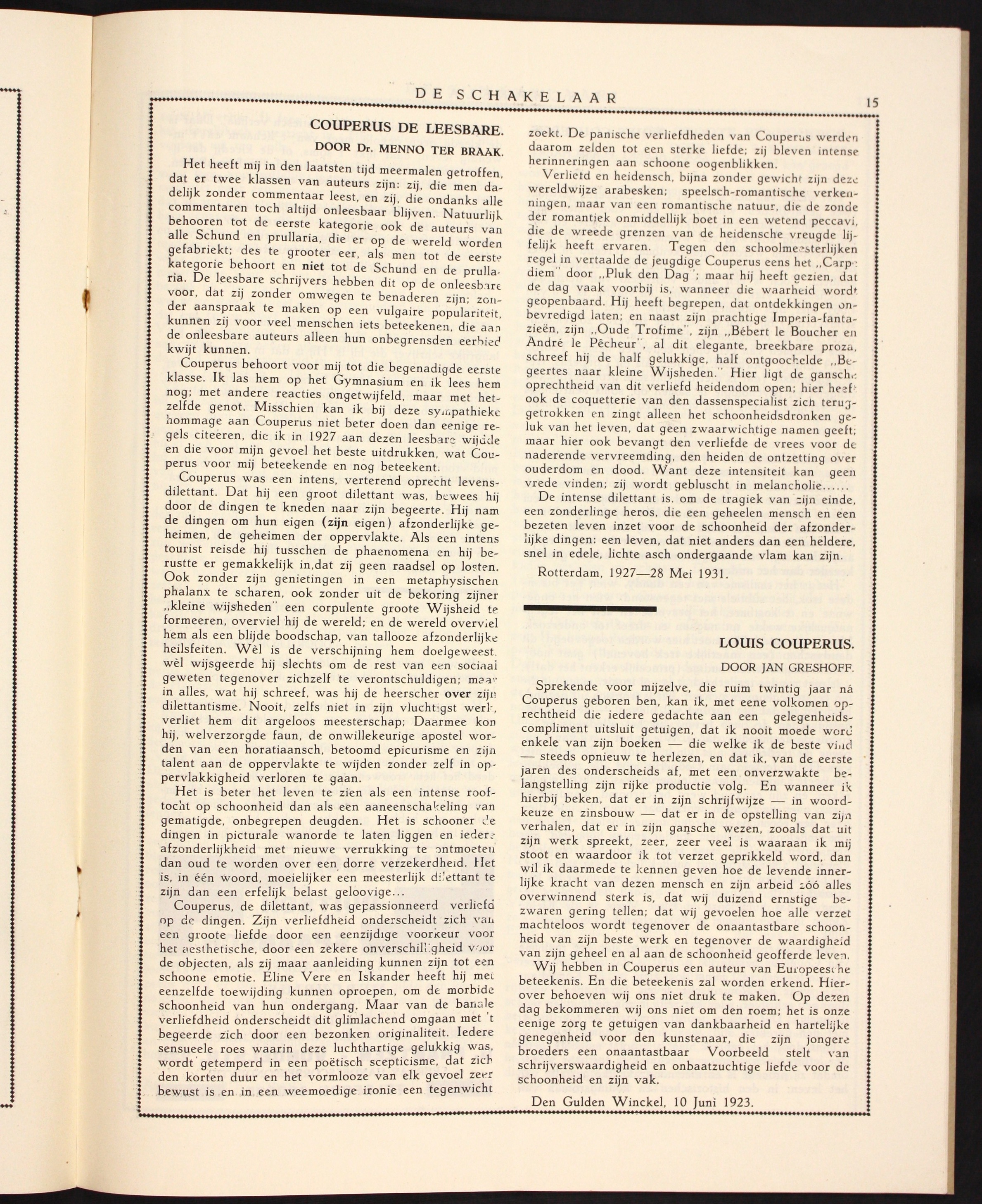 Couperus behoort voor mij tot die begenadigde eerste klasse. Ik las hem op het Gymnasium en ik lees hem nog; met andere reacties ongetwijfeld, maar met hetzelfde genot. Misschien kan ik bij deze sympathieke hommage aan Couperus niet beter doen dan eenige regels citeeren, die ik in 1927 aan dezen leesbare wijdde en die voor mijn gevoel het beste uitdrukken, wat Couperus voor mij beteekende en nog beteekent.