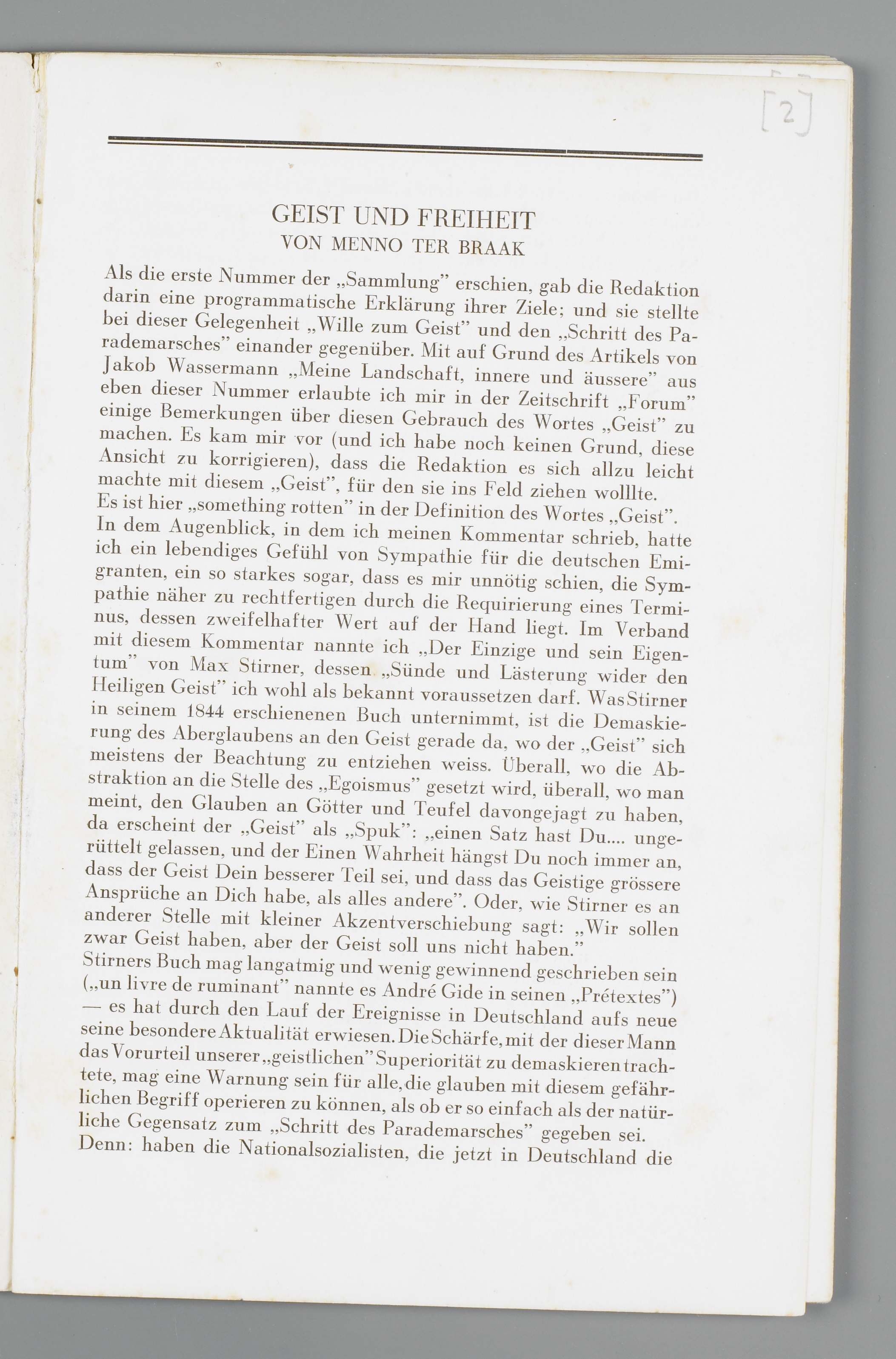 Als die erste Nummer der ‘Sammlung’ erschien, gab die Redaktion darin eine programmatische Erklärung ihrer Ziele; und sie stellte bei dieser Gelegenheit ‘Wille zum Geist’ und den ‘Schritt des Parademarsches’ einander gegenüber. Mit auf Grund des Artikels von Jakob Wassermann ‘Meine Landschaft, innere und äussere’ aus eben dieser Nummer erlaubte ich mir in der Zeitschrift ‘Forum’ einige Bemerkungen über diesen Gebrauch des Wortes ‘Geist’ zu machen. Es kam mir vor (und ich habe noch keinen Grund, diese Ansicht zu korrigieren), dass die Redaktion es sich allzu leicht machte mit diesem ‘Geist’, für den sie ins Feld ziehen wolllte. Es ist hier ‘something rotten’ in der Definition des Wortes ‘Geist’. In dem Augenblick, in dem ich meinen Kommentar schrieb, hatte ich ein lebendiges Gefühl von Sympathie für die deutschen Emigranten, ein so starkes sogar, dass es mir unnötig schien, die Sympathie näher zu rechtfertigen durch die Requirierung eines Terminus, dessen zweifelhafter Wert auf der Hand liegt. Im Verband mit diesem Kommentar nannte ich ‘Der Einzige und sein Eigentum’ von Max Stirner, dessen ‘Sünde und Lästerung wider den Heiligen Geist’ ich wohl als bekannt voraussetzen darf. Was Stirner in seinem 1844 erschienenen Buch unternimmt, ist die Demaskierung des Aberglaubens an den Geist gerade da, wo der ‘Geist’ sich meistens der Beachtung zu entziehen weiss. Überall, wo die Abstraktion an die Stelle des ‘Egoismus’ gesetzt wird, überall, wo man meint, den Glauben an Götter und Teufel davongejagt zu haben, da erscheint der ‘Geist’ als ‘Spuk’: ‘einen Satz hast Du.... ungerüttelt gelassen, und der Einen Wahrheit hängst Du noch immer an, dass der Geist Dein besserer Teil sei, und dass das Geistige grössere Ansprüche an Dich habe, als alles andere’. Oder, wie Stirner es an anderer Stelle mit kleiner Akzentverschiebung sagt: ‘Wir sollen zwar Geist haben, aber der Geist soll uns nicht haben.’