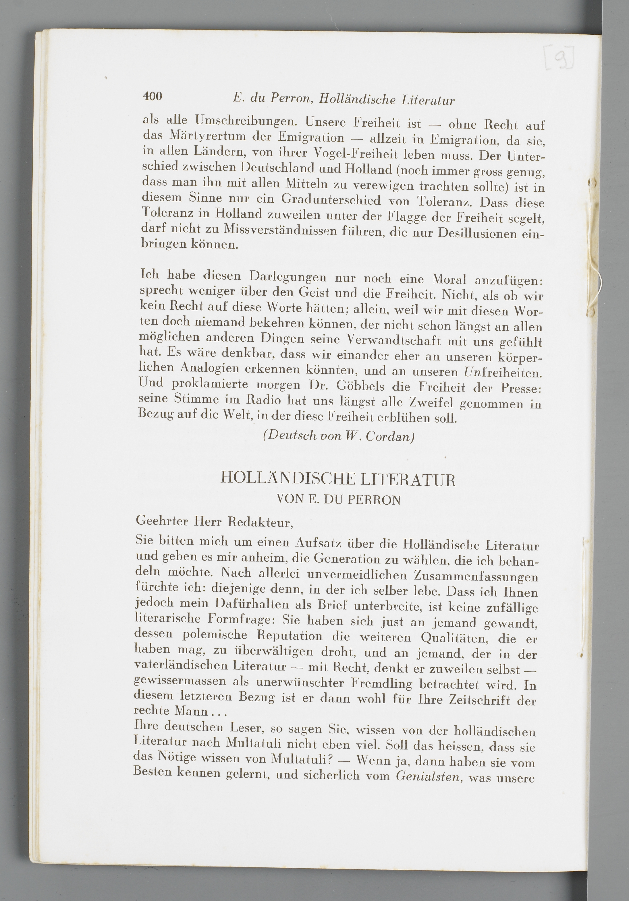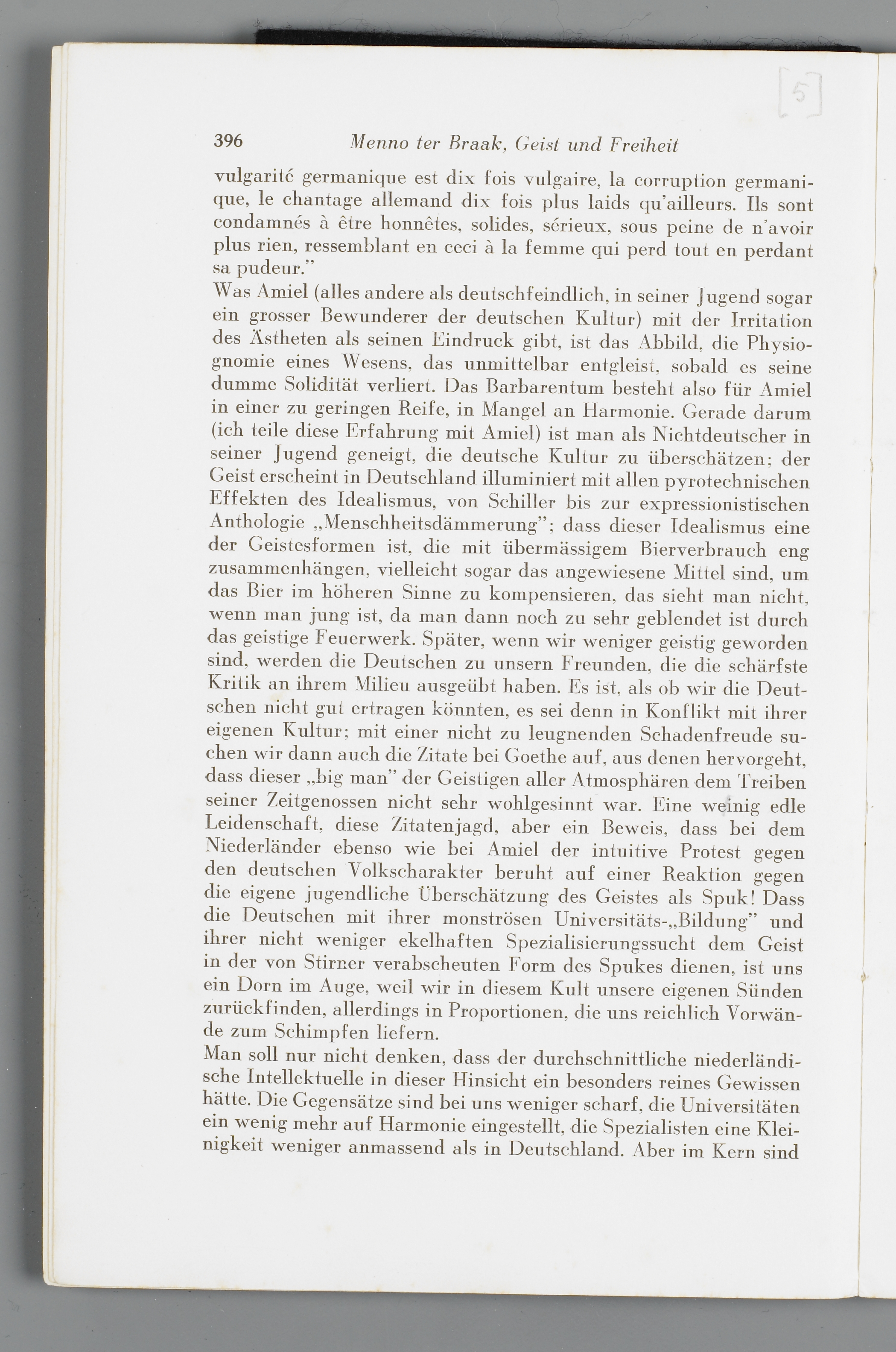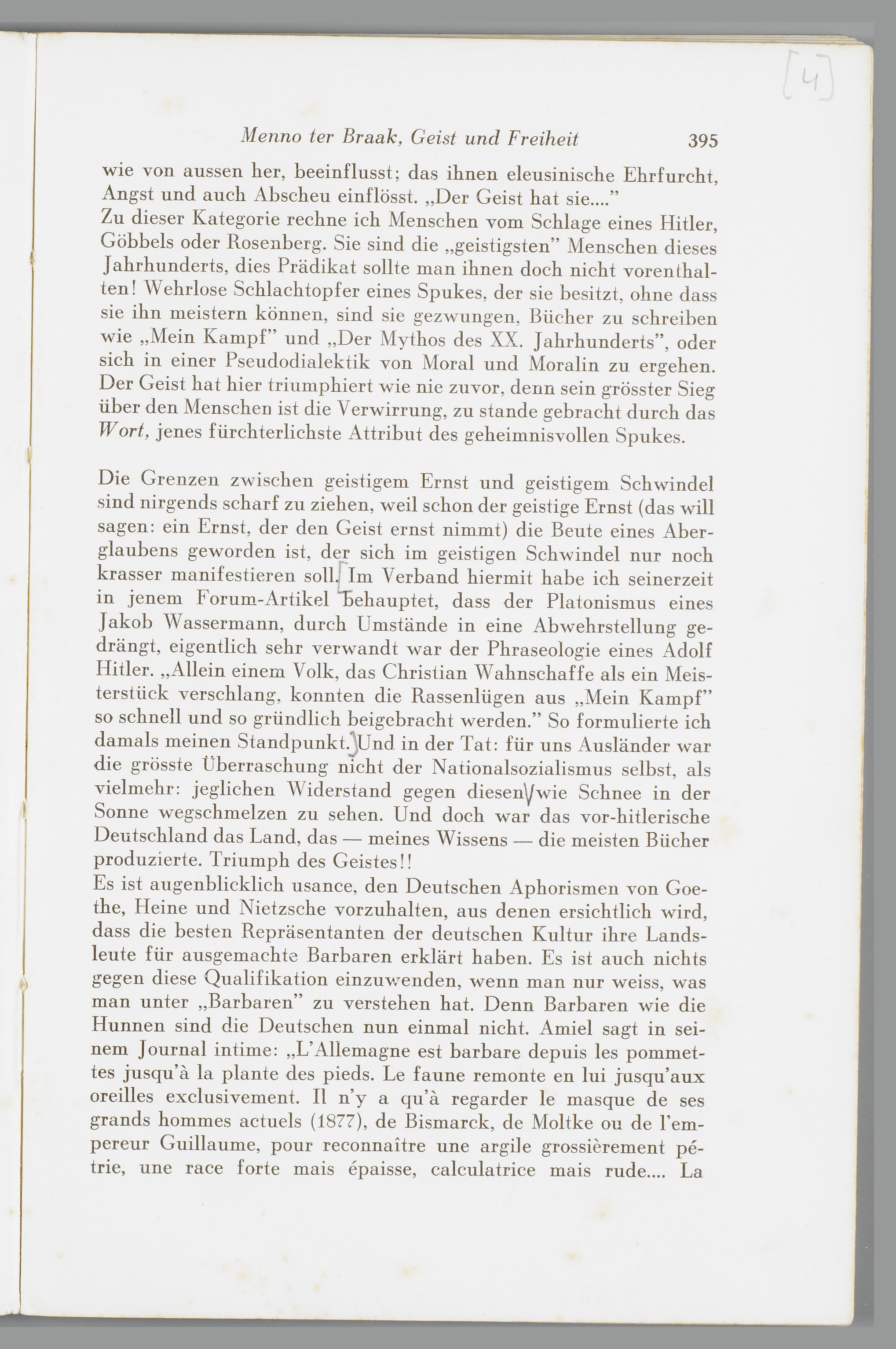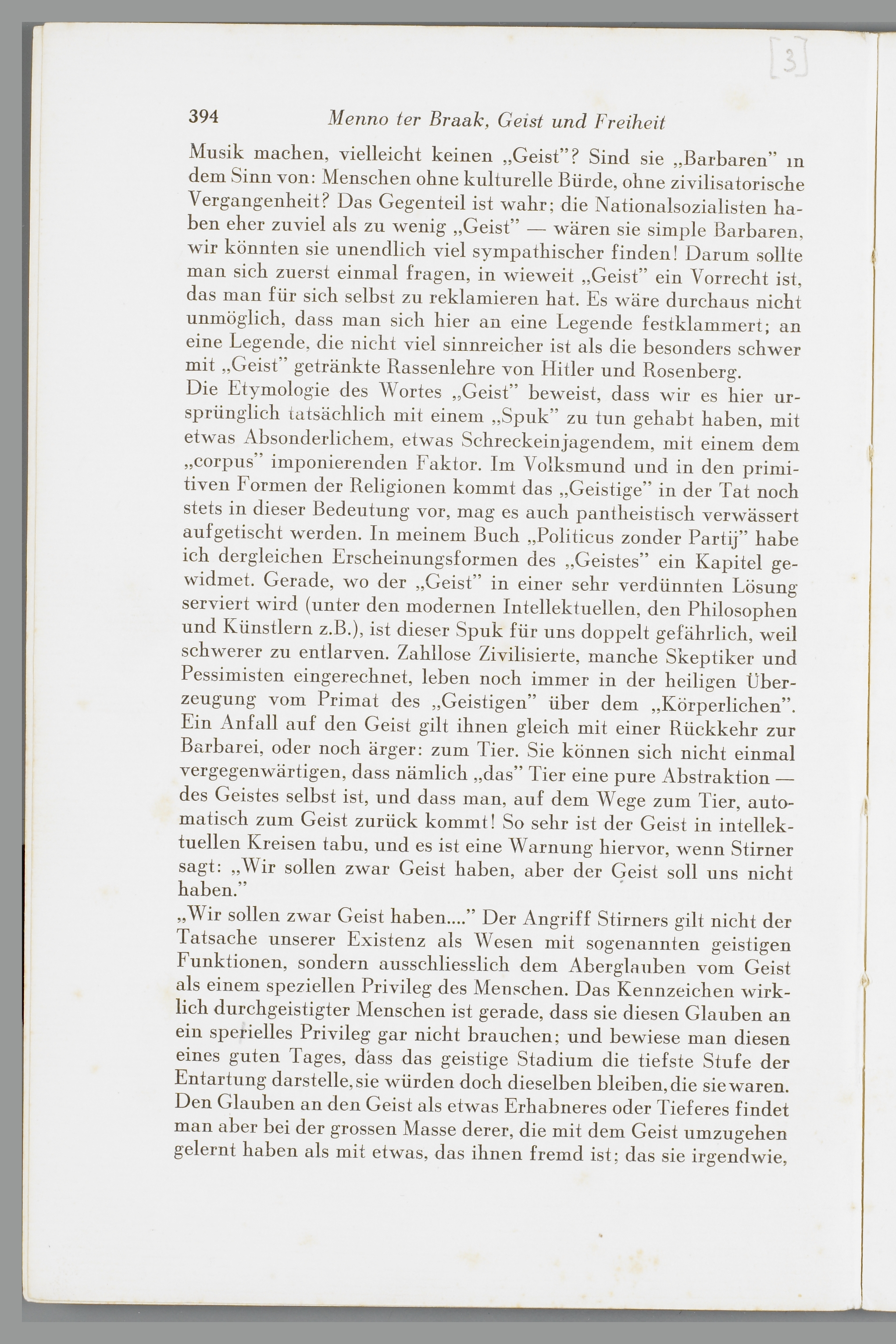 Man soll nur nicht denken, dass der durchschnittliche niederländische Intellektuelle in dieser Hinsicht ein besonders reines Gewissen hätte. Die Gegensätze sind bei uns weniger scharf, die Universitäten ein wenig mehr auf Harmonie eingestellt, die Spezialisten eine Kleinigkeit weniger anmassend als in Deutschland. Aber im Kern sind die geistigen Verhältnisse dieselben, und unsere Abneigung gegen die deutschen Barbaren gilt, ich bin davon überzeugt, dem Geist, der hier in Holland blüht und sich an der Illusion der gallischen Einflüsse erwärmt, auf die wir unsere Superiorität stützen möchten. Dass unsere Intellektuellen sich weniger schnell durch Hitlers ‘Mein Kampf’ anführen lassen als ihre deutschen Kollegen, beweist noch nicht, dass sie in geringerem Masse Stirners Spuk verfallen sind; denn jedes Volk hat seinen eigenen ‘Geist’, seinen eigenen Spuk, seine eigene Bibel.