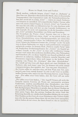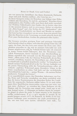 Denn: haben die Nationalsozialisten, die jetzt in Deutschland die Musik machen, vielleicht keinen ‘Geist’? Sind sie ‘Barbaren’ in dem Sinn von: Menschen ohne kulturelle Bürde, ohne zivilisatorische Vergangenheit? Das Gegenteil ist wahr; die Nationalsozialisten haben eher zuviel als zu wenig ‘Geist’ - wären sie simple Barbaren, wir könnten sie unendlich viel sympathischer finden! Darum sollte man sich zuerst einmal fragen, in wieweit ‘Geist’ ein Vorrecht ist, das man für sich selbst zu reklamieren hat. Es wäre durchaus nicht unmöglich, dass man sich hier an eine Legende festklammert; an eine Legende, die nicht viel sinnreicher ist als die besonders schwer mit ‘Geist’ getränkte Rassenlehre von Hitler und Rosenberg.