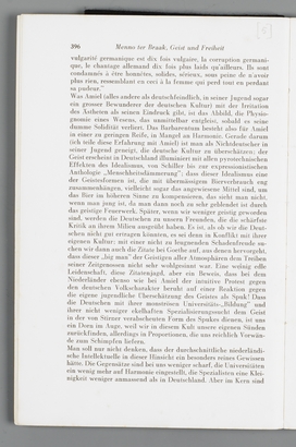 Was Amiel (alles andere als deutschfeindlich, in seiner Jugend sogar ein grosser Bewunderer der deutschen Kultur) mit der Irritation des Ästheten als seinen Eindruck gibt, ist das Abbild, die Physiognomie eines Wesens, das unmittelbar entgleist, sobald es seine dumme Solidität verliert. Das Barbarentum besteht also für Amiel in einer zu geringen Reife, in Mangel an Harmonie. Gerade darum (ich teile diese Erfahrung mit Amiel) ist man als Nichtdeutscher in seiner Jugend geneigt, die dentschc Kultur zu überschätzen; der Geist erscheint in Deutschland illuminiert mit allen pyrotechnischen Effekten des Idealismus, von Schiller bis zur expressionistischen Anthologie ‘Menschheitsdämmerung’; dass dieser Idealismus eine der Geistesformen ist, die mit übermässigem Bierverbrauch eng zusammenhängen, vielleicht sogar das angewiesene Mittel sind, um das Bier im höheren Sinne zu kompensieren, das sieht man nicht, wenn man jung ist, da man dann noch zu sehr geblendet ist durch das geistige Feuerwerk. Später, wenn wir weniger geistig geworden sind, werden die Deutschen zu unsern Freunden, die die schärfste Kritik an ihrem Milieu ausgeübt haben. Es ist, als ob wir die Deutschen nicht gut ertragen könnten, es sei denn in Konflikt mit ihrer eigenen Kultur; mit einer nicht zu leugnenden Schadenfreude suchen wir dann auch die Zitate bei Goethe auf, aus denen hervorgeht, dass dieser ‘big man’ der Geistigen aller Atmosphären dem Treiben seiner Zeitgenossen nicht sehr wohlgesinnt war. Eine wenig edle Leidenschaft, diese Zitatenjagd, aber ein Beweis, dass bei dem Niederländer ebenso wie bei Amiel der intuitive Protest gegen den deutschen Volkscharakter beruht auf einer Reaktion gegen die eigene jugendliche Überschätzung des Geistes als Spuk! Dass die Deutschen mit ihrer monströsen Universitäts-‘Bildung’ und ihrer nicht weniger ekelhaften Spezialisierungssucht dem Geist in der von Stirner verabscheuten Form des Spukes dienen, ist uns ein Dorn im Auge, weil wir in diesem Kult unsere eigenen Sünden zurückfinden, allerdings in Proportionen, die uns reichlich Vorwände zum Schimpfen liefern.