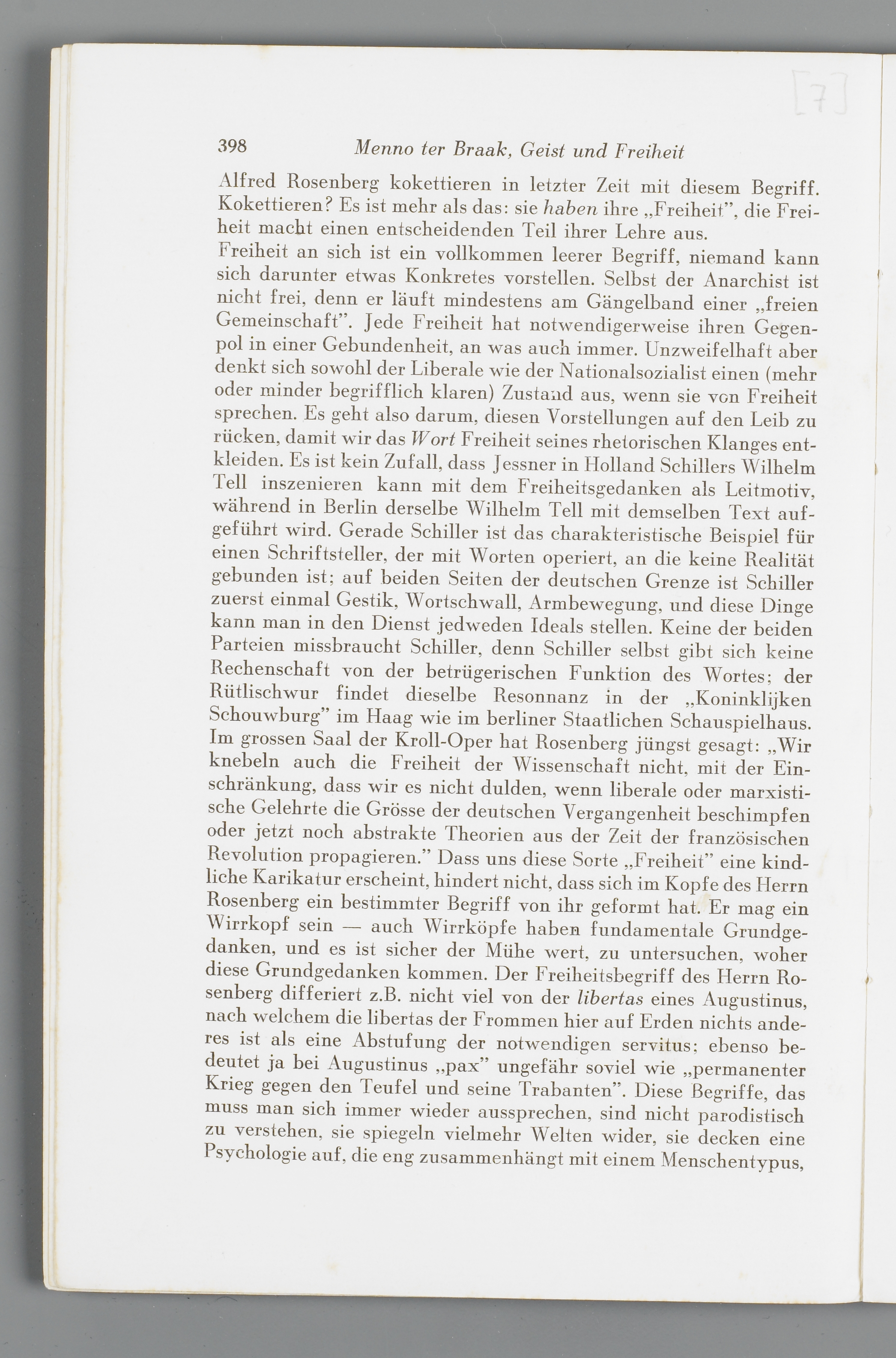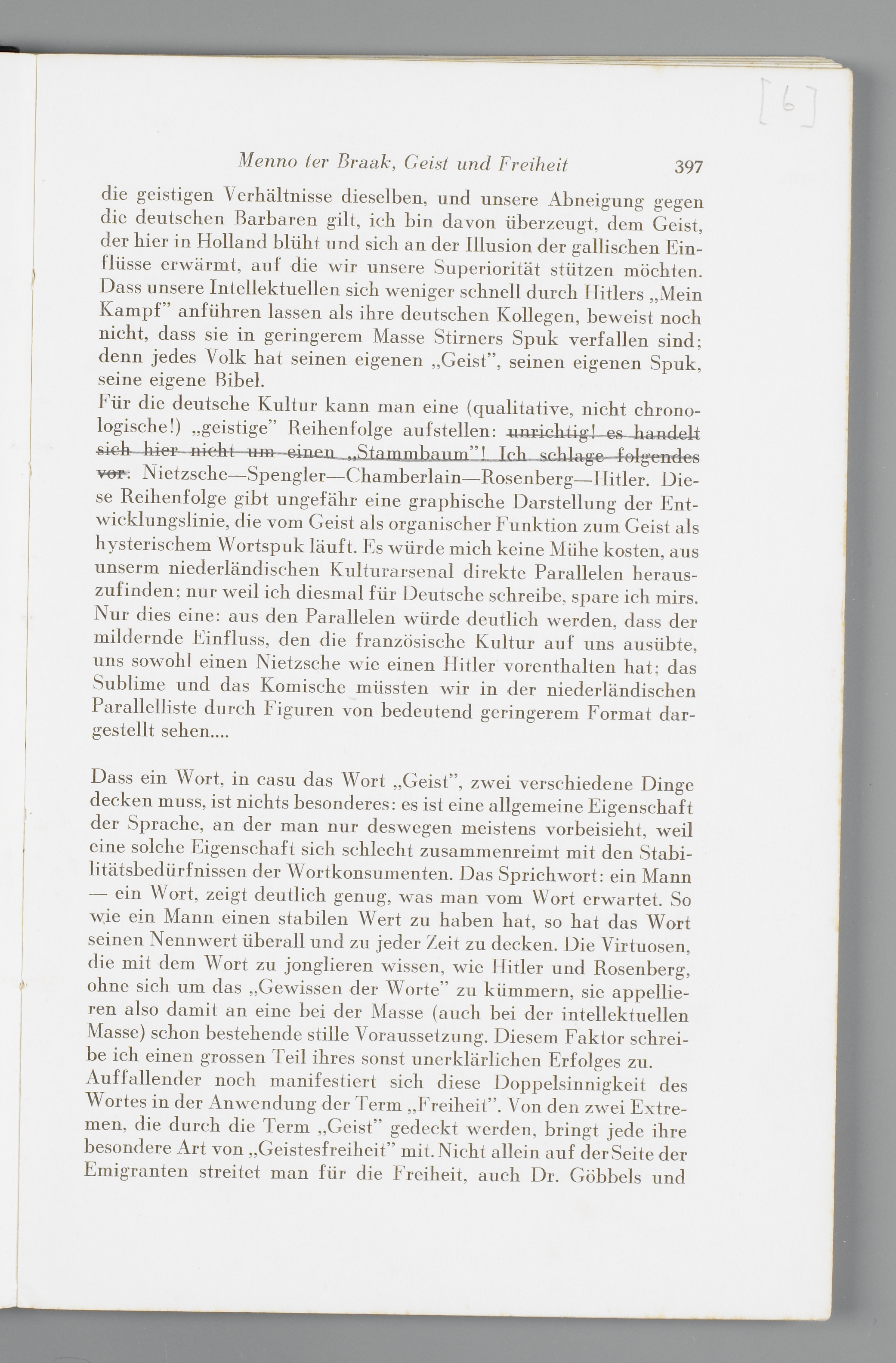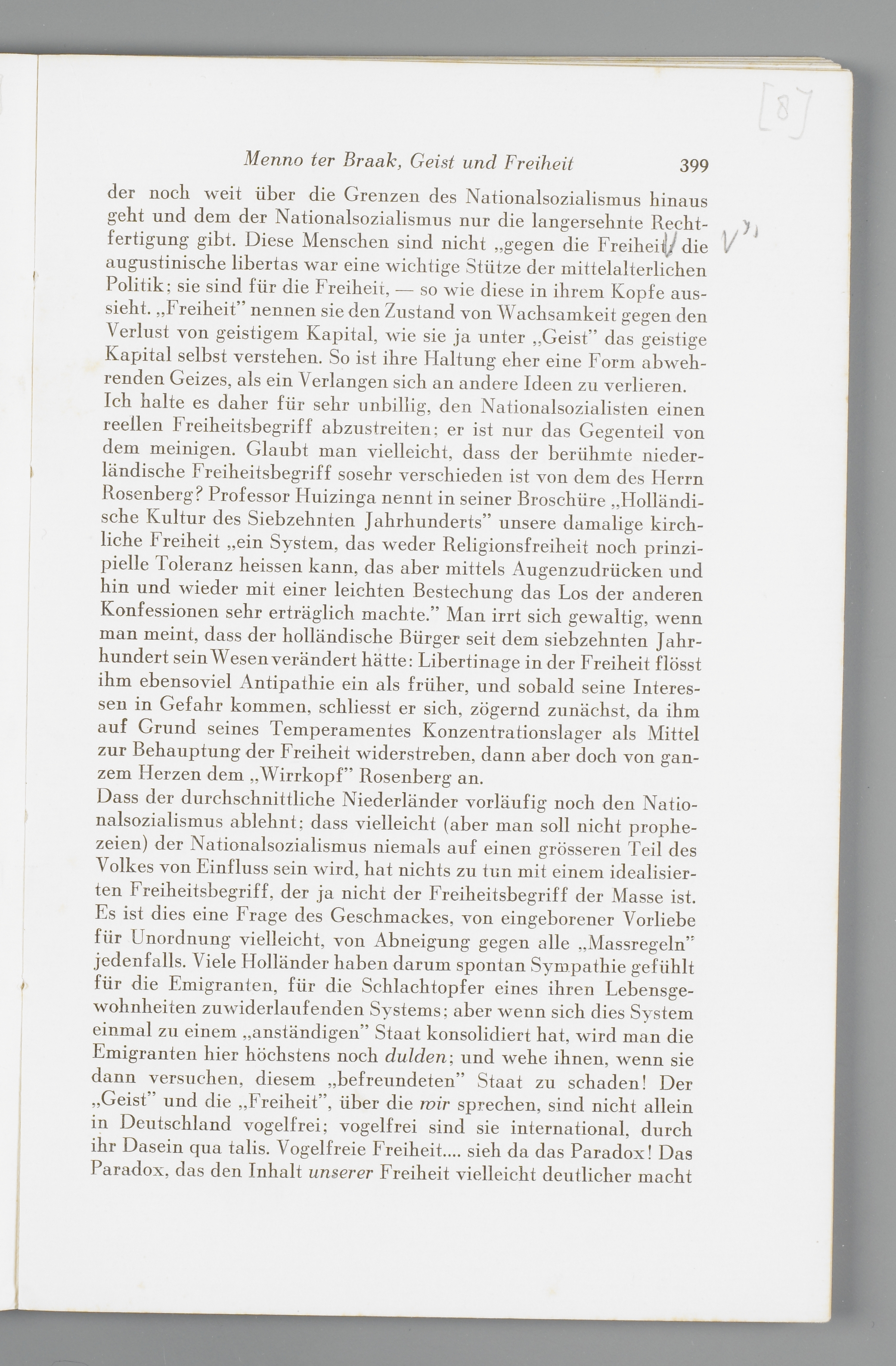 Ich halte es daher für sehr unbillig, den Nationalsozialisten einen reellen Freiheitsbegriff abzustreiten; er ist nur das Gegenteil von dem meinigen. Glaubt man vielleicht, dass der berühmte niederländische Freiheitsbegriff sosehr verschieden ist von dem des Herrn Rosenberg? Professor Huizinga nennt in seiner Broschüre ‘Holländische Kultur des Siebzehnten Jahrhunderts’ unsere damalige kirchliche Freiheit ‘ein System, das weder Religionsfreiheit noch prinzipielle Toleranz heissen kann, das aber mittels Augenzudrücken und hin und wieder mit einer leichten Bestechung das Los der anderen Konfessionen sehr erträglich machte.’ Man irrt sich gewaltig, wenn man meint, dass der holländische Bürger seit dem siebzehnten Jahrhundert sein Wesen verändert hälte: Libertinage in der Freiheit flösst ihm ebensoviel Antipathie ein als früher, und sobald seine Interessen in Gefahr kommen, schliesst er sich, zögernd zunächst, da ihm auf Grund seines Temperamentes Konzentrationslager als Mittel zur Behauptung der Freiheit widerstreben, dann aber doch von ganzem Herzen dem ‘Wirrkopf’ Rosenberg an.
