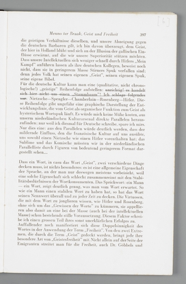 Auffallender noch manifestiert sich diese Doppelsinnigkeit des Wortes in der Anwendung der Term ‘Freiheit’. Von den zwei Extremen, die durch die Term ‘Geist’ gedeckt werden, bringt jede ihre besondere Art von ‘Geistesfreiheit’ mit. Nicht allein auf der Seite der Emigranten streitet man für die Freiheit, auch Dr. Göbbels und Alfred Rosenberg kokettieren in letzter Zeit mit diesem Begriff. Kokettieren? Es ist mehr als das: sie haben ihre ‘Freiheit’, die Freiheit macht einen entscheidenden Teil ihrer Lehre aus.