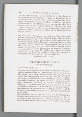 Für die deutsche Kultur kann man eine (qualitative, nicht chronologische!) ‘geistige’ Reihenfolge aufstellen, sozusagen eine in Persönlichkeiten symbolisierte Etymologie des Wortes ‘Geist’: Nietzsche - Spengler - Chamberlain - Rosenberg - Hitler. Diese Reihenfolge gibt ungefähr eine graphische Darstellung der Entwicklungslinie, die vom Geist als organischer Funktion zum Geist als hysterischem Wortspuk läuft. Es würde mich keine Mühe kosten, aus unserm niederländischen Kulturarsenal direkte Parallelen herauszufinden; nur weil ich diesmal für Deutsche schreibe, spare ich mirs. Nur dies eine: aus den Parallelen würde deutlich werden, dass der mildernde Einfluss, den die französische Kultur auf uns ausübte, uns sowohl einen Nietzsche wie einen Hitler vorenthalten hat; das Sublime und das Komische müssten wir in der niederländischen Parallelliste durch Figuren von bedeutend geringerem Format dargestellt sehen....