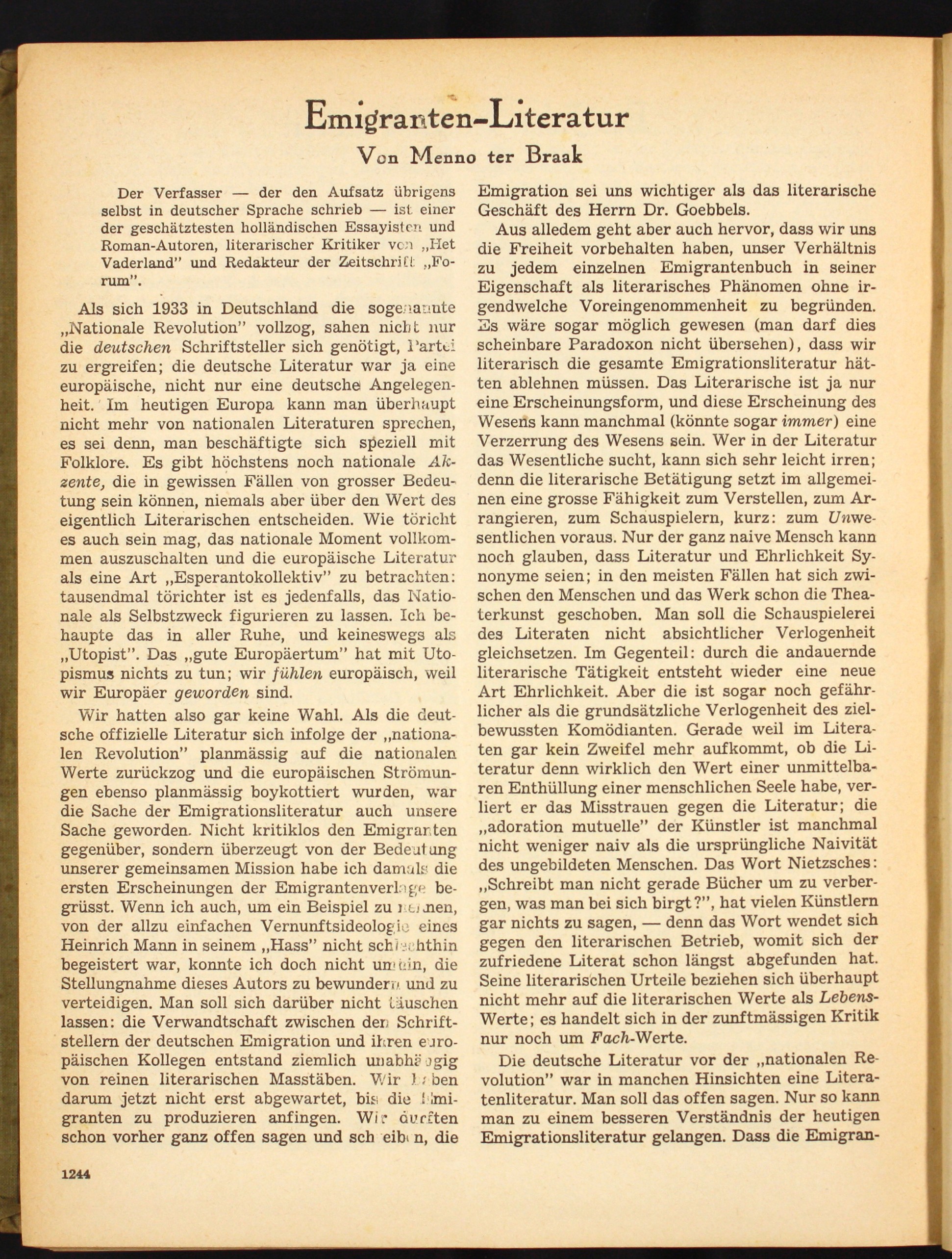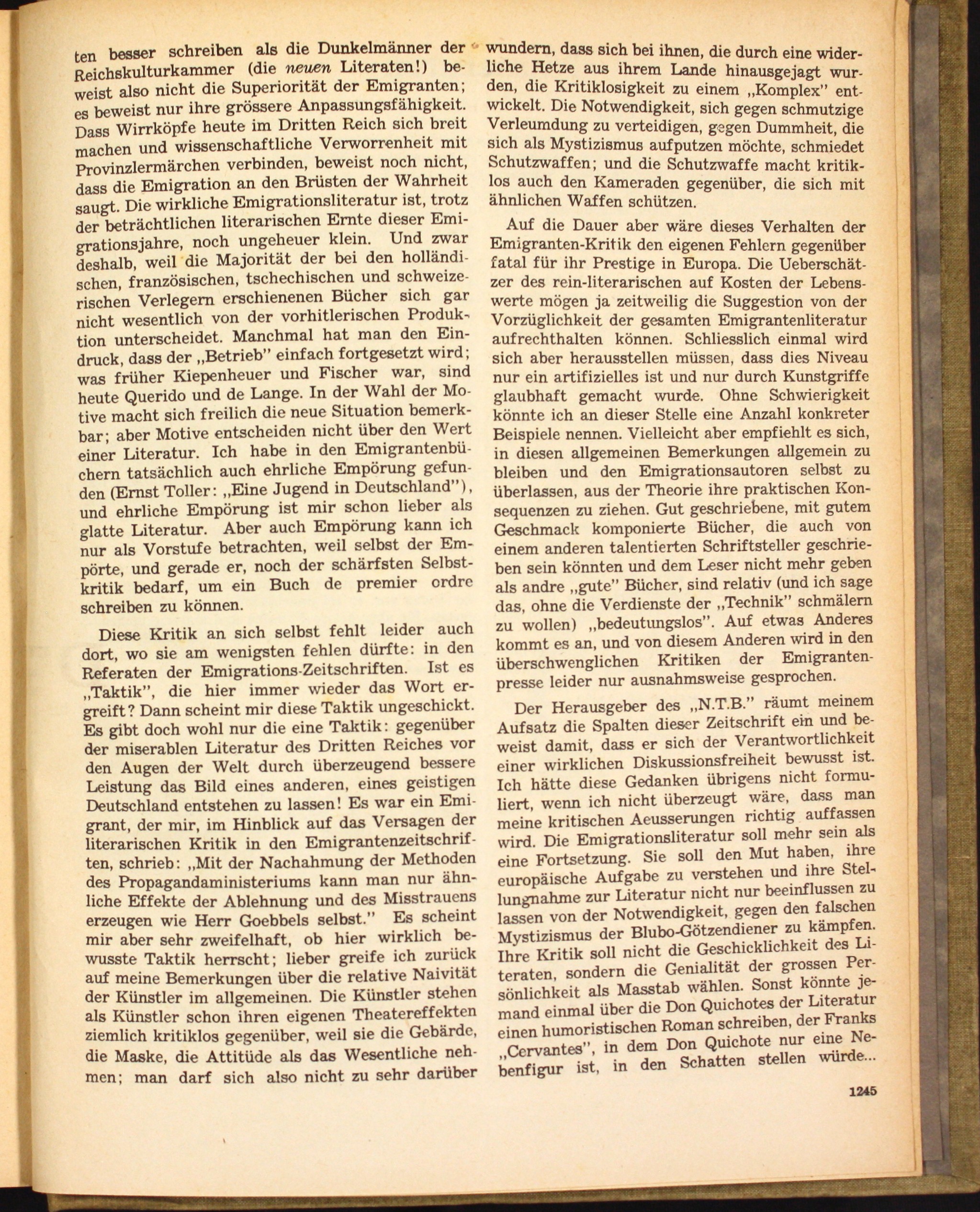 Der Herausgeber des ‘N.T.B.’ räumt meinem Aufsatz die Spalten dieser Zeitschrift ein und beweist damit, dass er sich der Verantwortlichkeit einer wirklichen Diskussionsfreiheit bewusst ist. Ich hätte diese Gedanken übrigens nicht formuliert, wenn ich nicht überzeugt wäre, dass man meine kritischen Aeusserungen richtig auffassen wird. Die Emigrationsliteratur soll mehr sein als eine Fortsetzung. Sie soll den Mut haben, ihre europäische Aufgabe zu verstenen und ihre Stellungnahme zur Literatur nicht nur beeinflussen zu lassen von der Notwendigkeit, gegen den falschen Mystizismus der Blubo-Götzendiener zu kämpfen. Ihre Kritik soll nicht die Geschicklichkeit des Literaten, sondern die Genialität der grossen Persönlichkeit als Masstab wählen. Sonst könnte jemand einmal über die Don Quichotes der Literatur inen humoristischen Roman schreiben, der Franks ‘Cervantes’, in dem Don Quichote nur eine Nebenfigur ist, in den Schatten stellen würde...