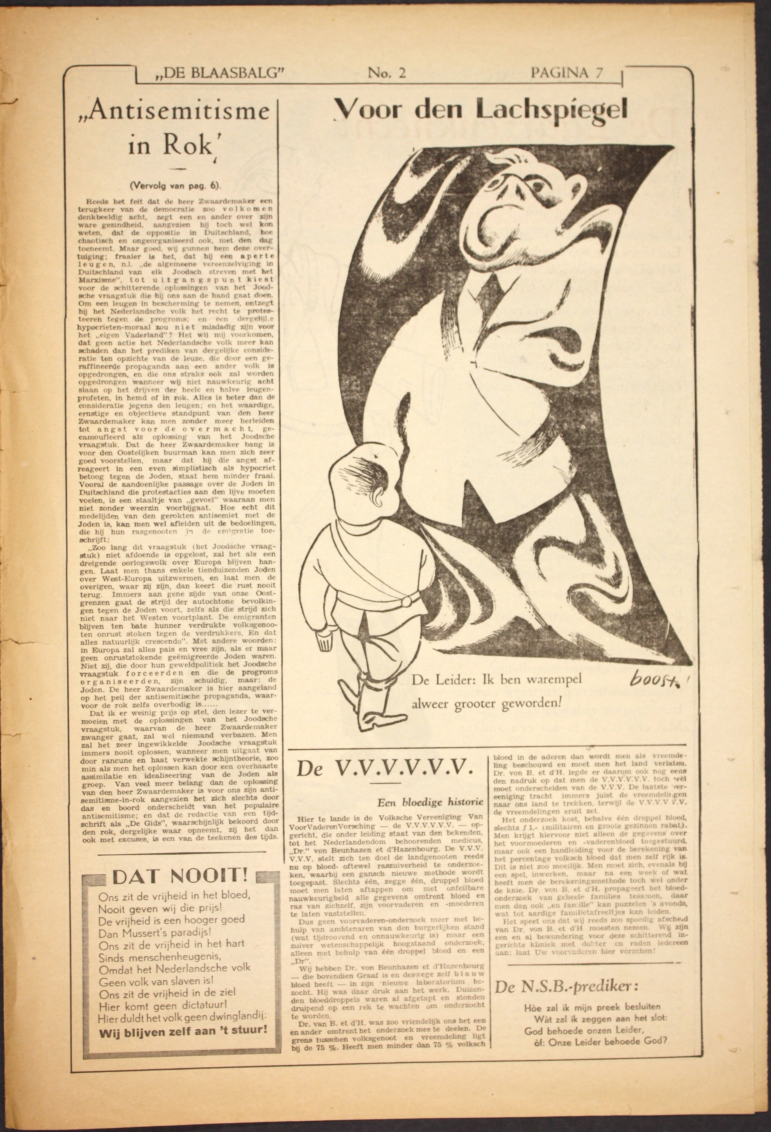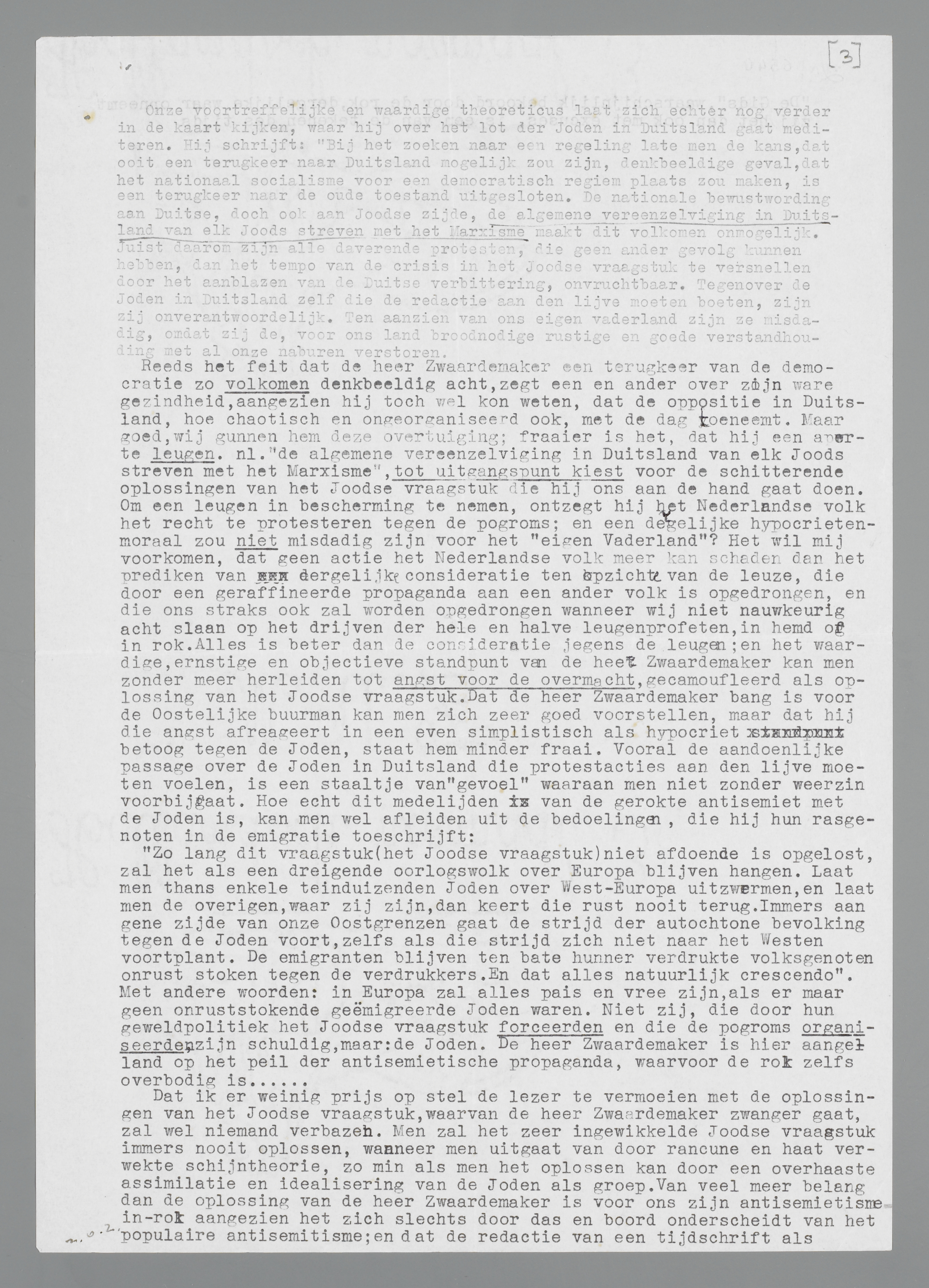 Reeds het feit dat de heer Zwaardemaker een terugkeer van de democratie zoo volkomen denkbeeldig acht, zegt een en ander over zijn ware gezindheid, aangezien hij toch wel kon weten, dat de oppositie in Duitschland, hoe chaotisch en ongeorganiseerd ook, met den dag toeneemt. Maar goed, wij gunnen hem deze overtuiging; fraaier is het, dat hij een aperte leugen, n.l. ‘de algemeene vereenzelviging in Duitschland van elk Joodsch streven met het Marxisme’, tot uitgangspunt kiest voor de schitterende oplossingen van het Joodsche vraagstuk die hij ons aan de hand gaat doen. Om een leugen in bescherming te nemen, ontzegt hij het Nederlandsche volk het recht te protesteeren tegen de progroms; en een dergelijke hypocrieten-moraal zou niet misdadig zijn voor het ‘eigen Vaderland’? Het wil mij voorkomen, dat geen actie het Nederlandsche volk meer kan schaden dan het prediken van dergelijke consideratie ten opzichte van de leuze, die door een geraffineerde propaganda aan een ander volk is opgedrongen, en die ons straks ook zal worden opgedrongen wanneer wij niet nauwkeurig acht slaan op het drijven der heele en halve leugenprofeten, in hemd of in rok. Alles is beter dan de consideratie jegens den leugen; en het waardige, ernstige en objectieve standpunt van den heer Zwaardemaker kan men zonder meer herleiden tot angst voor de overmacht, gecamoufleerd als oplossing van het Joodsche vraagstuk. Dat de heer Zwaardemaker bang is voor den Oostelijken buurman kan men zich zeer goed voorstellen, maar dat hij die angst afreageert in een even simplistisch als hypocriet betoog tegen de Joden, staat hem minder fraai. Vooral de aandoenlijke passage over de Joden in Duitschland die protestacties aan den lijve moeten voelen, is een staaltje van ‘gevoel’ waaraan men niet zonder weerzin voorbijgaat. Hoe echt dit medelijden van den gerokten antisemiet met de Joden is, kan men wel afleiden uit de bedoelingen, die hij hun rasgenooten in de emigratie toeschrijft: