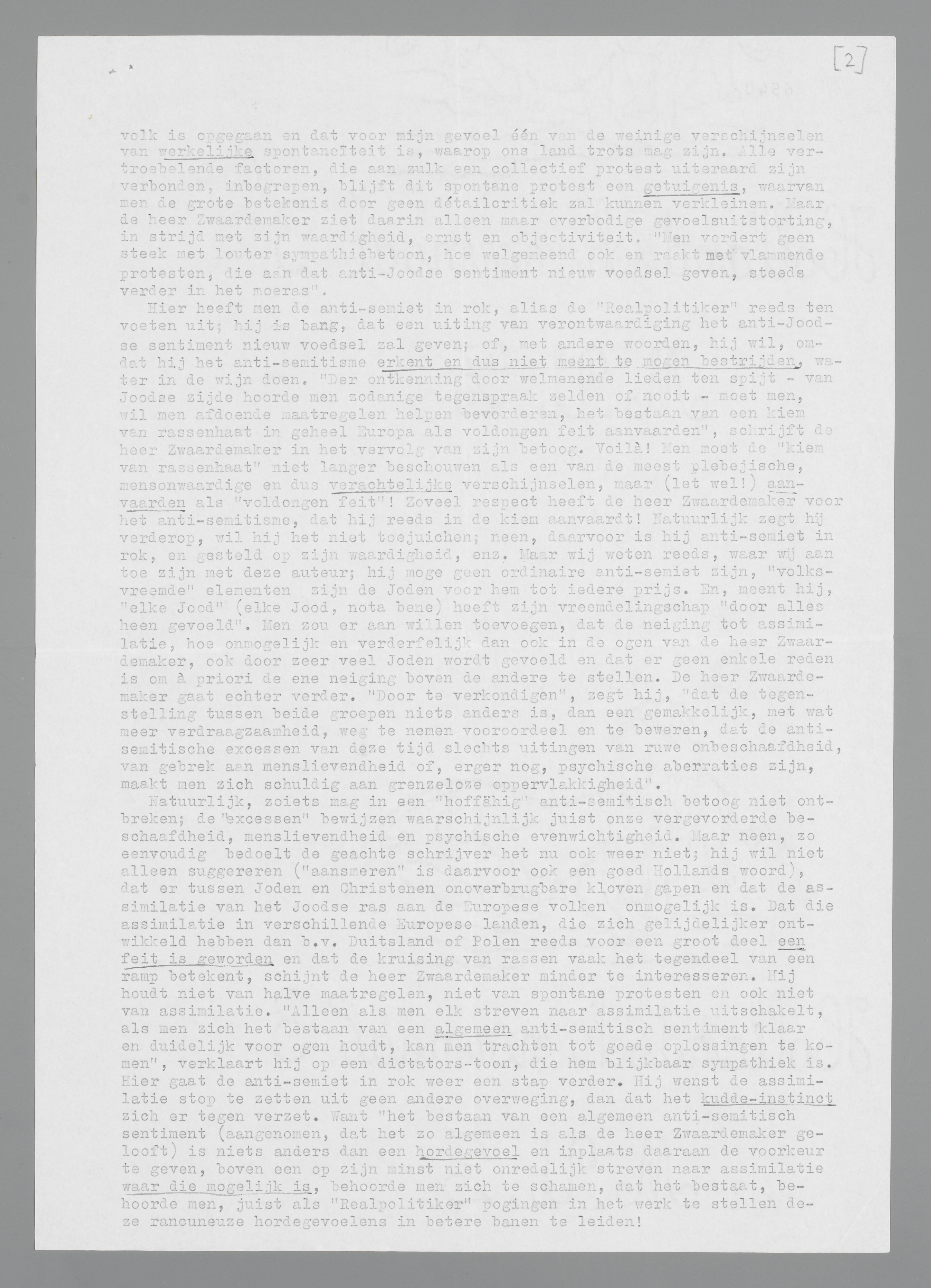 Hier heeft men den antisemiet in rok, alias den ‘Realpolitiker’ reeds ten voeten uit; hij is bang, dat een uiting van verontwaardiging het anti-Joodsche sentiment nieuw voedsel zal geven; of, met andere woorden, hij wil, omdat hij het antisemitisme erkent en dus niet meent te mogen bestrijden, water in den wijn doen. ‘Der ontkenning door welmeenende lieden ten spijt - van Joodsche zijde hoorde men zoodanige tegenspraak zelden of nooit - moet men, wil men afdoende maatregelen helpen bevorderen, het bestaan van een kiem van rassenhaat in geheel Europa als voldongen feit aanvaarden’, schrijft de heer Zwaardemaker in het vervolg van zijn betoog. Voilà! Men moet de ‘kiem van rassenhaat’ niet langer beschouwen als een van de meest plebejische, menschonwaardige en dus verachtelijke verschijnselen, maar (let wel!) aanvaarden als ‘voldongen feit’! Zooveel respect heeft de heer Zwaardemaker voor het antisemitisme, dat hij het reeds in den kiem aanvaardt! Natuurlijk zegt hij verderop, wil hij het niet toejuichen; neen, daarvoor is hij antisemiet in rok, en gesteld op zijn waardigheid enz. Maar wij weten reeds, waar wij aan toe zijn met dezen auteur; hij moge geen ordinaire antisemiet zijn, ‘volksvreemde’ elementen zijn de Joden voor hem tot iederen prijs. En, meent hij, ‘elke Jood’ (elke Jood, nota bene) heeft zijn vreemdelingschap ‘door alles heen gevoeld’. Men zou er aan willen toevoegen, dat de neiging tot assimilatie, hoe onmogelijk en verderfelijk dan ook in de oogen van den heer Zwaardemaker, ook door zeer veel Joden wordt gevoeld, en dat er geen enkele reden is om à priori de eene neiging boven de andere te stellen. De heer Zwaardemaker gaat echter verder.