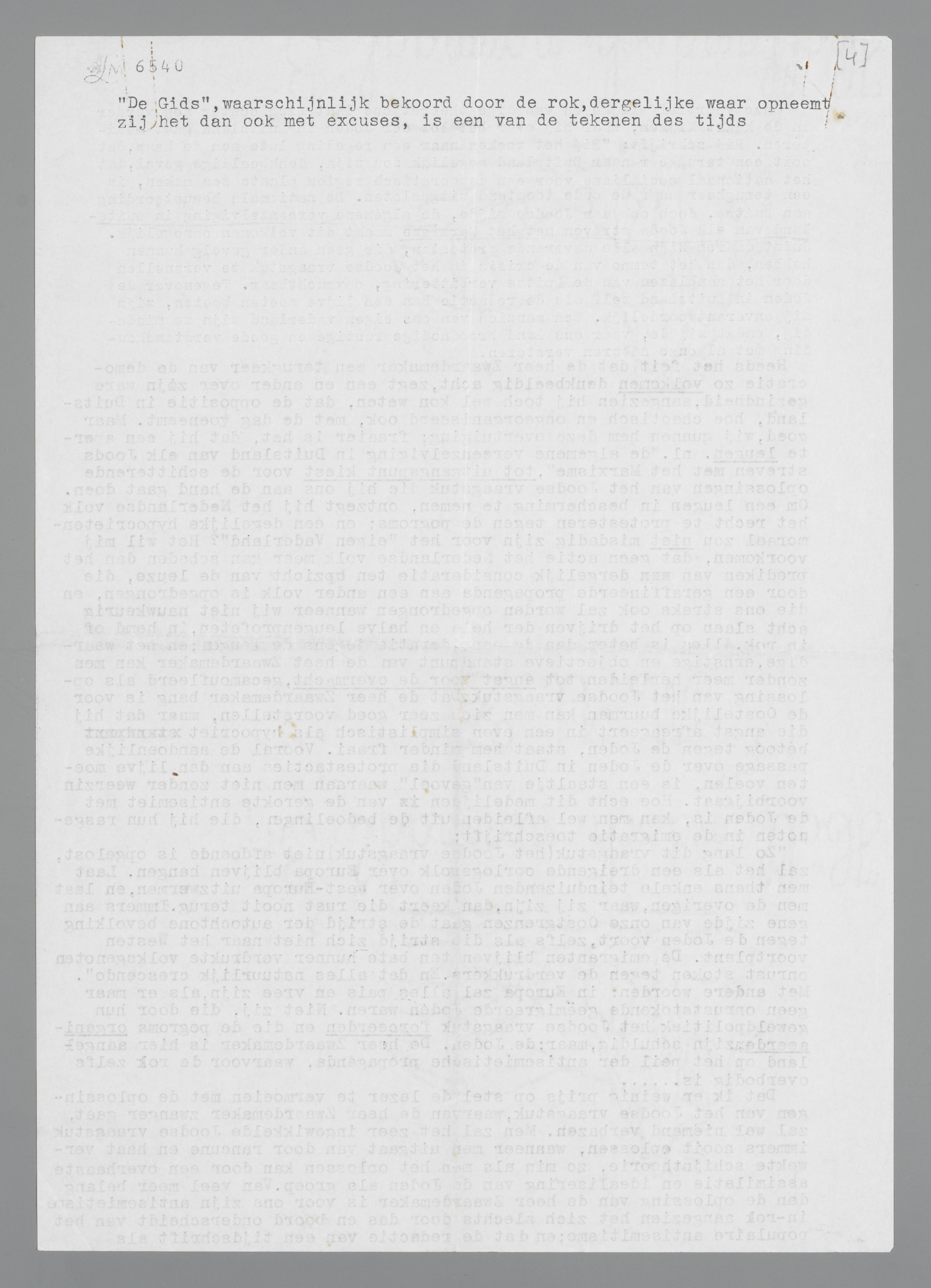Dat ik er weinig prijs op stel, den lezer te vermoeien met de oplossingen van het Joodsche vraagstuk, waarvan de heer Zwaardemaker zwanger gaat, zal wel niemand verbazen. Men zal het zeer ingewikkelde Joodsche vraagstuk immers nooit oplossen, wanneer men uitgaat van door rancune en haat verwekte schijntheorie, zoo min als men het oplossen kan door een overhaaste assimilatie en idealiseering van de Joden als groep. Van veel meer belang dan de oplossing van den heer Zwaardemaker is voor ons zijn antisemitisme-in-rok aangezien het zich slechts door das en boord onderscheidt van het populaire, antisemitisme; en dat de redactie van een tijdschrift als ‘De Gids’, waarschijnlijk bekoord door den rok, dergelijke waar opneemt, zij het dan ook met excuses, is een van de teekenen des tijds.