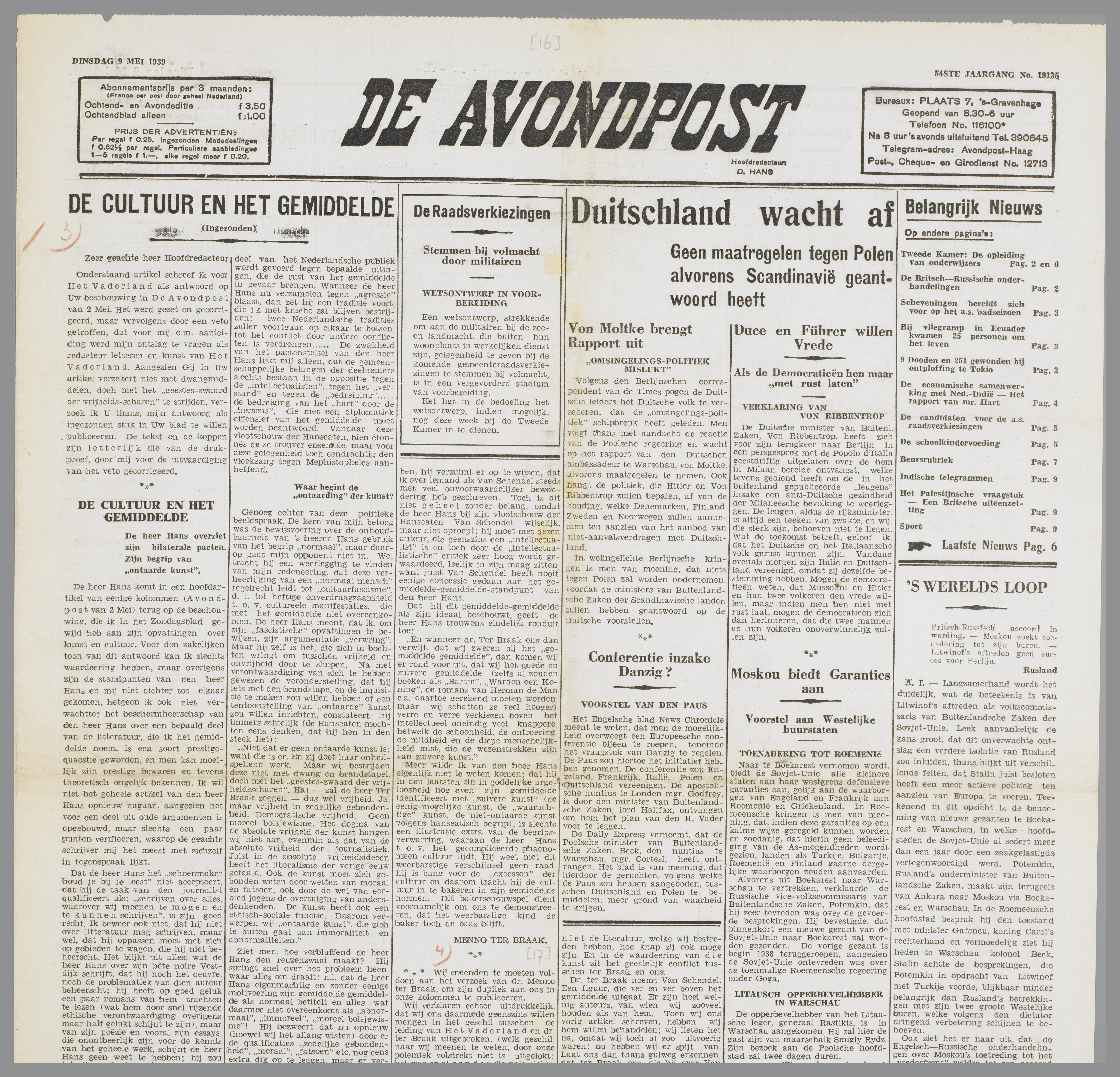 De heer Hans komt in een hoofdartikel van eenige kolommen (Avondpost van 2 Mei) terug op de beschouwing, die ik in het Zondagsblad gewijd heb aan zijn opvattingen over kunst en cultuur. Voor den zakelijken toon van dit antwoord kan ik slechts waardeering hebben, maar overigens zijn de standpunten van den heer Hans en mij niet dichter tot elkaar gekomen, het geen ik ook niet verwachtte; het beschermheerschap van den heer Hans over een bepaald deel van de litteratuur, die ik het gemiddelde noem, is een soort prestigequaestie geworden, en men kan moeilijk zijn prestige bewaren en tevens theoretisch ongelijk bekennen. Ik wil niet het geheele artikel van den heer Hans opnieuw nagaan, aangezien het voor een deel uit oude argumenten is opgebouwd, maar slechts een paar punten verifieeren, waarop de geachte schrijver mij het meest met zichzelf in tegenspraak lijkt.