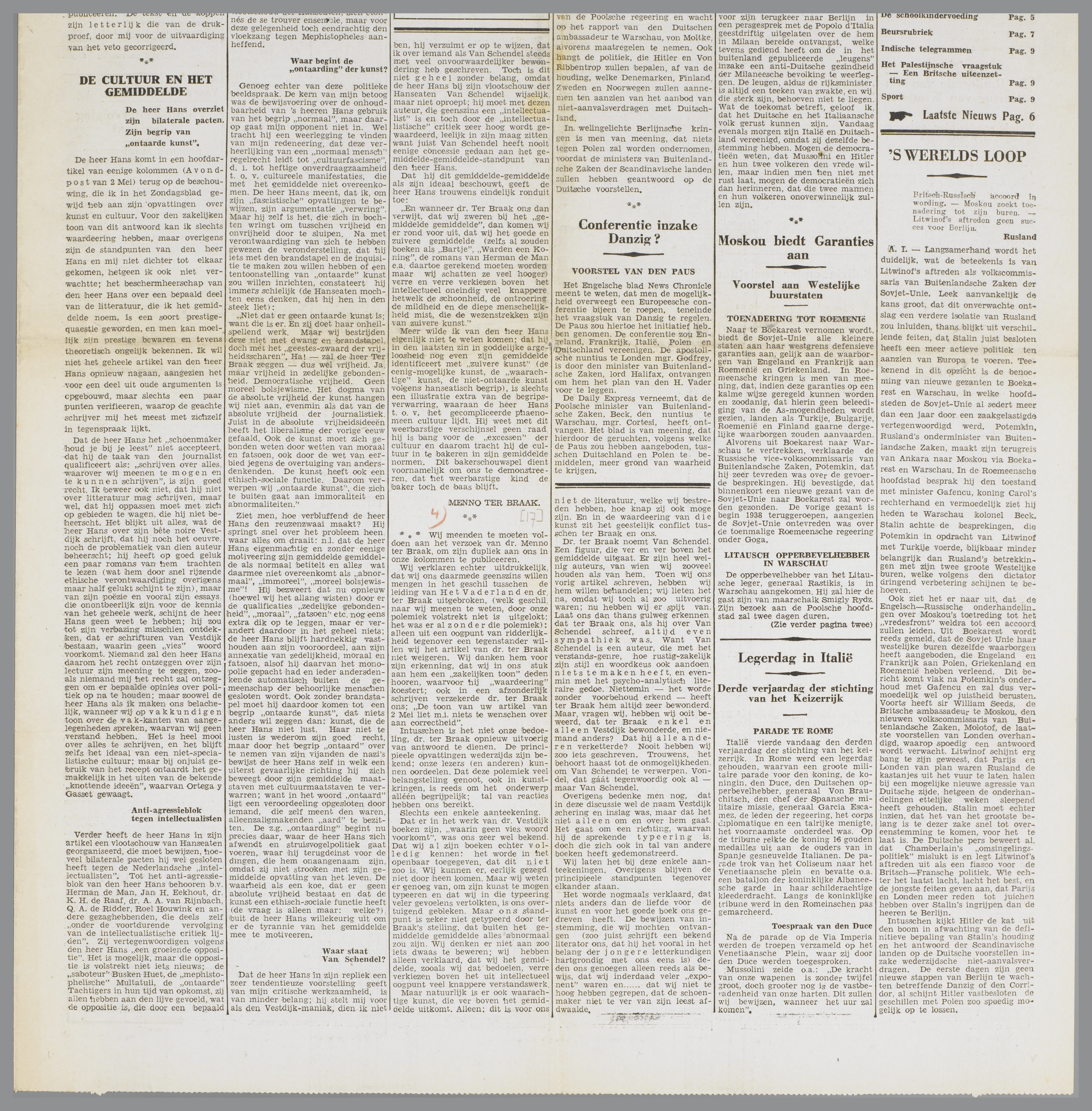 Ziet men, hoe verbluffend de heer Hans den reuzenzwaai maakt? Hij springt snel over het probleem heen waar alles om draait: n.l. dat de heer Hans eigenmachtig en zonder eenige motiveering zijn gemiddelde gemiddelde als normaal betitelt en alles wat daarmee niet overeenkomt als ‘abnormall’, ‘immoreel’, ‘moreel bolsjewisme’! Hij bezweert dat nu opnieuw (hoewel wij het allang wisten) door er de qualificaties ‘zedelijke gebondenheid’, ‘moraal’, ‘fatsoen’ etc. nog eens extra dik op te leggen, maar er verandert daardoor in het geheel niets; de heer Hans blijft hardnekkig vasthouden aan zijn vooroordeel, aan zijn annexatie van zedelijkheid, moraal en fatsoen, alsof hij daarvan het monopolie gepacht had en ieder andersdenkende automatisch buiten de gemeenschap der behoorlijke menschen gesloten wordt. Ook zonder brandstapel moet hij daardoor komen tot een begrip ‘ontaarde kunst’, dat niets anders wil zeggen dan: kunst, die de heer Hans niet lust. Haar niet te lusten is wederom zijn goed recht, maar door het begrip ‘ontaard’ over te nemen van zijn vijanden de nazi's bewijst de heer Hans zelf in welk een uiterst gevaarlijke richting hij zich beweegt door zijn gemiddelde maatstaven met cultuurmaatstaven te verwarren; want in het woord ‘ontaard’ ligt een veroordeeling opgesloten door iemand, die zelf meent den waren, alleenzaligmakenden ‘aard’ te bezitten. De z.g. ‘ontaarding’ begint nu precies daar, waar de heer Hans zich afwendt en struisvogelpolitiek gaat voeren, waar hij terugdeinst voor de dingen, die hem onaangenaam zijn, omdat zij niet strooken met zijn gemiddelde opvatting van het leven. De waarheid als een koe, dat er geen absolute vrijheid bestaat en dat de kunst een ethisch-sociale functie heeft (de vraag is allen maar: welke?) buit de heer Hans willekeurig uit om er de tyrannie van het gemiddelde mee te motiveeren.