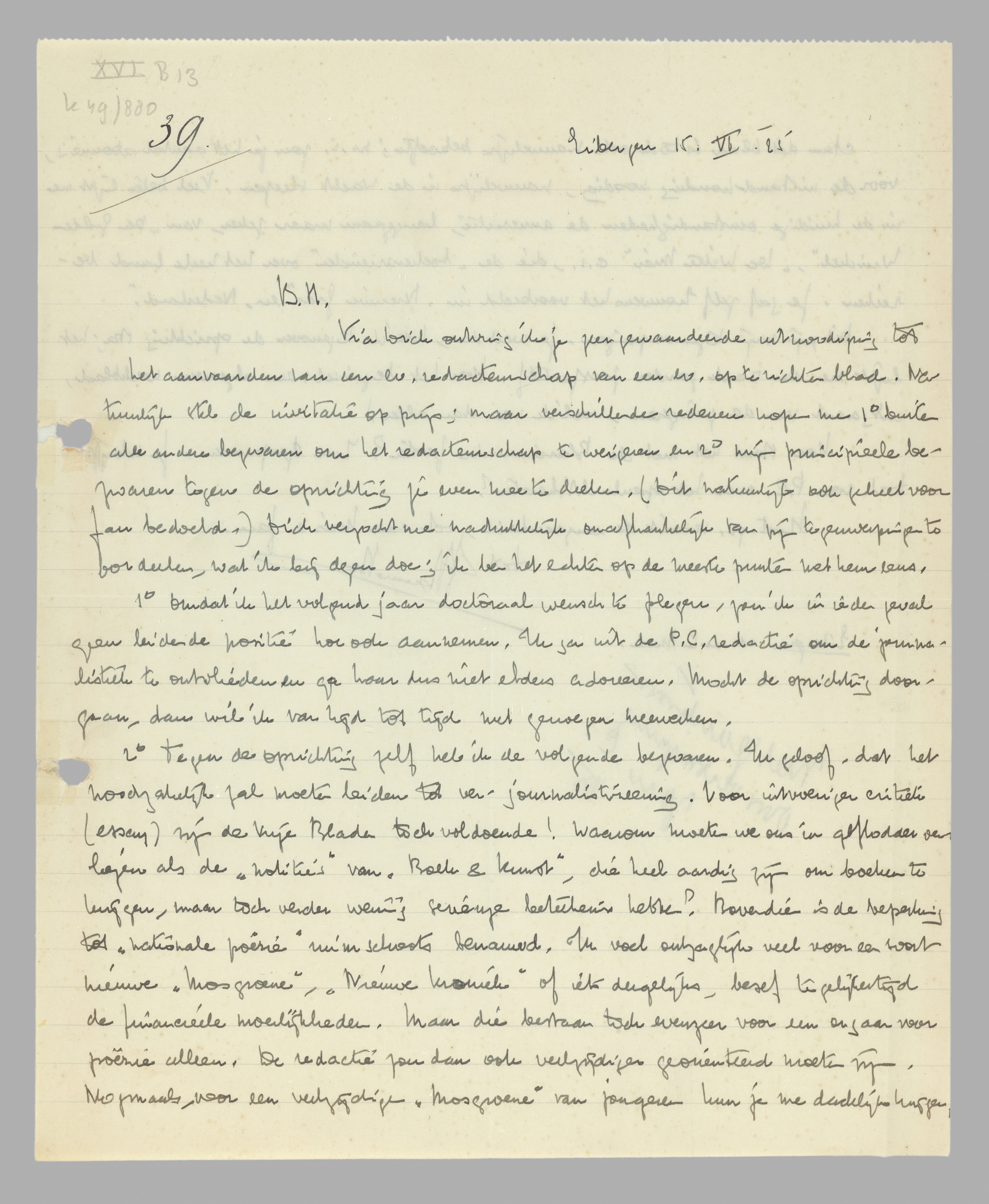 2o Tegen de oprichting zelf heb ik de volgende bezwaren. Ik geloof, dat het noodzakelijk zal moeten leiden tot ver-journalistizeering. Voor uitvoerigen critiek (essay) zijn de Vrije Bladen toch voldoende! Waarom moeten we ons in geflodder verliezen als de ‘notities’ van ‘Boek & Kunst’, die heel aardig zijn om boeken te krijgen, maar toch verder weinig serieuze beteekenis hebben? Bovendien is de beperking tot ‘nationale poëzie’ ruimschoots benauwd. Ik voel ontzaglijk veel voor een soort nieuwe ‘Mosgroene’, ‘Nieuwe Kroniek’ of iets dergelijks, besef tegelijkertijd de financieele moeilijkheden. Maar die bestaan toch evenzeer voor een orgaan voor poëzie alleen. De redactie zou dan ook veelzijdiger georienteerd moeten zijn. Nogmaals, voor een veelzijdige ‘Mosgroene’ van jongeren kun je me dadelijk krijgen.