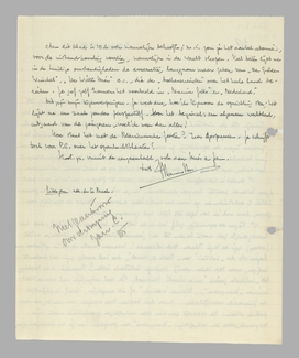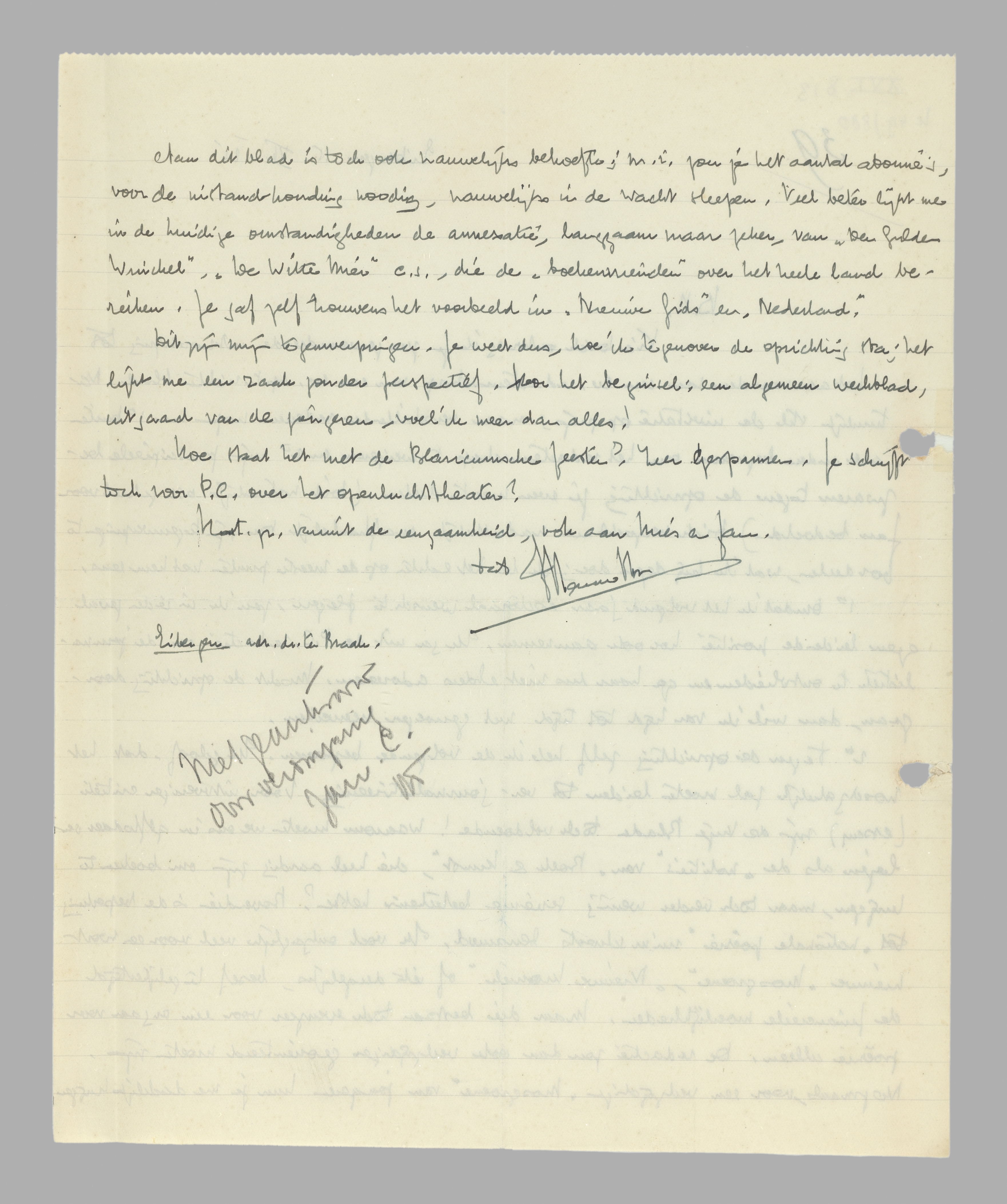 1o Omdat ik het volgend jaar doctoraal wensch te plegen, zou ik in ieder geval geen leidende positie hoe ook aannemen. Ik ga uit de P.C.redactie om de journalistiek te ontvlieden en ga haar dus niet elders adoreeren. Mocht de oprichting doorgaan, dan wil ik van tijd tot tijd met genoegen meewerken.