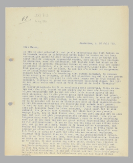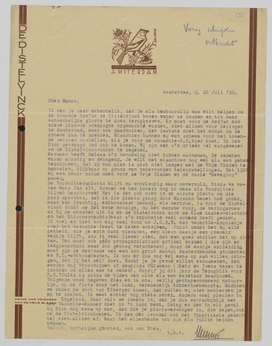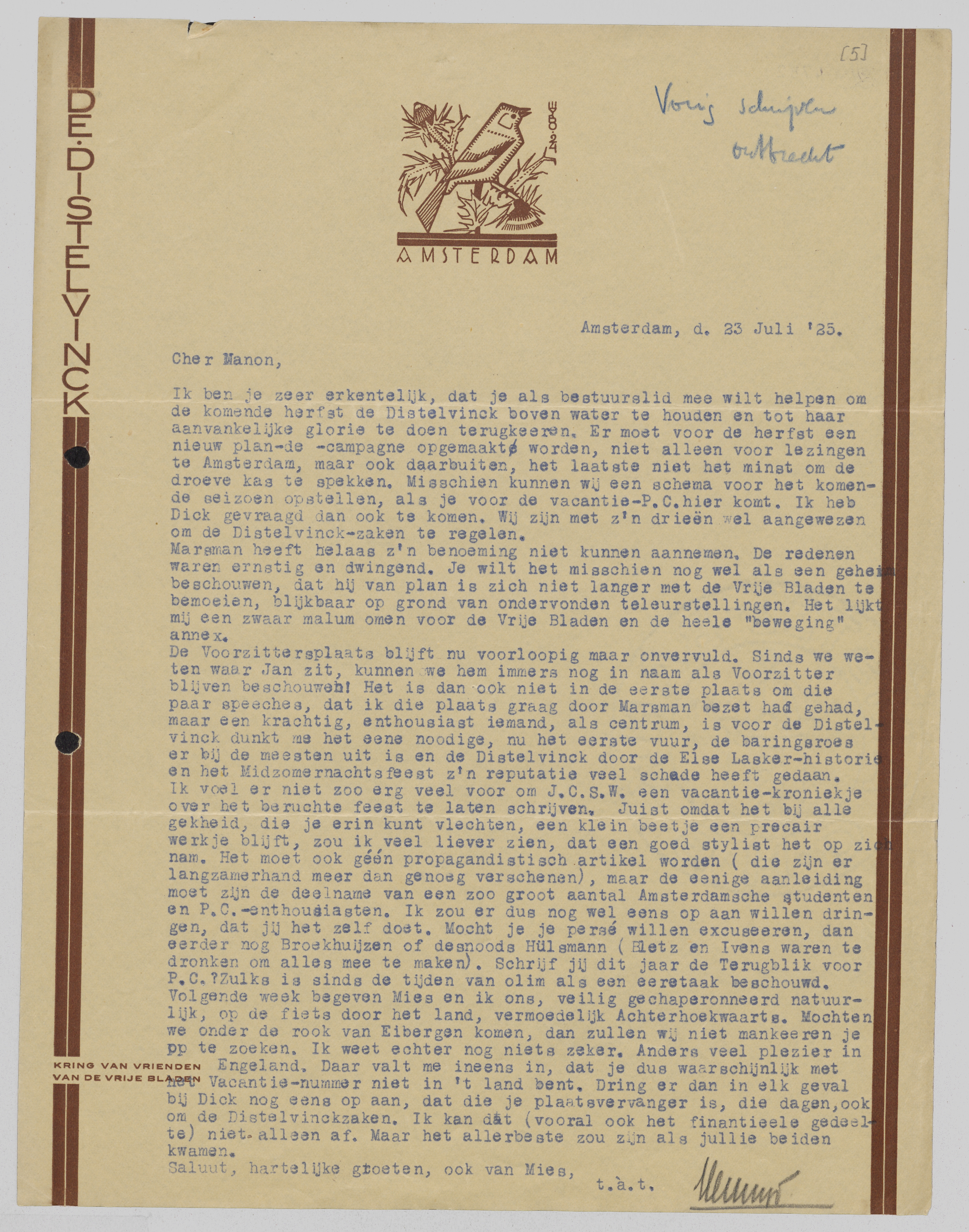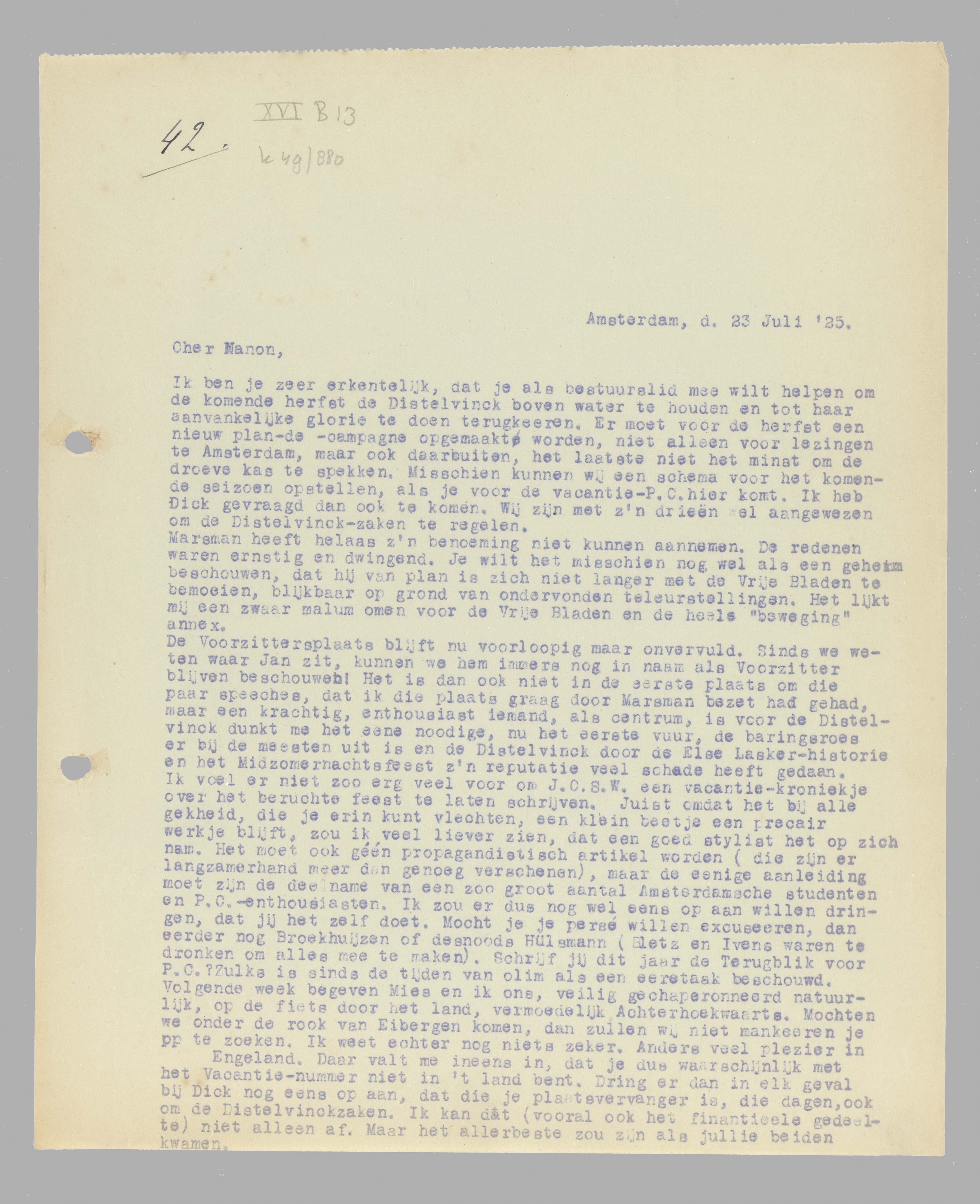 Ik ben je zeer erkentelijk, dat je als bestuurslid mee wilt helpen om de komende herfst de Distelvinck boven water te houden en tot haar aanvankelijke glorie te doen terugkeeren. Er moet voor de herfst een nieuw plan-de-campagne opgemaakt worden, niet alleen voor lezingen te Amsterdam, maar ook daarbuiten, het laatste niet het minst om de droeve kas te spekken. Misschien kunnen wij een schema voor het komende seizoen opstellen, als je voor de vacantie-P.C. hier komt. Ik heb Dick gevraagd dan ook te komen. Wij zijn met z'n drieën wel aangewezen om de Distelvinck-zaken te regelen.
