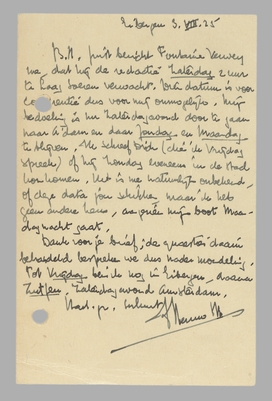 Juist bericht Fontaine Verwey me, dat hij de redactie Zaterdag 2 uur te Laag Soeren verwacht. Dien datum is voor co[nfe]rentie dus voor mij onmogelijk. Mijn bedoeling is nu Zaterdagavond door te gaan naar A'dam en daar Zondag en Maandag te blijven. Ik schreef Dick (die ik Vrijdag spreek) of hij Zondag eveneens in de stad kon komen. Het is me natuurlijk onbekend, of deze data jou schikken, maar ik heb geen andere keus, aangezien mijn boot Maandagnacht gaat.