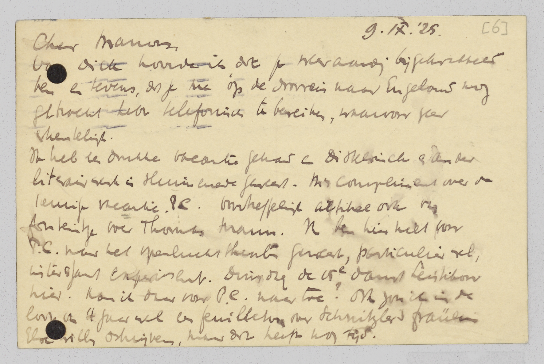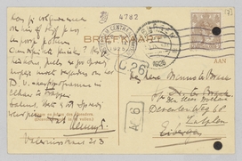 Ik heb een drukke vacantie gehad en distelvinck en ander literair werk is sluimerende geweest. M'n compliment over de keurige redactie P.C. Voortreffelijk artikel ook van Fonteintje over Thomas Mann. Ik ben hier niet voor P.C. naar het openluchttheater geweest, particulier wel, [interessant] experiment. Dinsdag de 15e danst Leistikow hier. Kan ik daar voor P.C. naar toe? Ook zou ik in de loop van 't jaar wel een feuilleton over Schnitzlers Fraülein Else willen schrijven, maar dat heeft nog tijd.