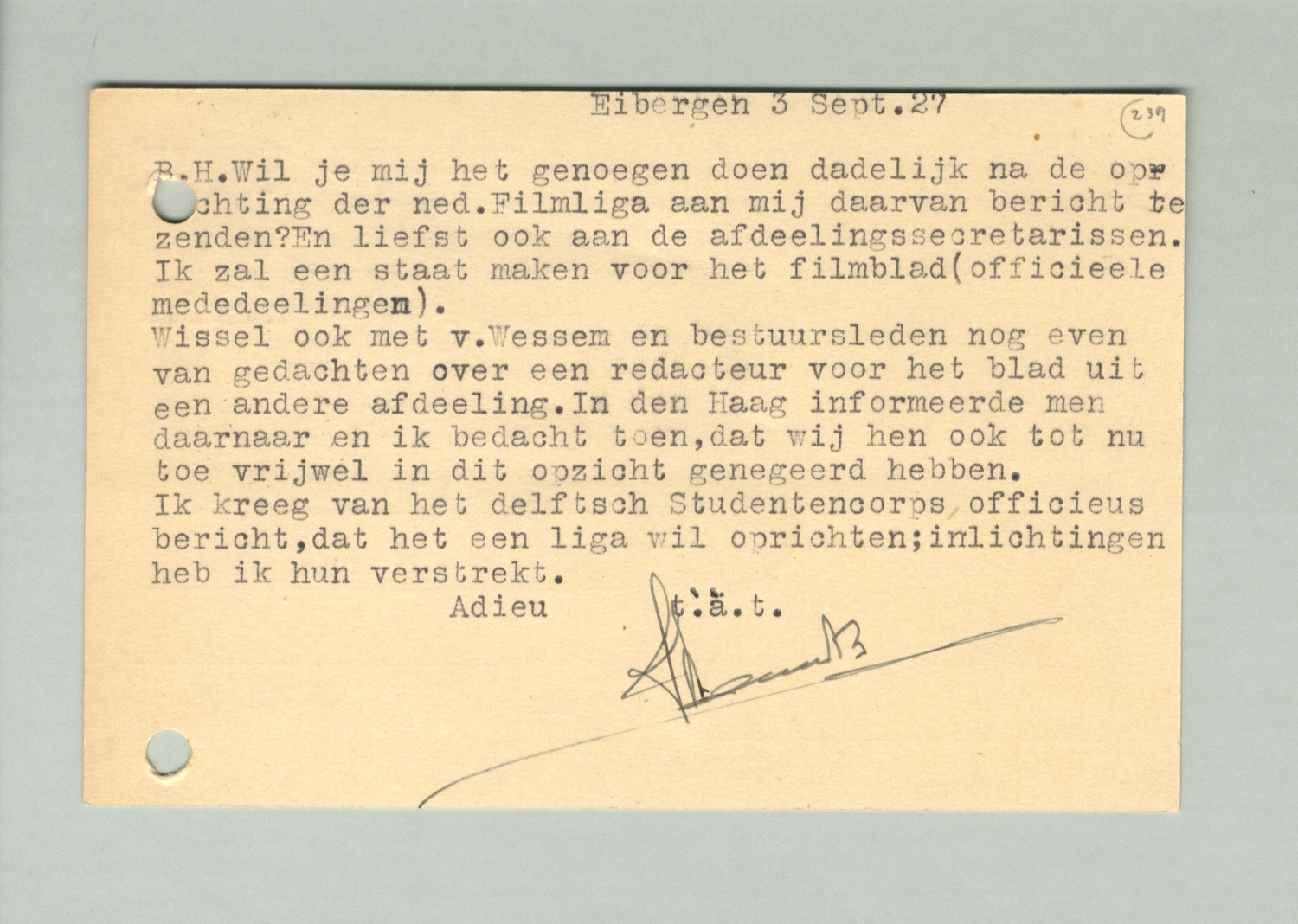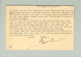 Wil je mij het genoegen doen dadelijk na de oprichting der ned. Filmliga aan mij daarvan bericht te zenden? En liefst ook aan de afdeelingssecretarissen. Ik zal een staat maken voor het filmblad (officieele mededeelingen).