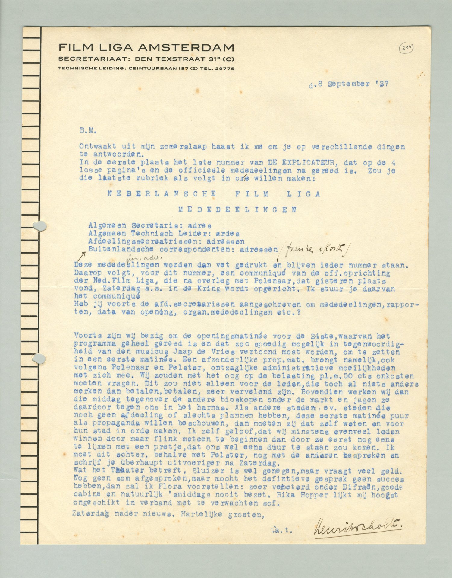 Voorts zijn wij bezig om de openingsmatinee voor de 24ste, waarvan het programma geheel gereed is en dat zoo spoedig mogelijk in tegenwoordigheid van den musicus Jaap de Vries vertoond moet worden, om te zetten in een eerste matinée. Een afzonderlijke prop.mat. brengt namelijk, ook volgens Polenaar en Pelster, ontzaglijke administratieve moeilijkheden met zich mee. Wij zouden met het oog op de belasting pl.m. 50 cts onkosten moeten vragen. Dit zou niet alleen voor de leden, die toch al niets anders merken dan betalen, betalen, zeer vervelend zijn. Bovendien werken wij dan die middag tegenover de andere bioskopen onder de markt en jagen ze daardoor tegen ons in het harnas. Als andere steden, ev. steden die noch geen afdeeling of slechts plannen hebben, deze eerste matinée puur als propaganda willen beschouwen, dan moeten zij dat zelf weten en voor hun stad in orde maken. Ik zelf geloof, dat wij minstens evenveel leden winnen door maar flink meteen te beginnen dan door ze eerst nog eens te lijmen met een pretje, dat ons wel eens duur te staan zou komen. Ik moet dit echter, behalve met Pelster, nog met de anderen bespreken en schrijf je überhaupt uitvoeriger na Zaterdag.
