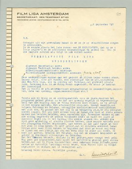 Deze mededeelingen (jur.adv.) worden dan vet gedrukt en blijven ieder nummer staan. Daarop volgt, voor dit nummer, een communiqué van de off. oprichting der Ned. Film Liga, die na overleg met Polenaar, dat gisteren plaats vond, Zaterdag a.s. in de kring wordt opgericht. Ik stuur je daarvan het communiqué.