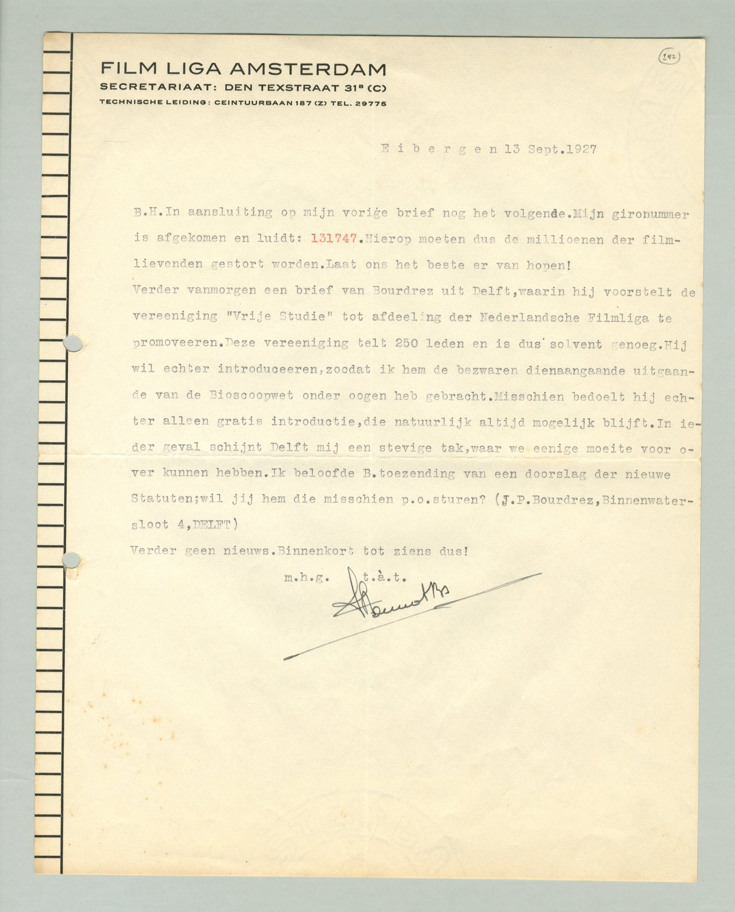 In aansluiting op mijn vorige brief nog het volgende. Mijn gironummer is afgekomen en luidt: 131747. Hierop moeten dus de millioenen der filmlievenden gestort worden. Laat ons het beste er van hopen!
