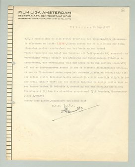 Verder vanmorgen een brief van Bourdrez uit Delft, waarin hij voorstelt de vereeniging ‘Vrije Studie’ tot afdeeling der Nederlandsche Filmliga te promoveeren. Deze vereeniging telt 250 leden en is dus solvent genoeg. Hij wil echter introduceeren, zoodat ik hem de bezwaren dienaangaande uitgaande van de Bioscoopwet onder oogen heb gebracht. Misschien bedoelt hij echter alleen gratis introductie, die natuurlijk altijd mogelijk blijft. In ieder geval schijnt Delft mij een stevige tak, waar we eenige moeite voor over kunnen hebben. Ik beloofde B. toezending van een doorslag der nieuwe Statuten; wil jij hem die misschien p.o. sturen? (J.P. Bourdrez, Binnenwatersloot 4, Delft)